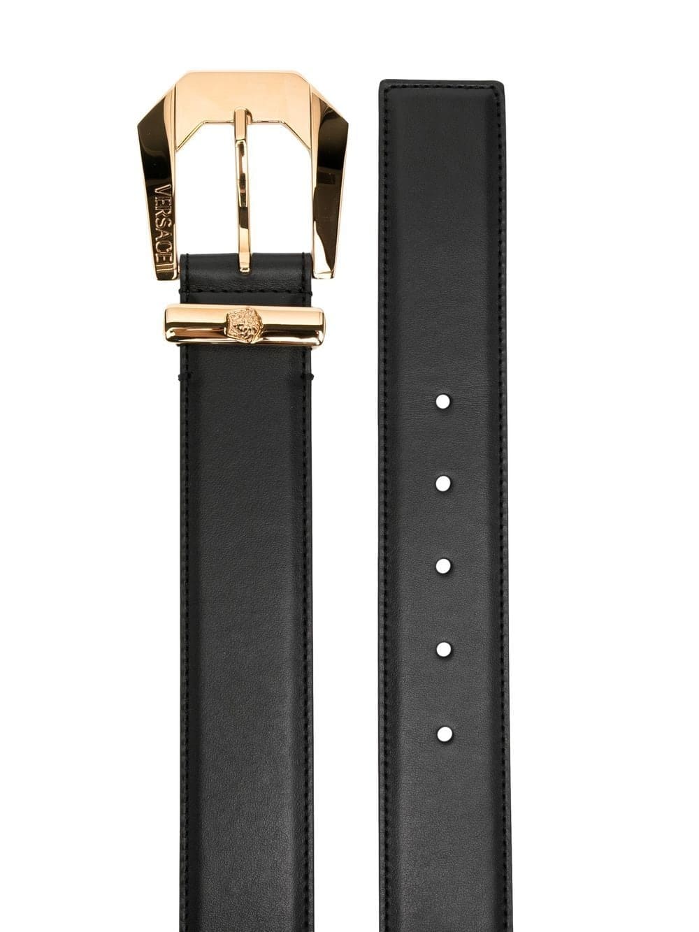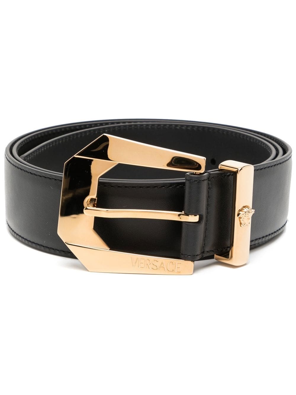 black calf leather signature Greca detailing gold-tone buckle fastening punched holes adjustable fit