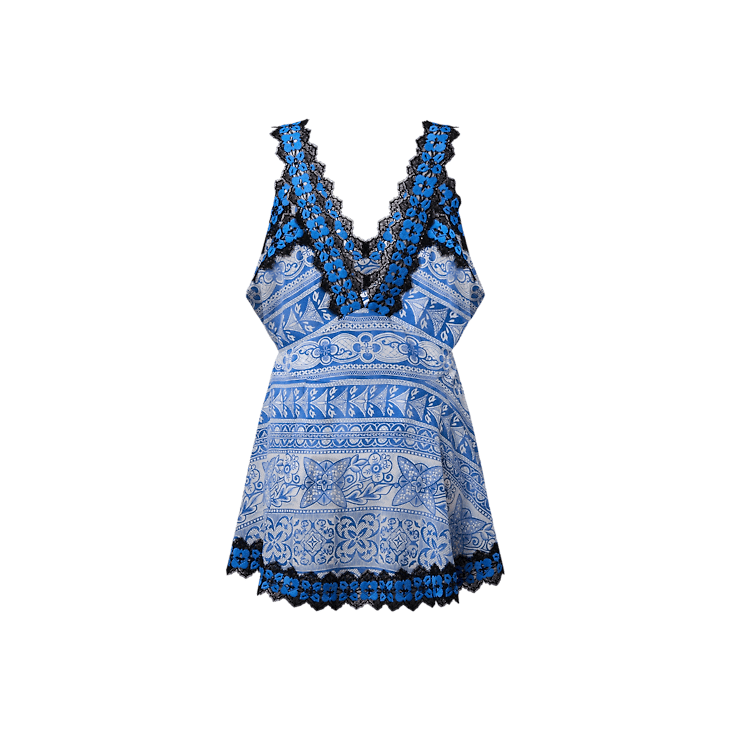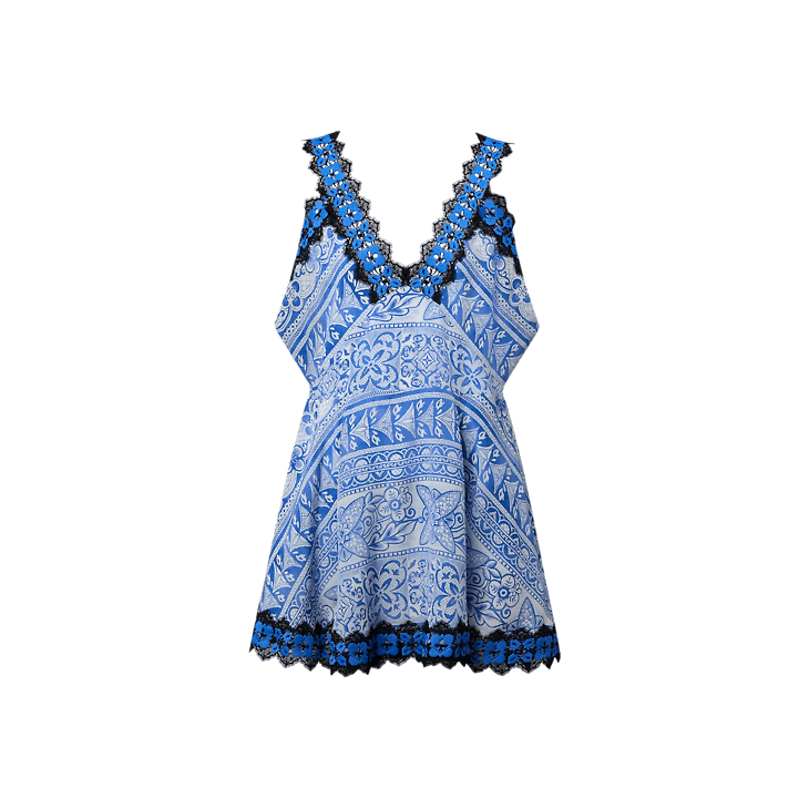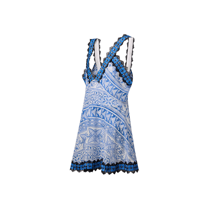 This mini dress has easy summer appeal in airy silk crepe de chine featuring an allover print of this season’s Monogram tile motif, which reimagines iconic House signatures in a geometric pattern for a fresh, graphic look. The feminine V-neck silhouette is trimmed with contrasting lace for a romantic lingerie look.
