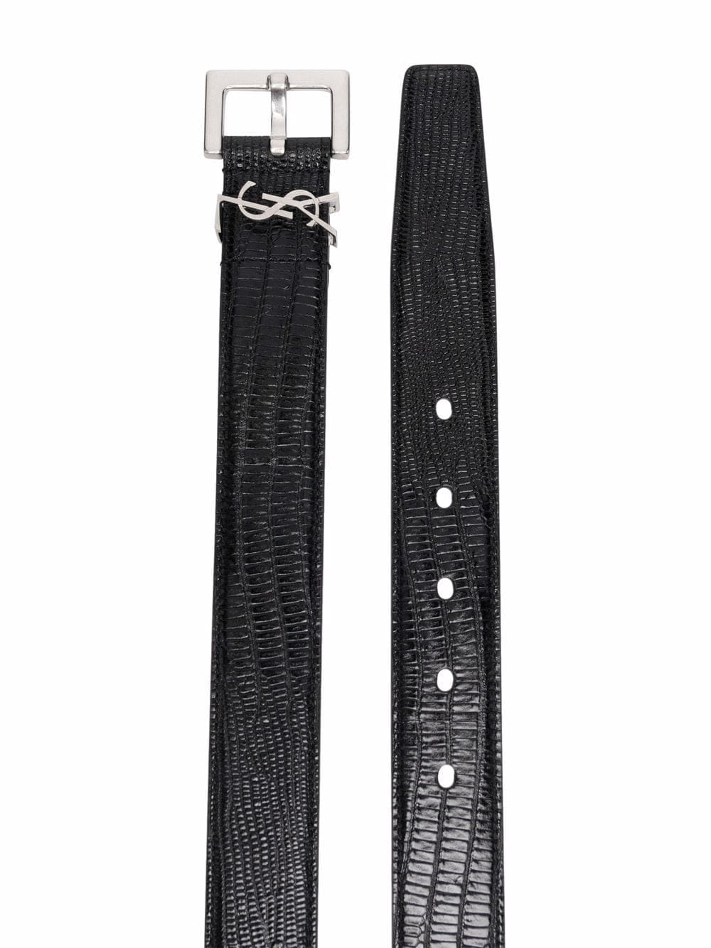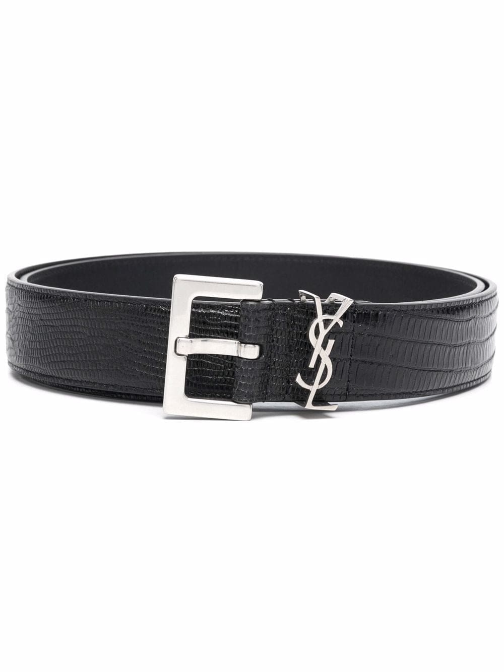 black calf leather embossed crocodile effect signature YSL logo plaque buckle fastening silver-tone hardware punched holes adjustable fit