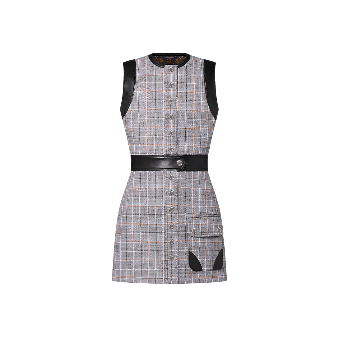 This elegant A-line dress is crafted from a cotton-wool blend in a check motif that nods to classic menswear tailoring, while sleek leather trimming introduces a graphic play of texture and a buttoned flap pocket adds a structured detail to the skirt. Fastened with the House’s signature Clous snap buttons and lined with Monogram silk.
