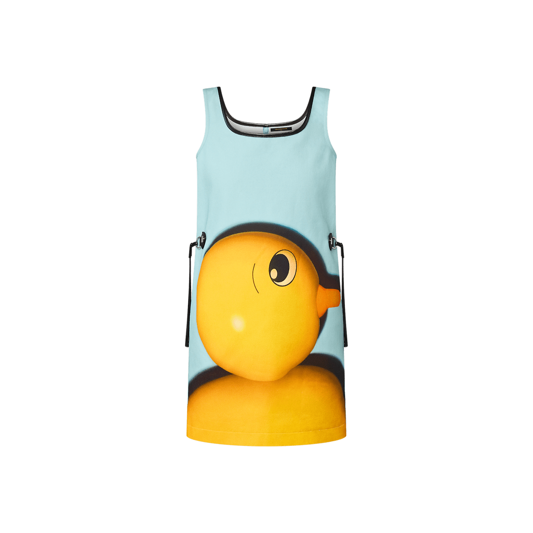 This dress is vibrantly uplifted with a statement Duck print from the Come Play with Me capsule, an exclusive collaboration between Nicolas Ghesquière and Chinese artist Sun Yitian. Crafted in a streamlined silhouette from structured cotton gabardine, the square neckline is trimmed with leather piping for a graphic look, while adjustable leather pull details at the waistline nod to emblematic detailing on the Neverfull handbag.
