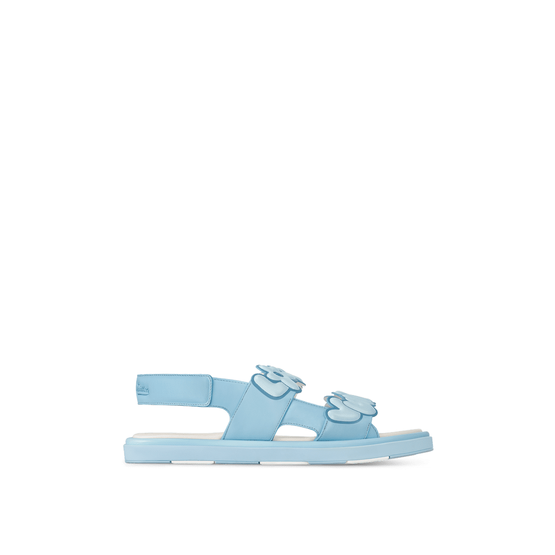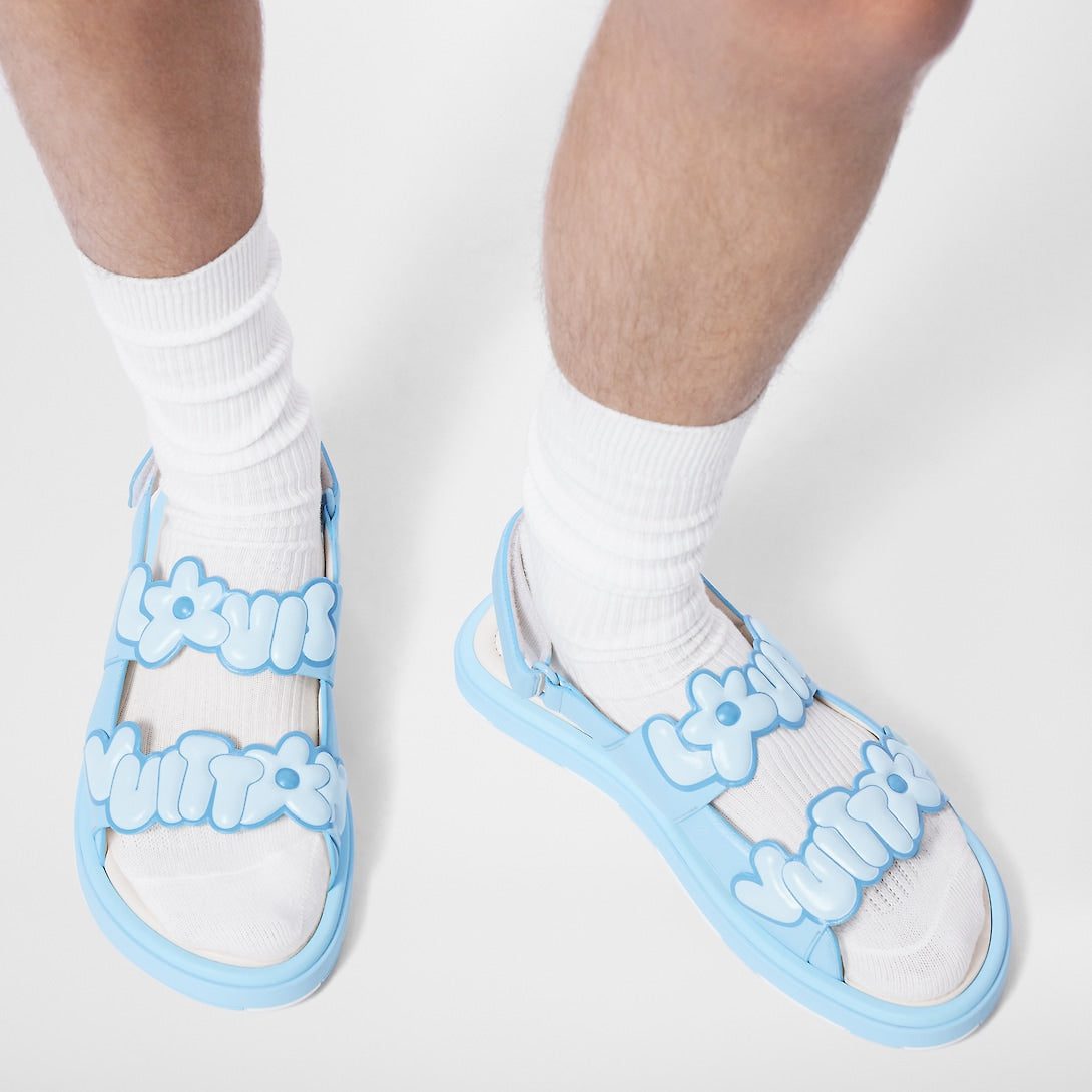 The LV Flower sandal belongs to a capsule including leather goods and accessories which was co-designed with Tyler. It comes in calf leather and features an oversized Louis Vuitton signature playfully redesigned by Tyler. The adjustable back strap is embossed with the Louis Vuitton script signature, which is also present on the rubber outsole.