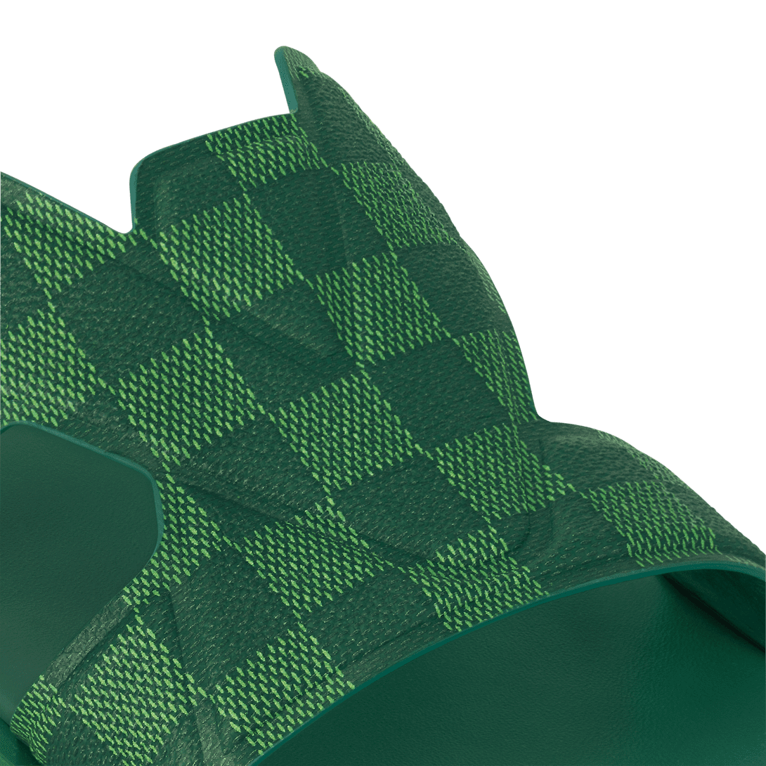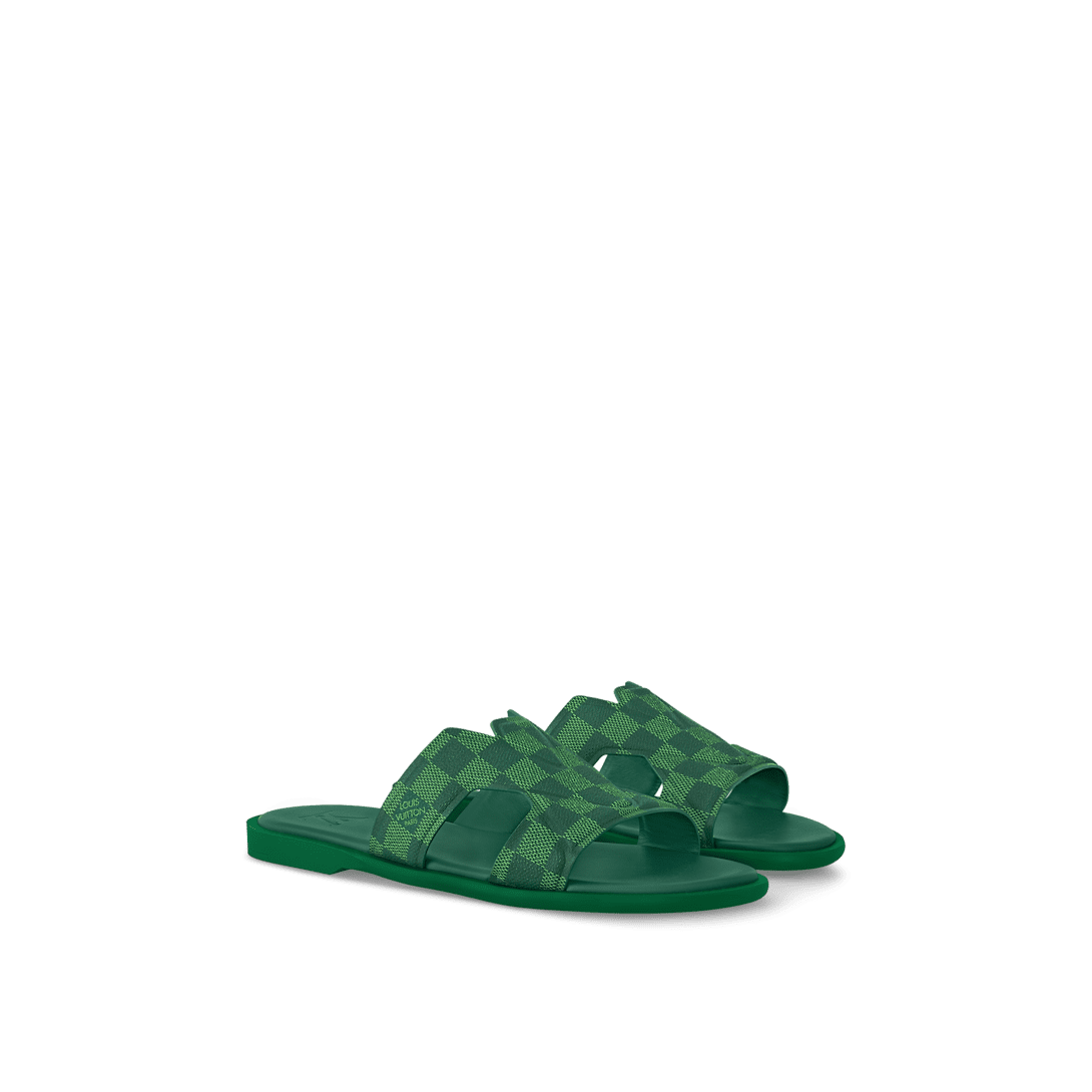 This version of the LV Oasis mule comes in grained calf leather, which replicates the appearance of Louis Vuitton's signature Damier canvas. The brightly colored upper is complemented by a tonal outsole in supple, lightweight rubber. This model is distinguished by the interlaced LV motif which connects its two straps.