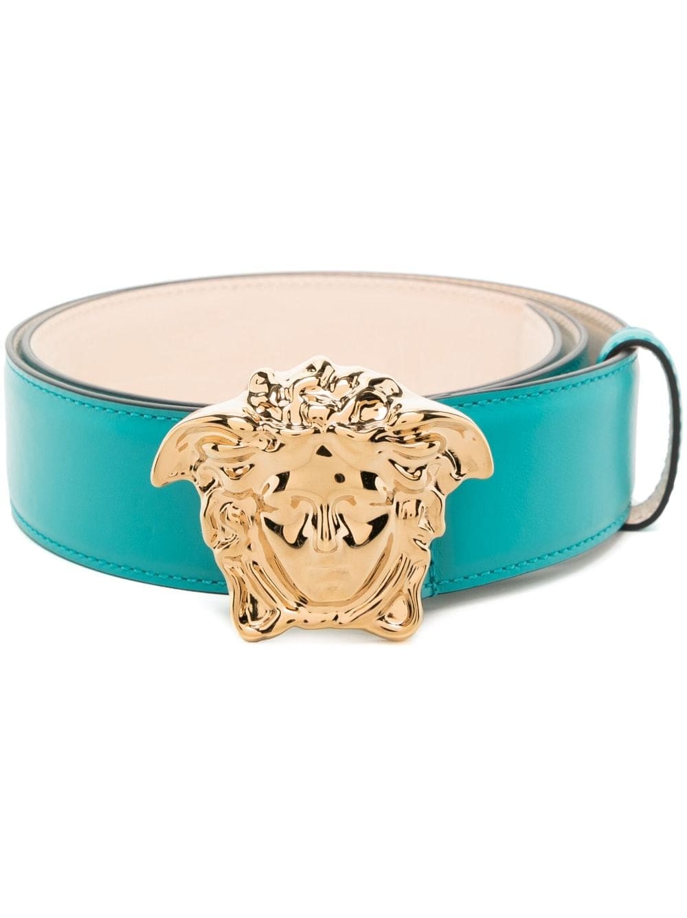 Versace infuses this blue leather belt with its signature branding with the familiar Medusa plaque carved out in gold-tone hardware.
