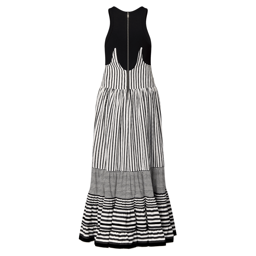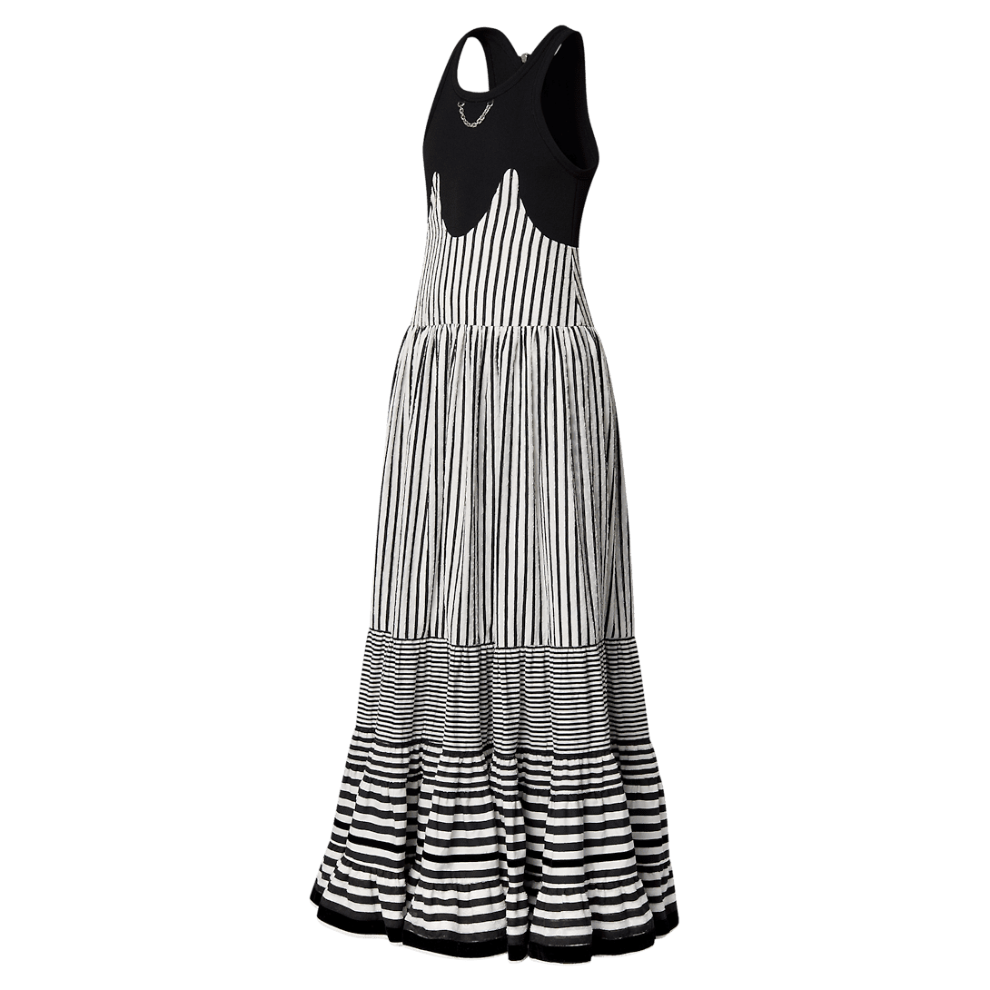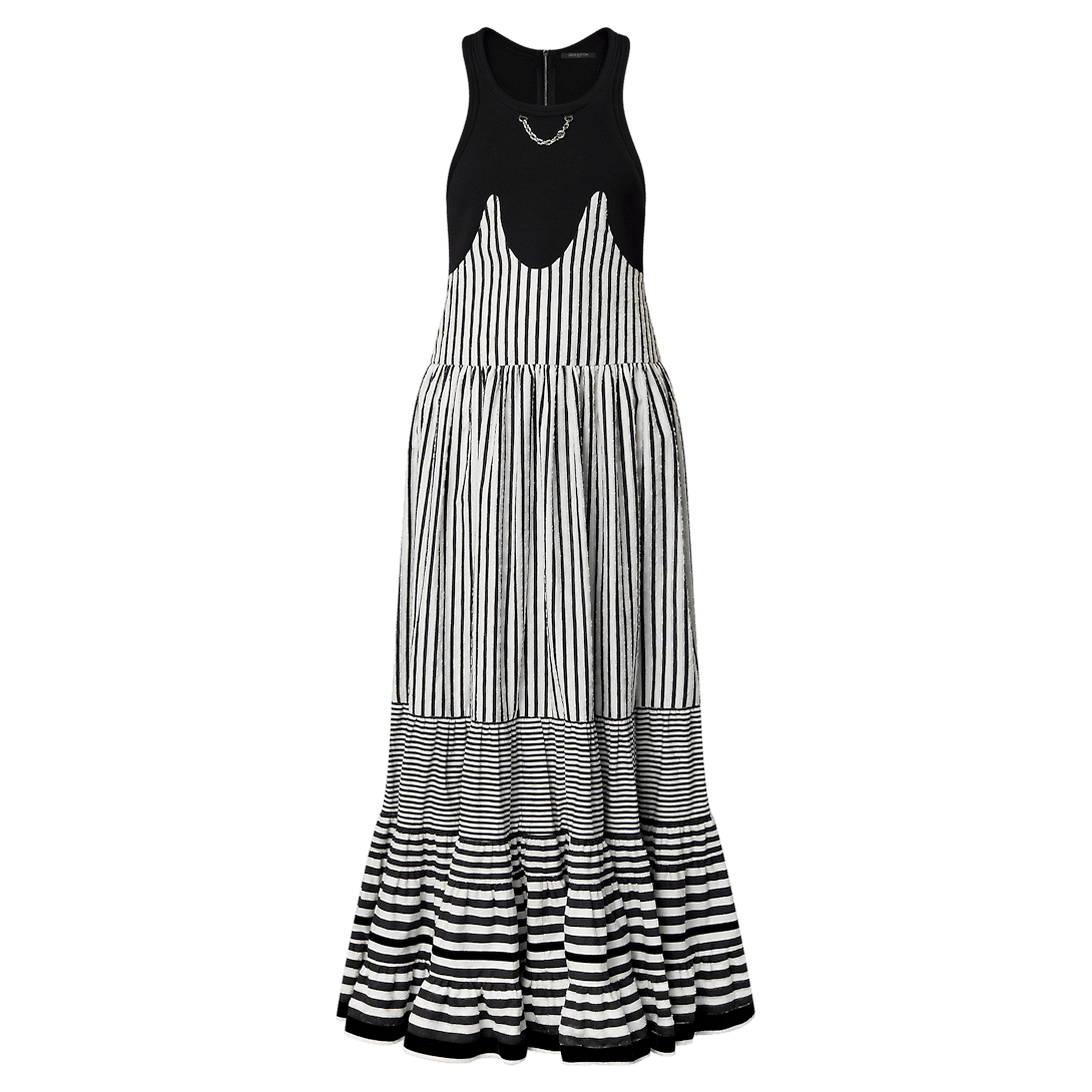 A play of horizontal and vertical stripes elevates this casual dress with a graphic feel. The top is cut in a sporty form-fitting tank shape from crepe jersey, which is accented with a chic corset-style jersey insert beneath the bust, while ruffled tiers in a mix of breezy materials introduce volume to the ankle-length skirt. Signed with an LV chain detail at the neckline.