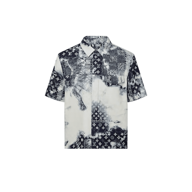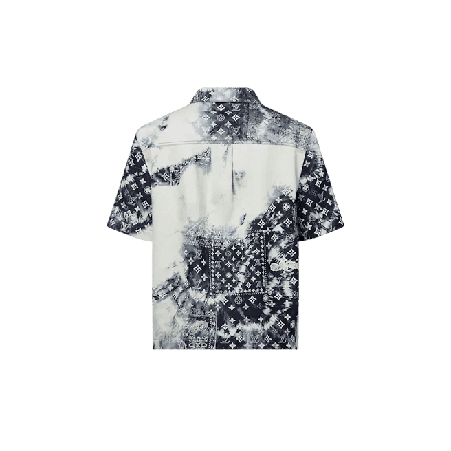 The crisp lines of this summery short-sleeved shirt are emphasized by a hidden button placket, straight bottom hem and asymmetric flap pocket on the left chest. Made from Japanese denim, it features an allover Monogram Bandana motif with a bleached tie-dye effect, achieved through a discharge technique that removes color from fabric rather than applying it.