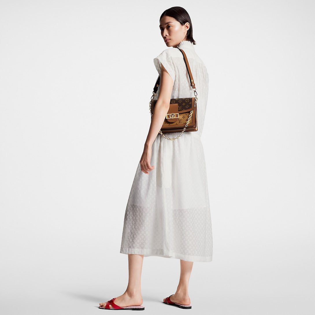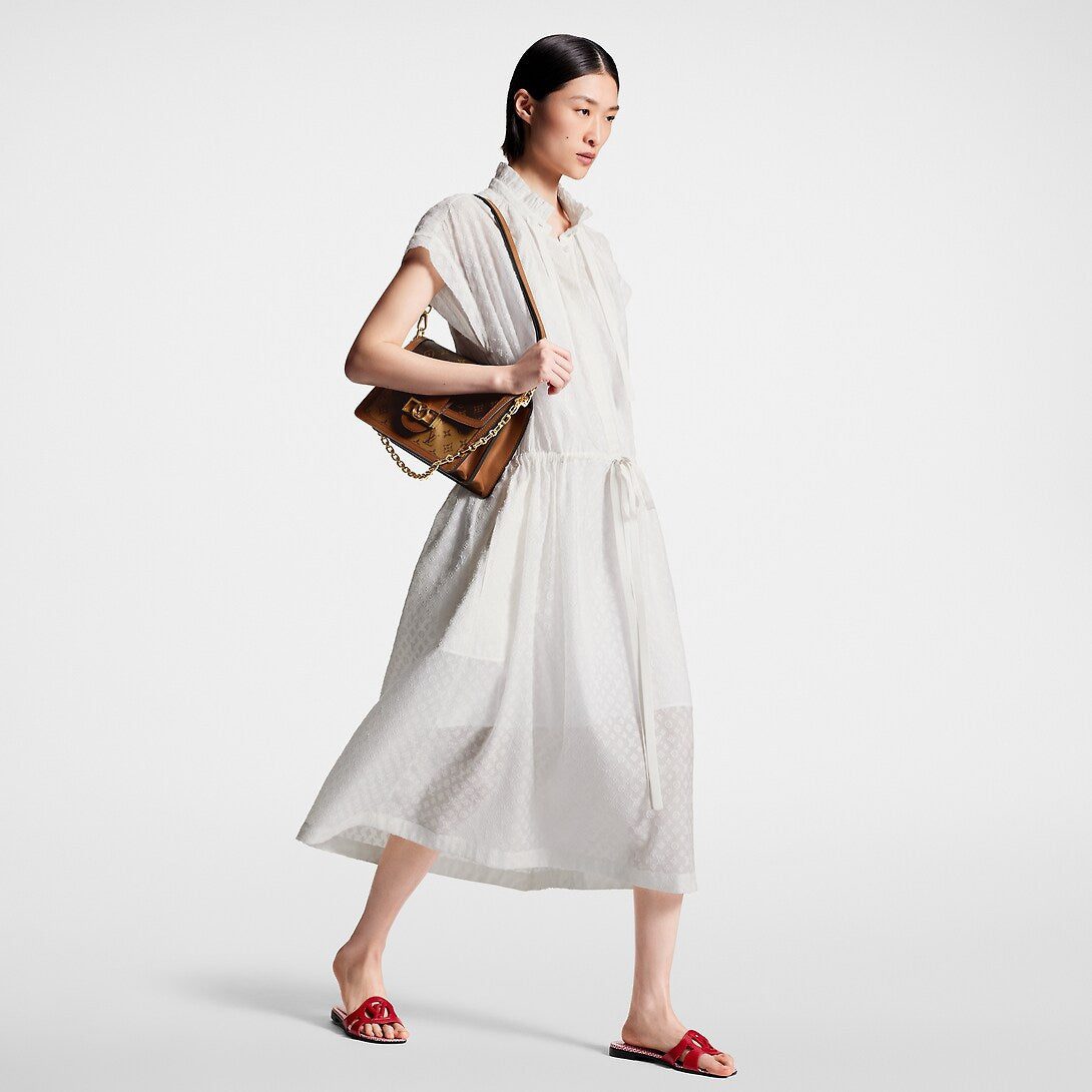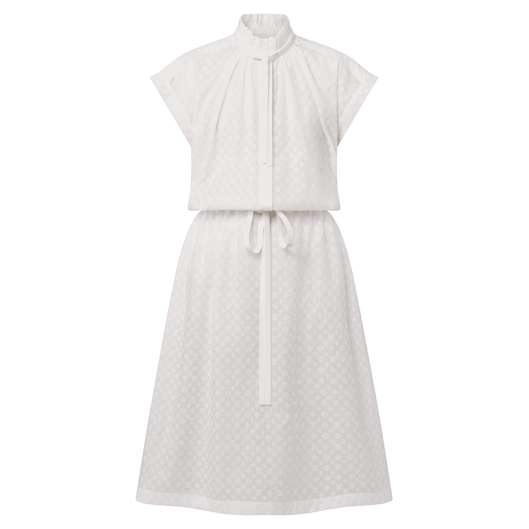 Romantic detailing elevates this summer dress with a chic, feminine feel. Crafted from a soft, lightweight cotton-silk blend featuring a mini Monogram motif in tone-on-tone fil coupé for a subtle signature finish. A pleated lavaliere collar and a casual drawstring waistline introduce feminine volume to the top half, while the skirt is clean-cut and casual.