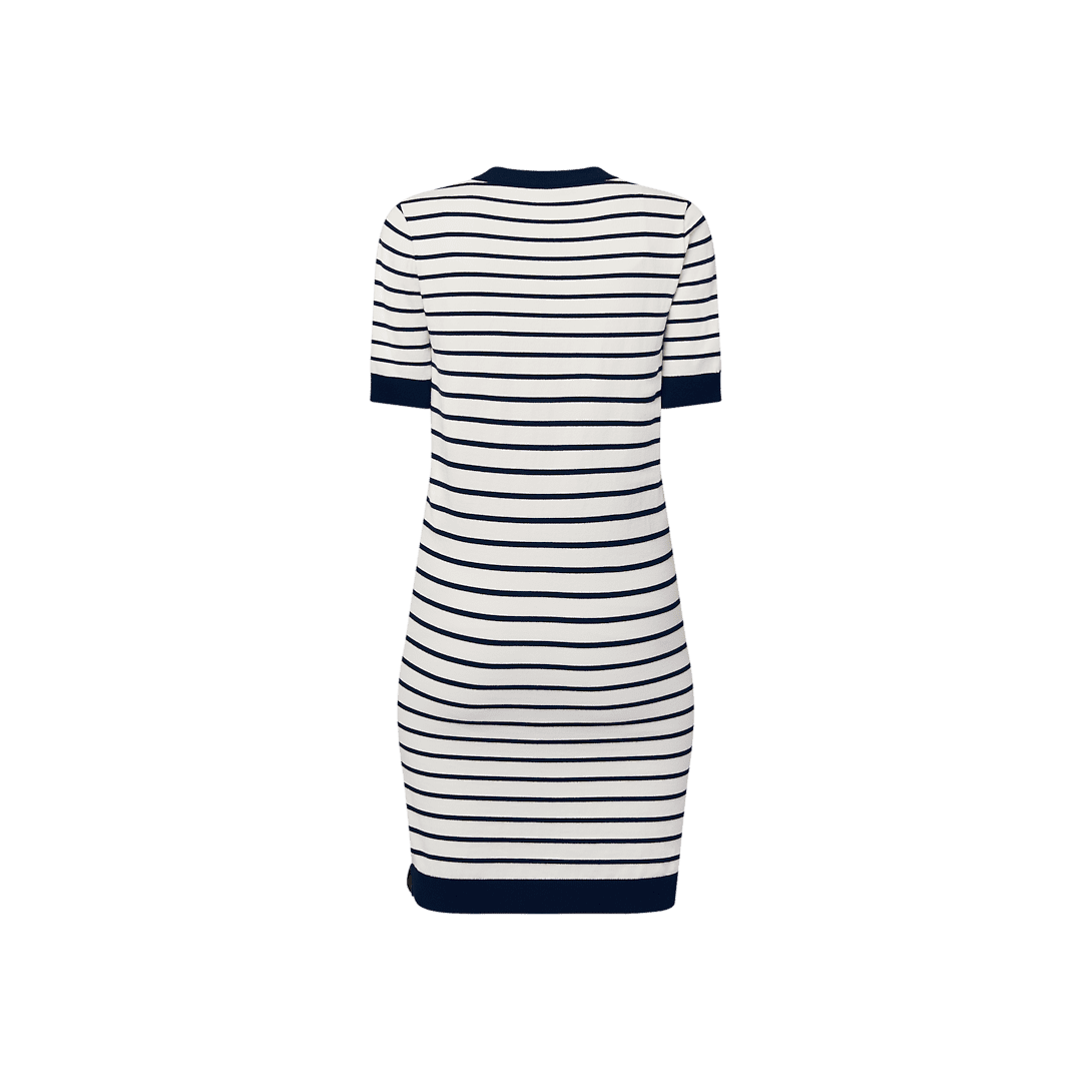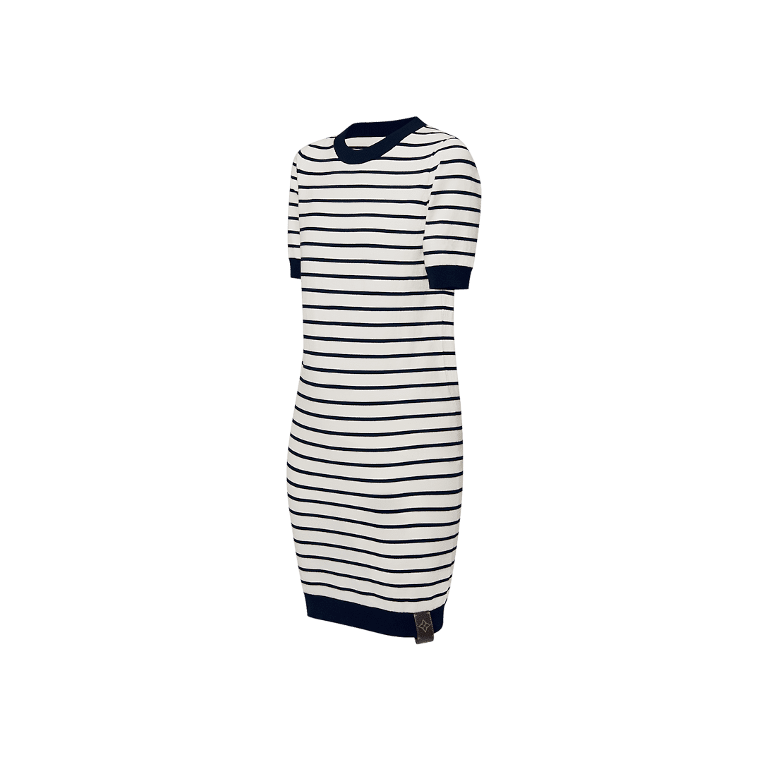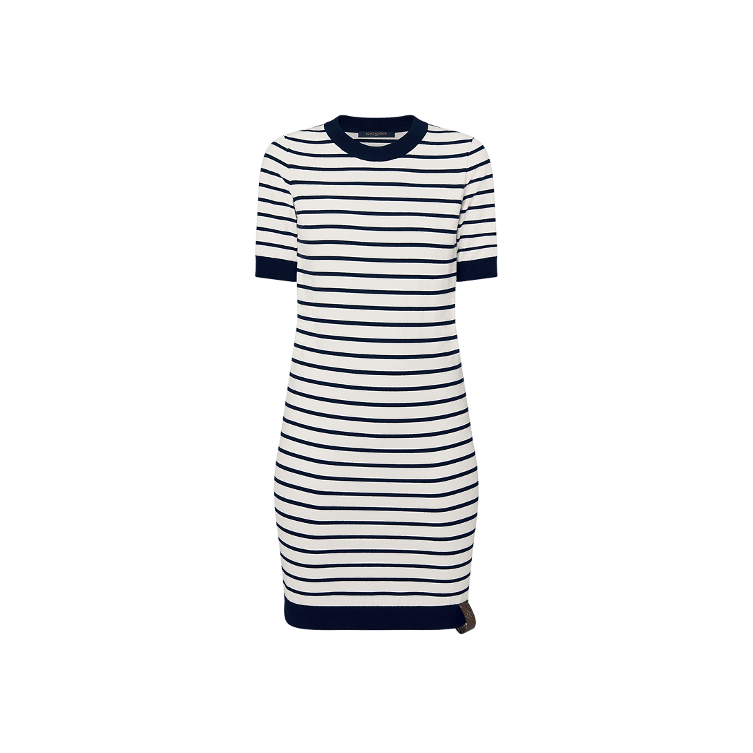 This dress from the Nautical collection is chic and comfortable in a soft cashmere knit spun in a flattering tapered T-shirt shape for casual everyday styling. The timeless sailor stripes are framed by thick contrasting hems for a modern, graphic look. Discreetly signed with a Monogram canvas tab.