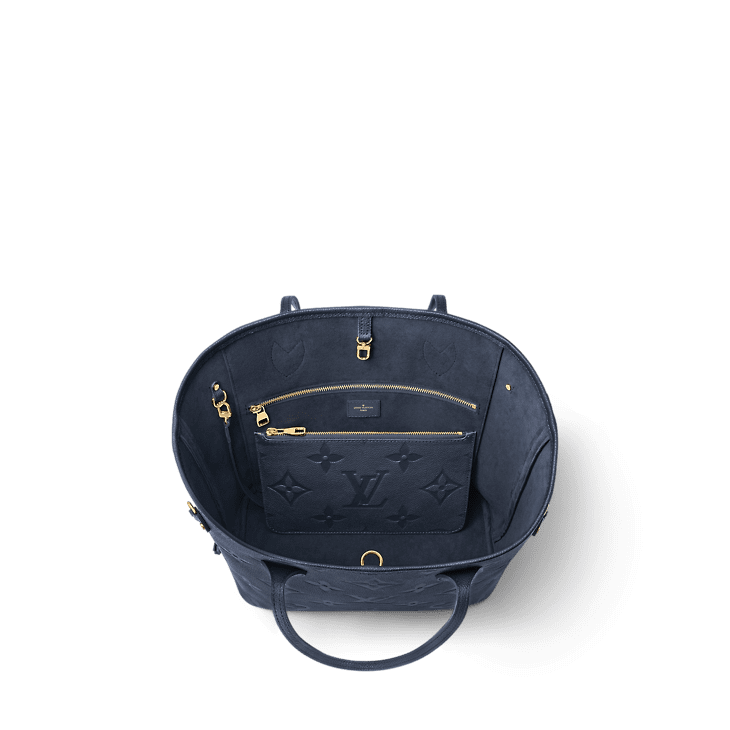 The Neverfull MM tote is made from Monogram Tiles canvas with leather trim along the top of the bag and on the handles. The Monogram pattern has a watercolor aspect and features the LV Circle in the center. It comes with a zipped pouch, with a complementary print, that can be removed and used separately.