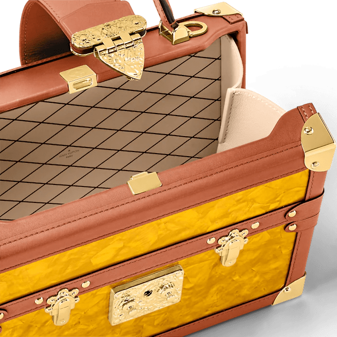- Inside Monogram flat clutch with zip closure attached with a gold-color chain