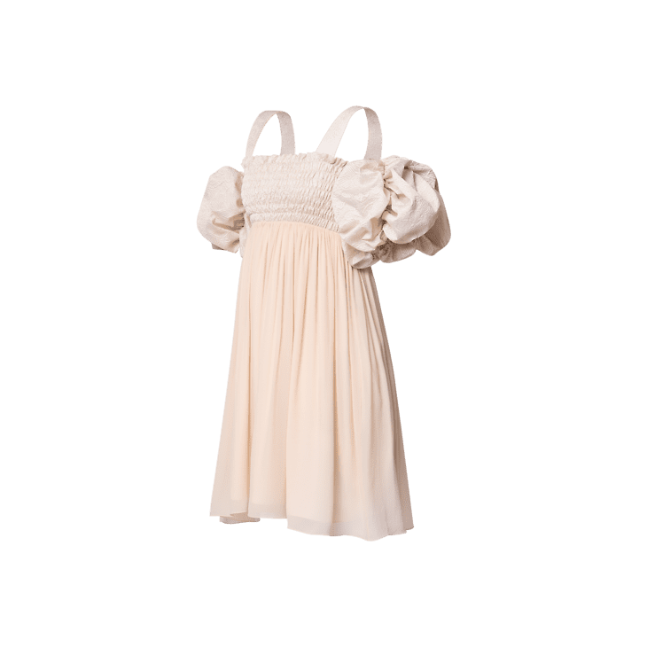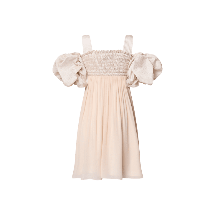 Voluminous off-the-shoulder jacquard puff sleeves elevate this elegant dress into a dreamy seasonal statement, drawing on the ethereal spirit of the runway show. In a coordinating jacquard, a smocked bodice skims the figure, while the fluid silk skirt softens the silhouette with a breezy finish.