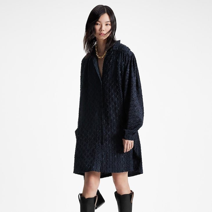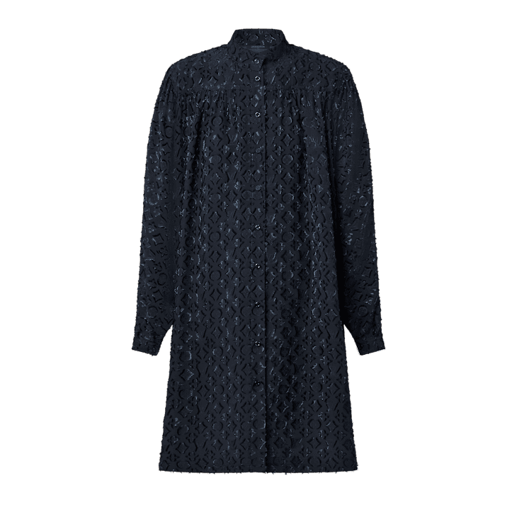 This long-sleeved silk shirt dress is elegantly elevated with the iconic Monogram motif featuring as a reverse fil coupé jacquard with a chic shiny finish. The relaxed-fit silhouette falls to an elegant mid-length, with gathering across the chest and shoulders emphasizing the graceful movement. A standing collar completes the breezy look with a clean finish.