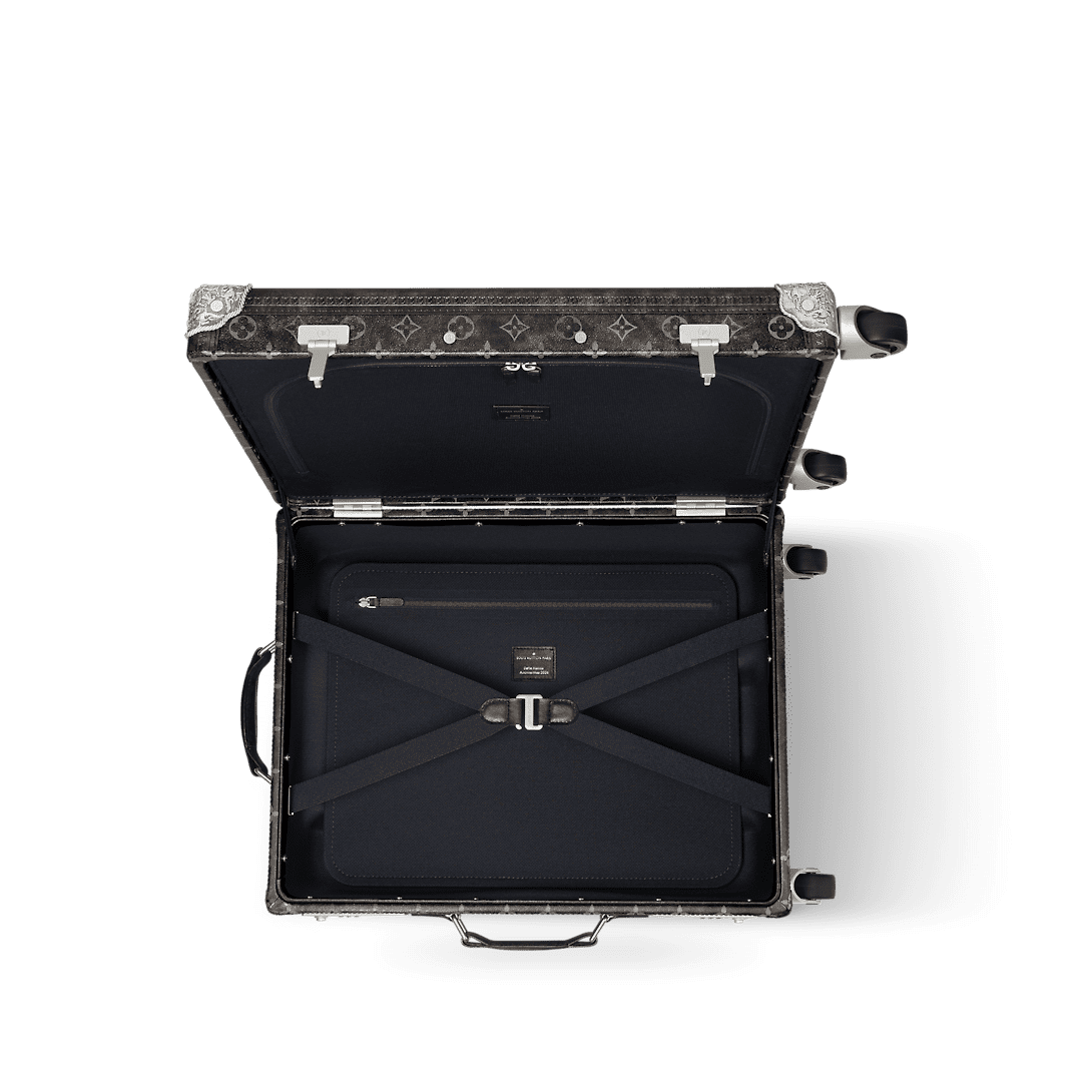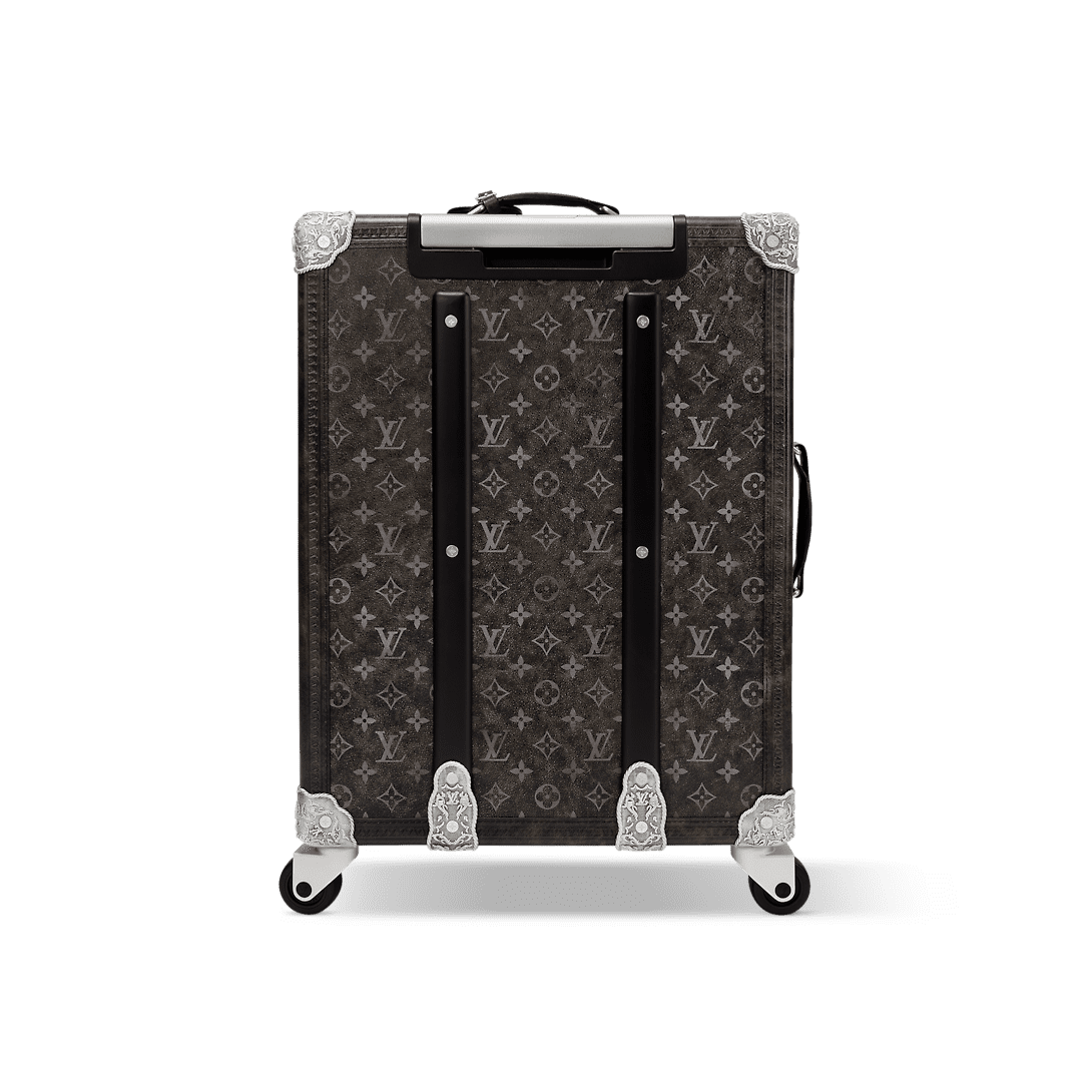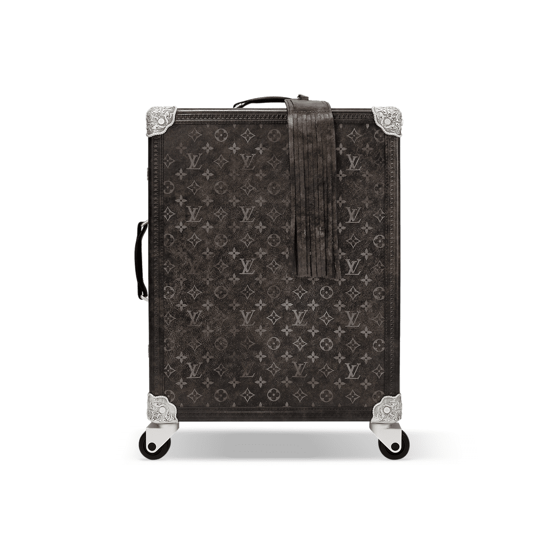 The Rolling Trunk is made from Brushed Monogram leather with its faded, black-and-white version of the iconic Monogram and features silver-toned metallic corners, engraved like a cowboy’s saddle. Pharrell Williams adorns the rectilinear design with a leather name tag with long, long fringes. Two combination locks keep belongings secure inside the well-designed interior.