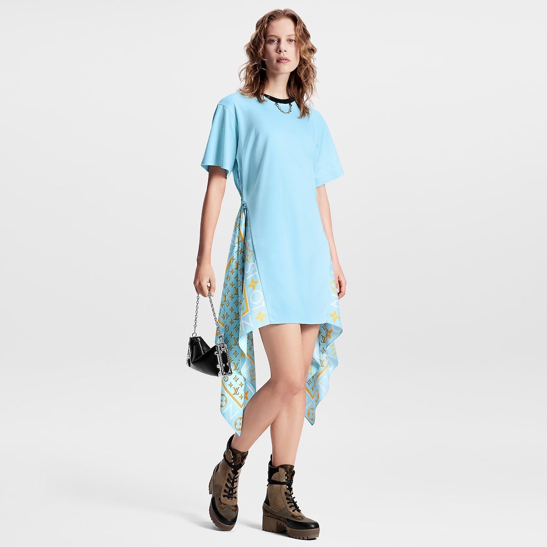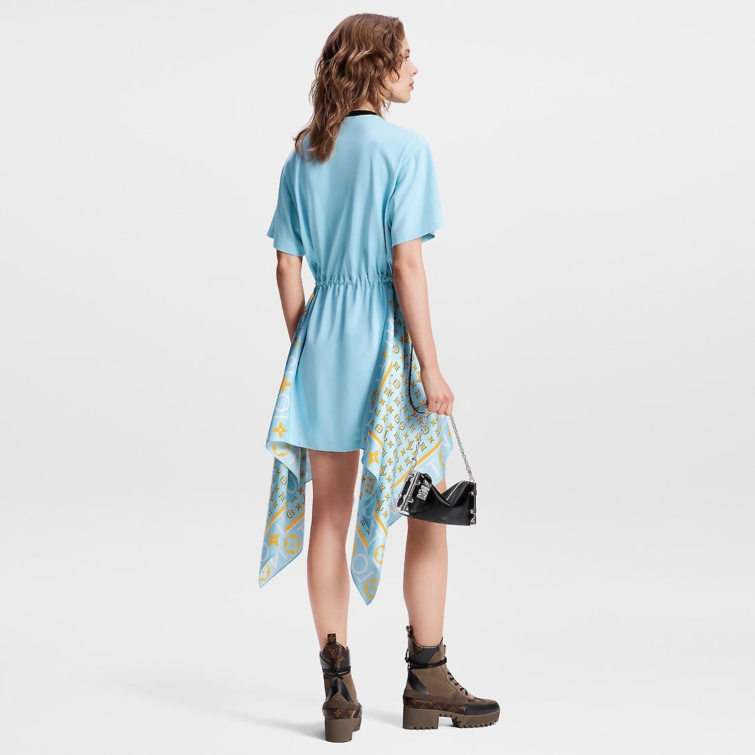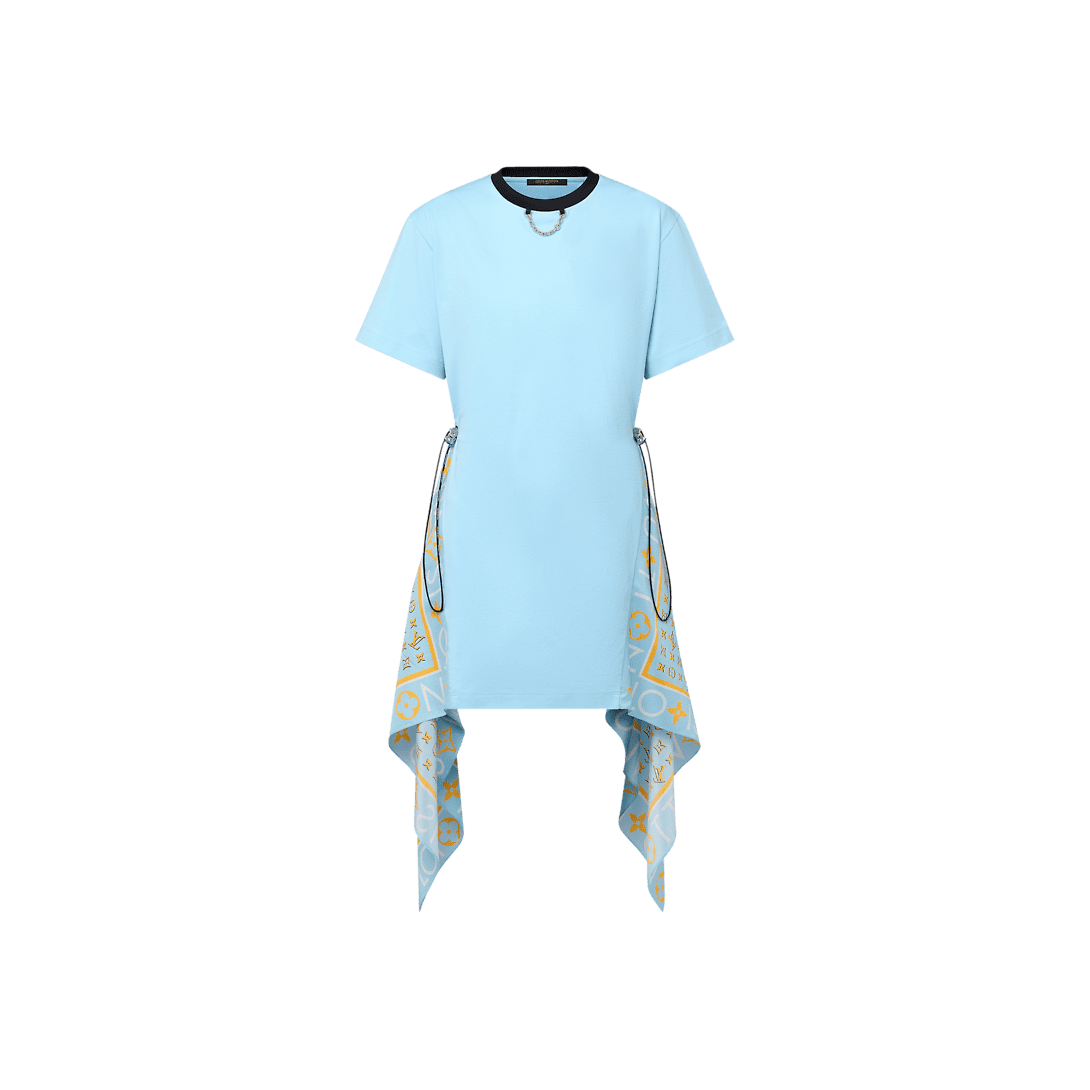 Playful seasonal detailing elevates this timeless T-shirt dress with a fresh feel: Cut from soft cotton jersey, the sides are trimmed with graphic Louis Vuitton silk scarves while the waistline is detailed with an oversized drawstring for a sporty touch. Complete with a contrasting crew neckline and a signature LV chain embellishment.