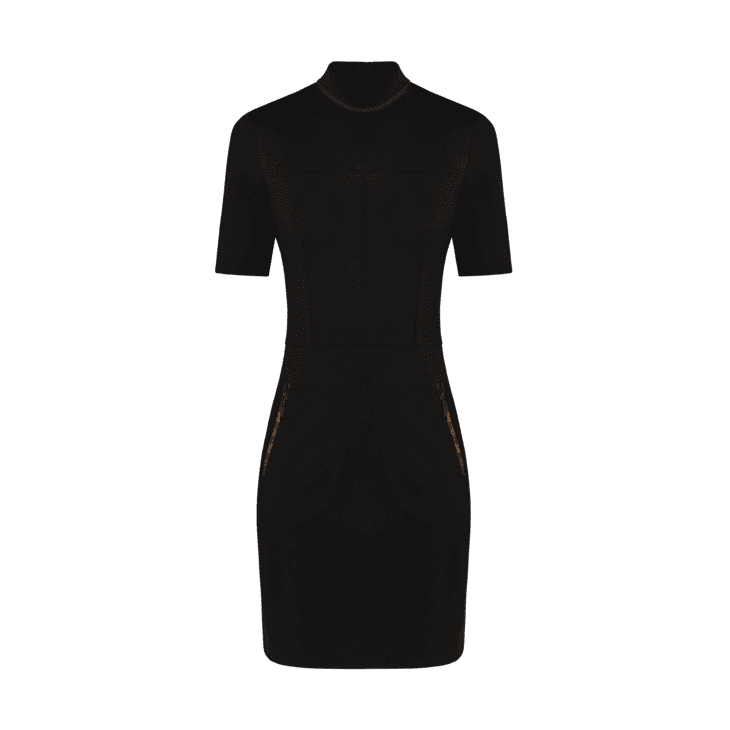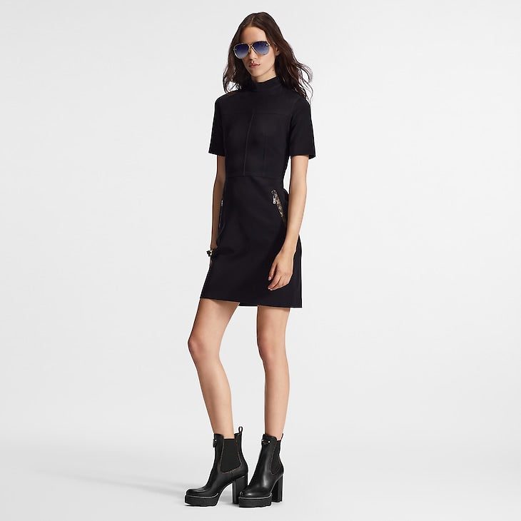 A chic piece with a bold sportswear vibe, this Short Sleeved High Neck Fitted Dress features a figure-hugging shape and scuba-style standing collar. Crafted from black technical jersey, coated Monogram technical zips from the Spring-Summer 2019 Show and engraved LV pullers add a cool Louis Vuitton signature.