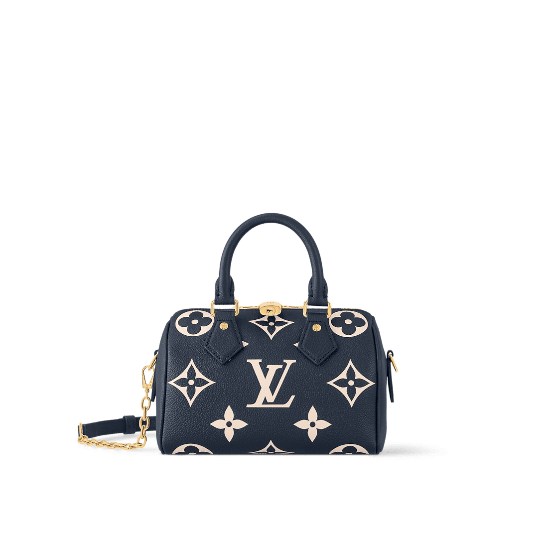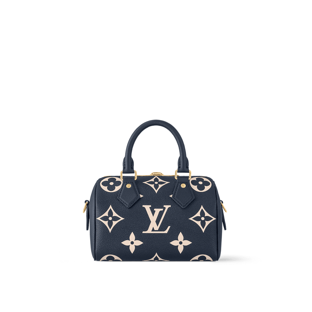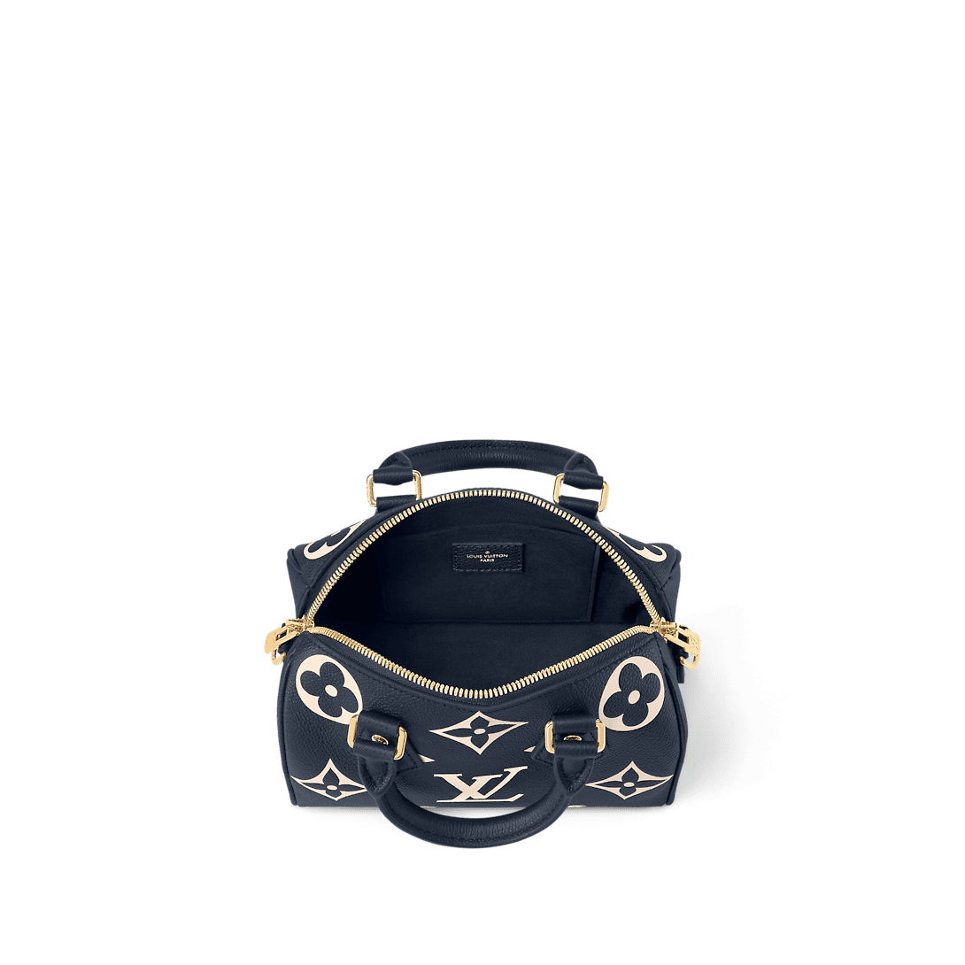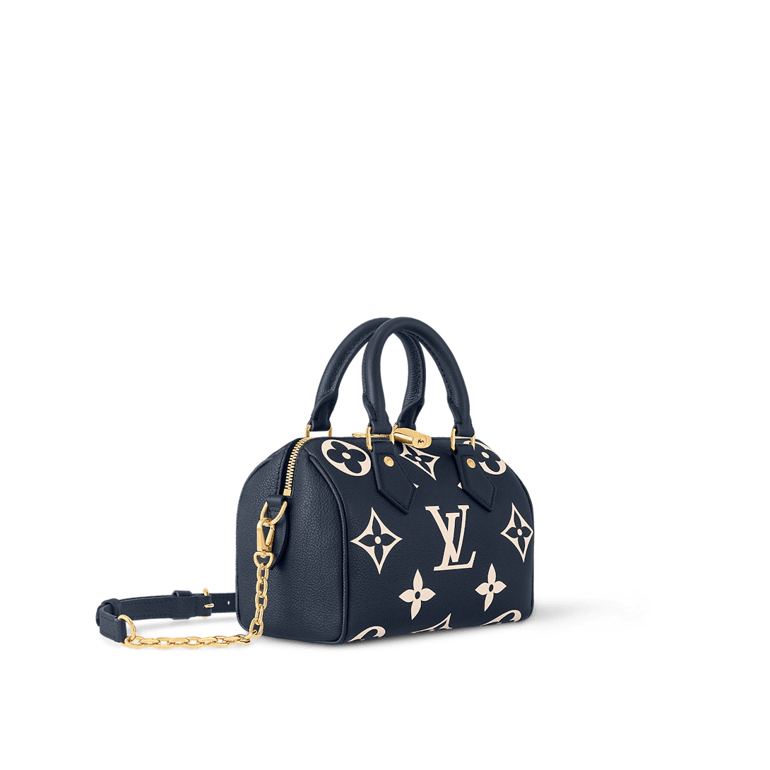 Two-color Monogram Empreinte cowhide leather brings a luxurious aspect to the Speedy Bandoulière 20. The Monogram is first embossed into the navy-blue leather, then the pattern is printed in cream on top of the embossing. Part of the Nautical Collection, the Speedy features two top handles and a removable and adjustable strap for shoulder carry.