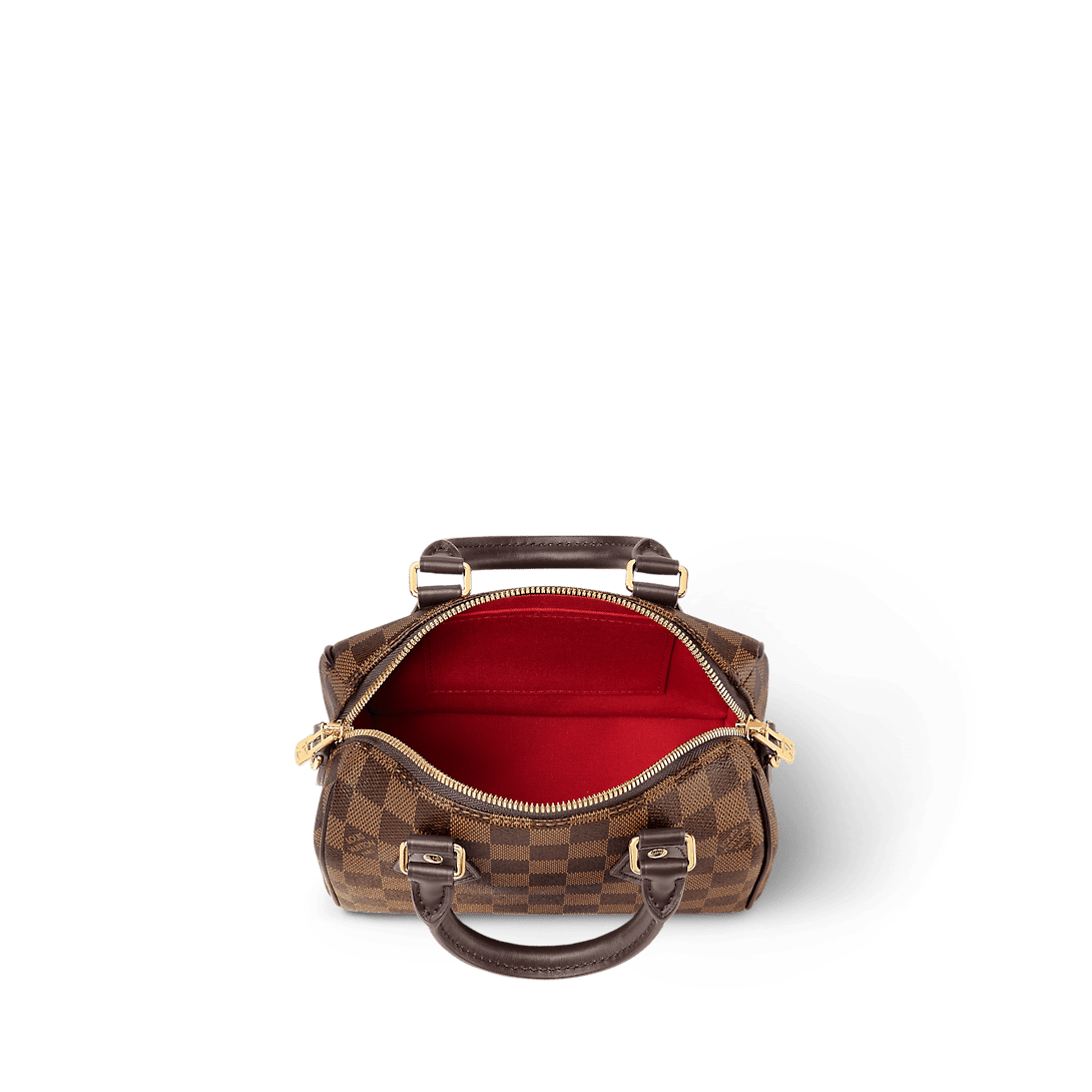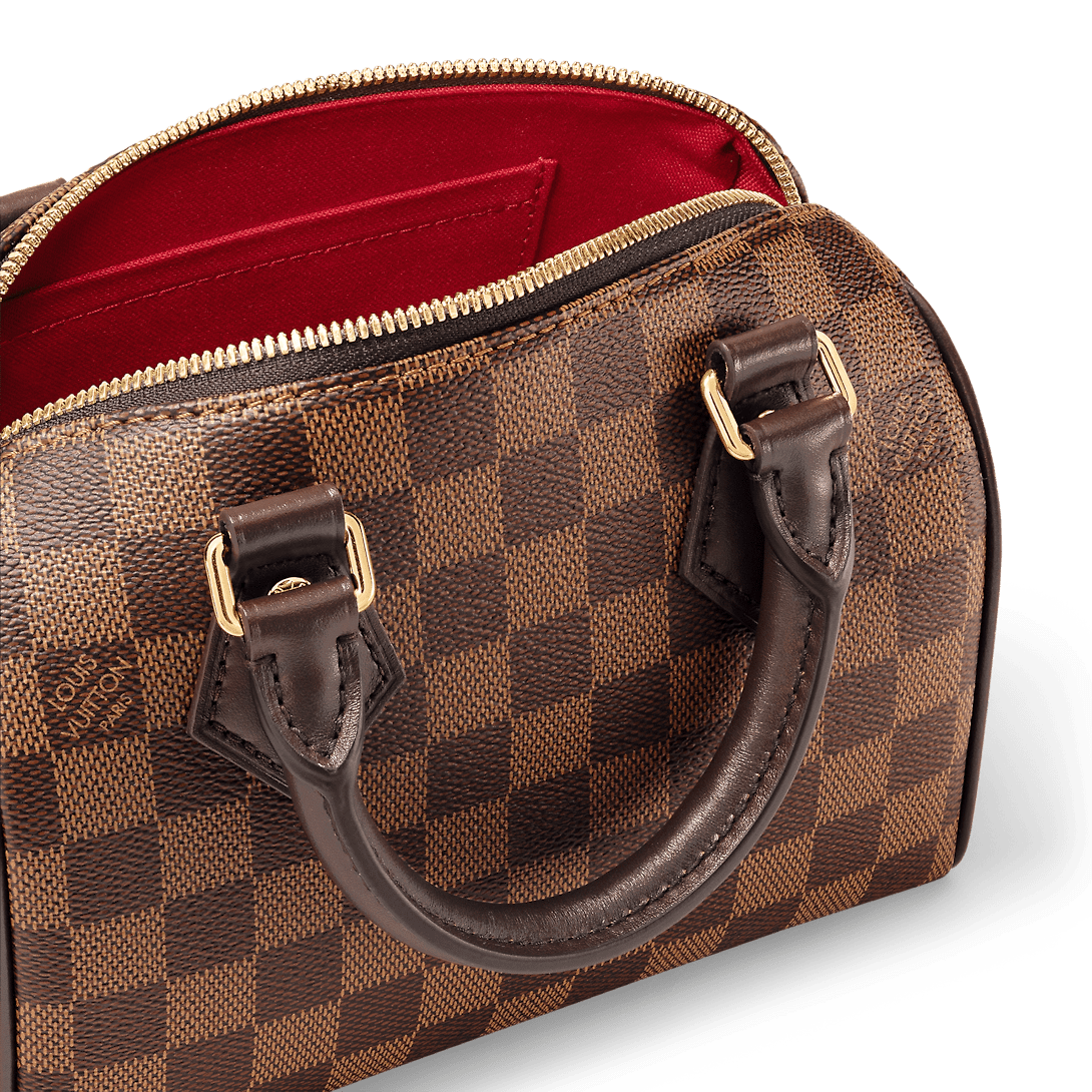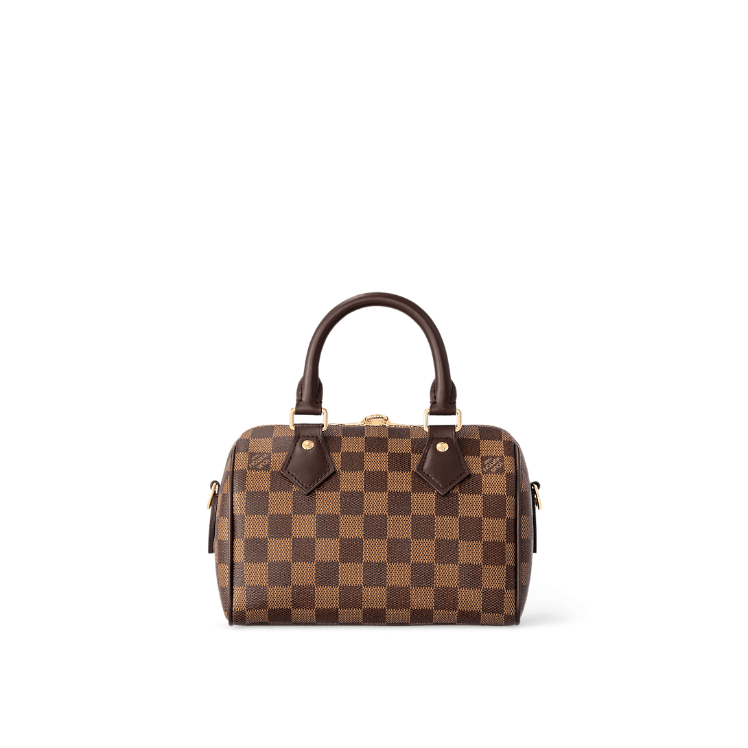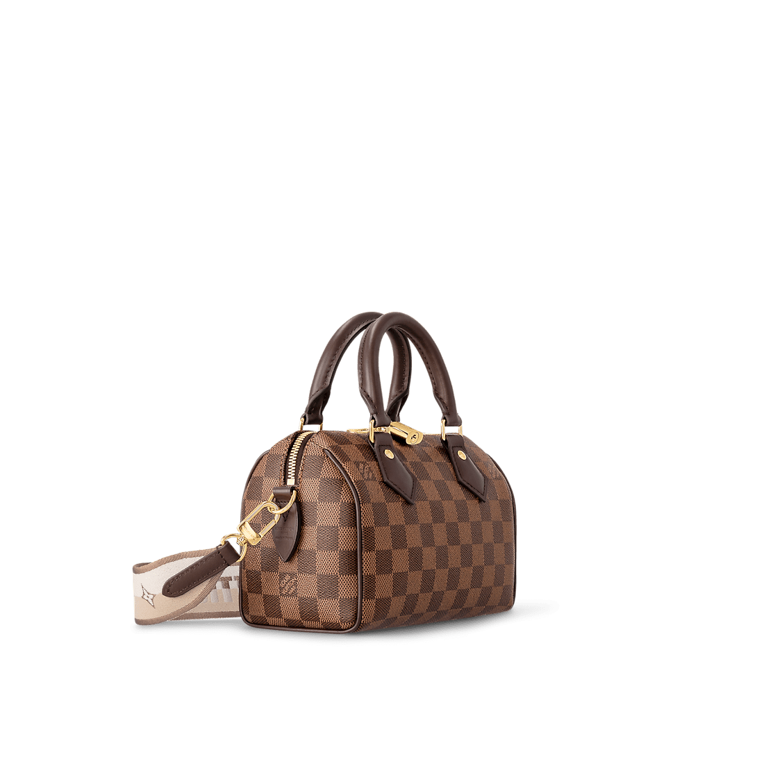 The Speedy Bandoulière 20 city bag is now offered in classic Damier Ebene canvas. Trimmed with chocolate-brown leather and fitted with a beige textile strap, this sporty model is designed for active lifestyles. It accessorizes any silhouette with its instantly recognizable shape, engraved gold-tone padlock and iconic, rolled Toron handles.