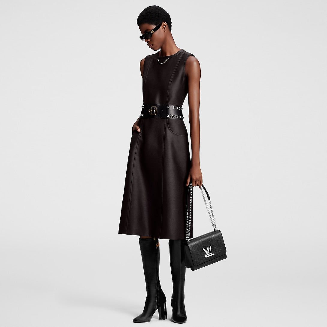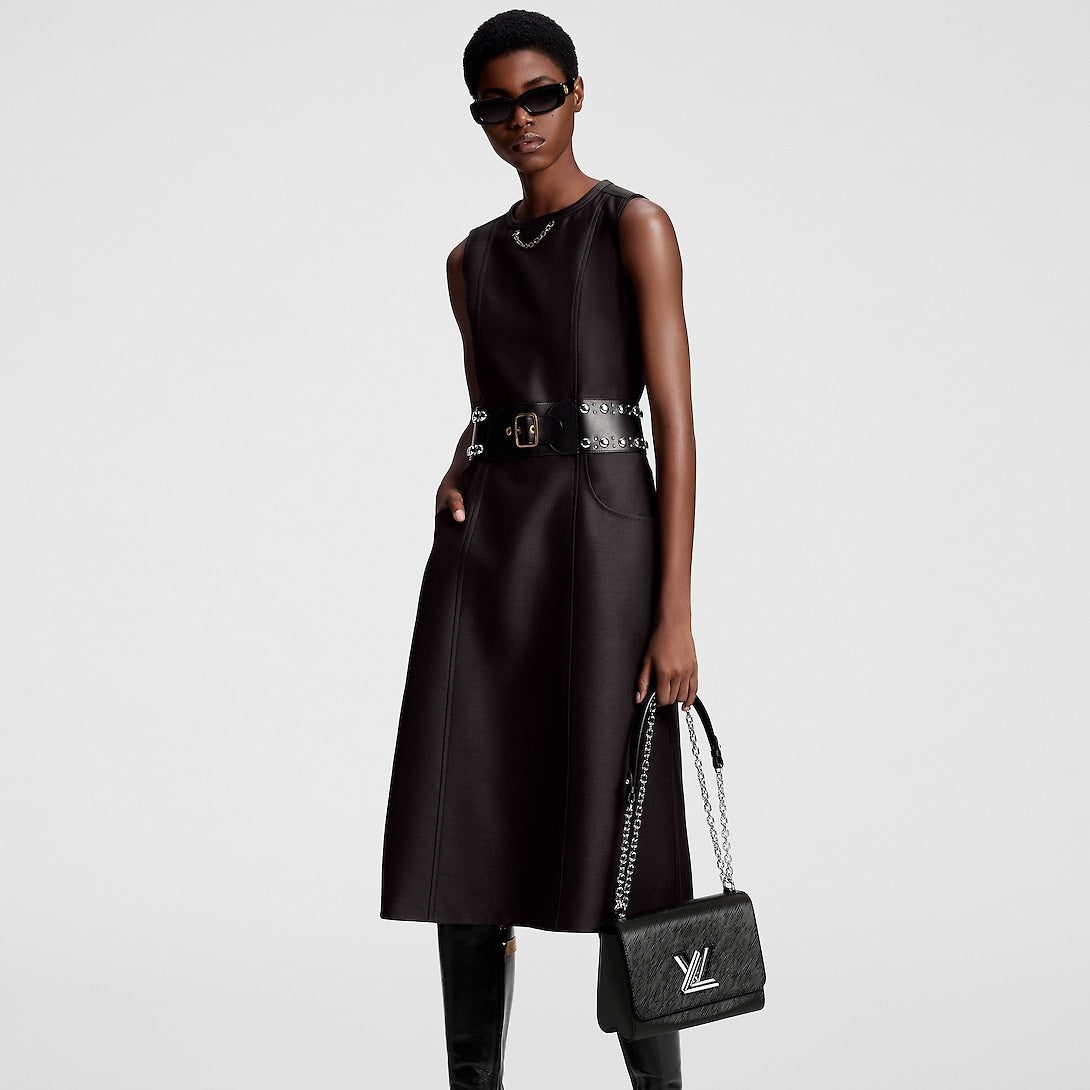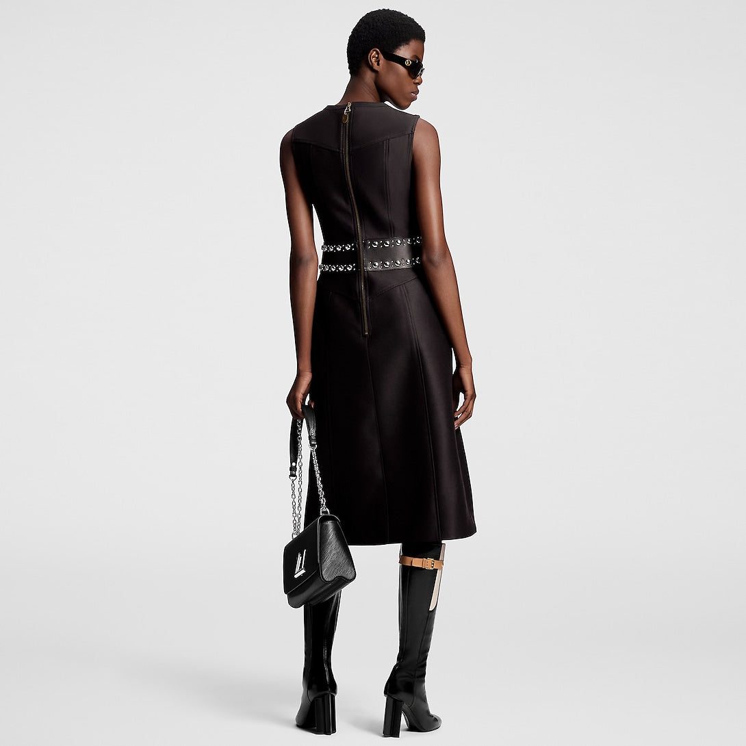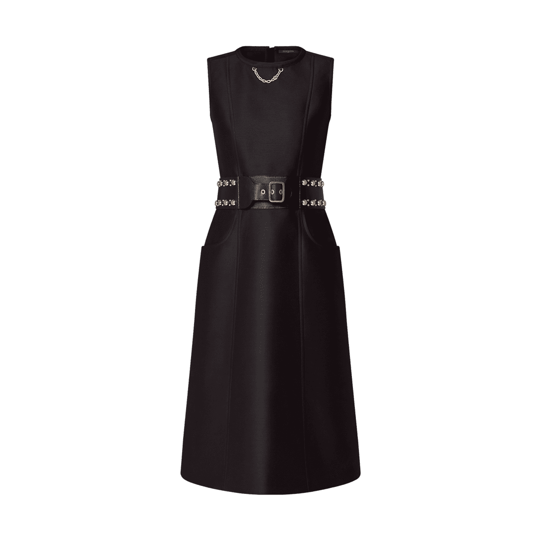 A refined silhouette with a rebellious twist: This dress has a smart, tailored look in an elegant mid-length A-line shape crafted from wool-silk mikado, while the waist is accentuated with an integrated leather belt embellished with polished studs for a statement, structured finish. Complete with two side pockets and an iconic LV chain detail at the neckline.