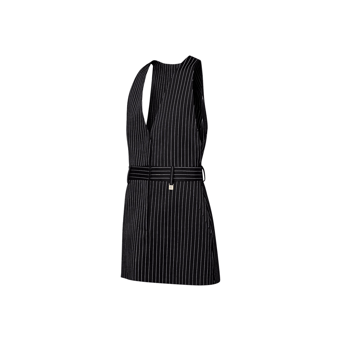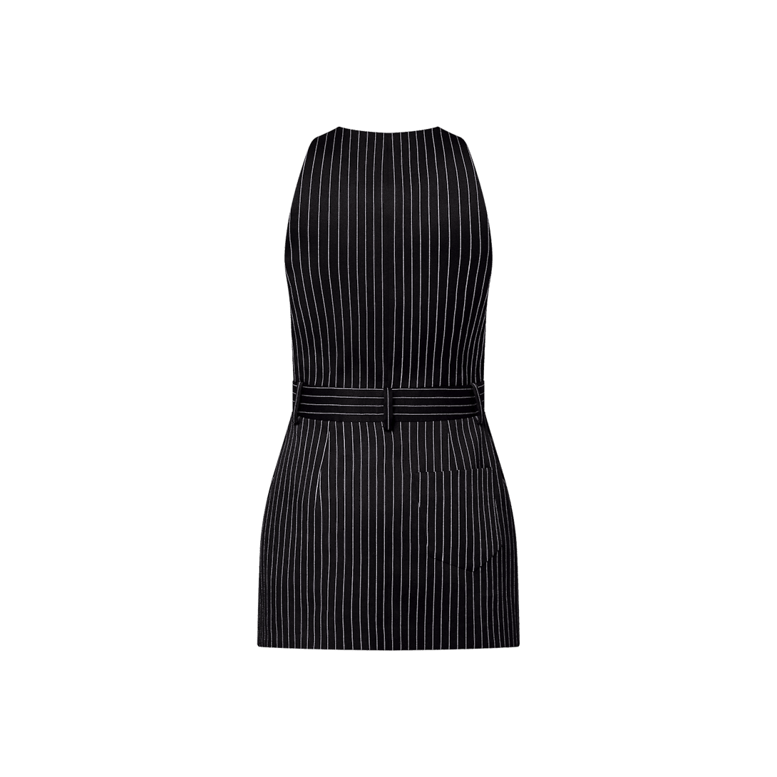 This dress is crafted from pinstriped silk-cotton for a structured, tailored feel. The top is cut in a clean crossover shape that mimics the look of a waistcoat, while a discreetly contrasting waistband with belt loop details introduces a trompe l’oeil feel to the silhouette. Signed with a metallic Louis Vuitton tab.