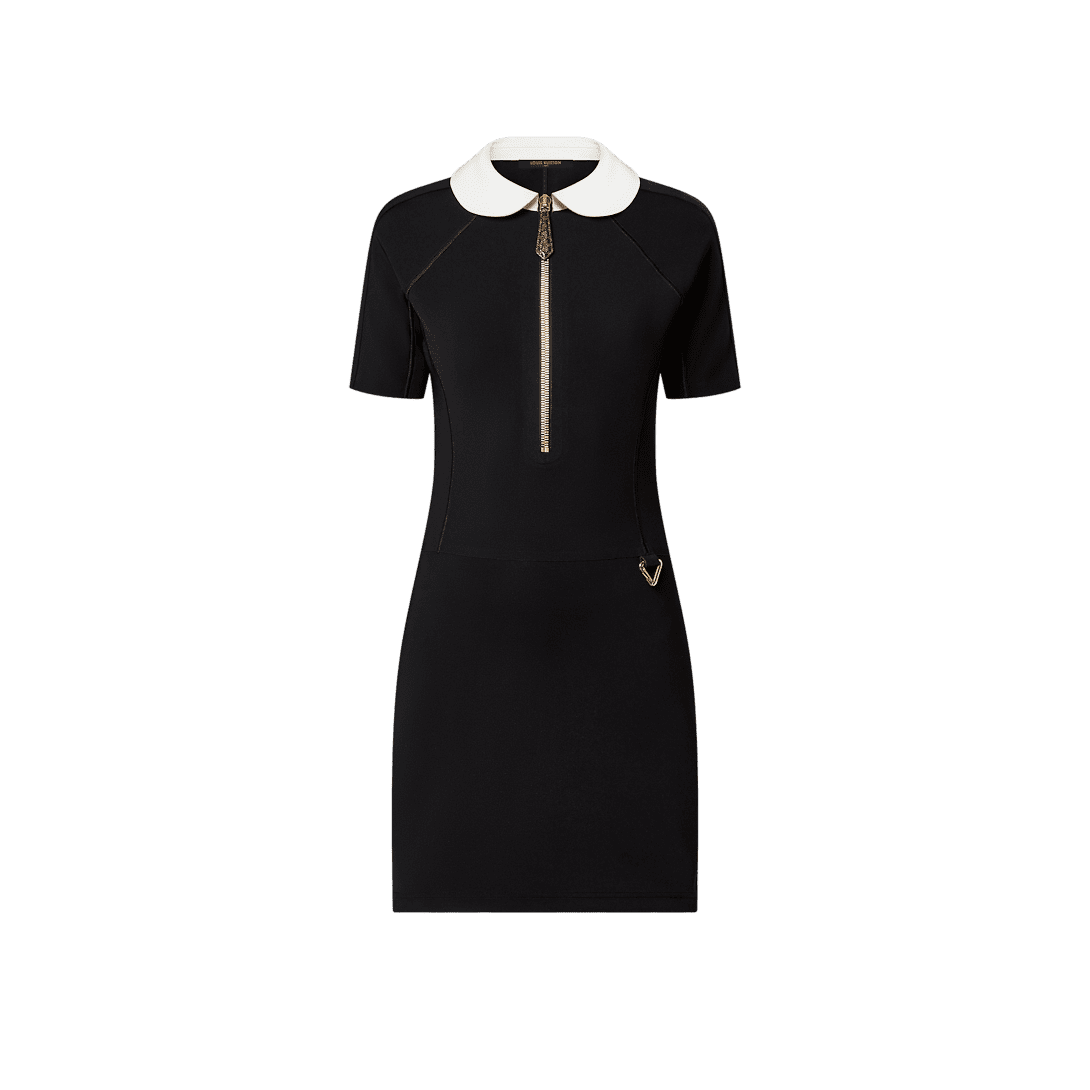 This dress is cut from sleek technical jersey that skims and smoothes the figure for a clean, sporty look, which is underscored with an exposed half-zipper fastening and a golden triangular carabiner detail on the hip. Trim short sleeves and a contrasting Peter Pan collar complete the look with a chic feminine feel.