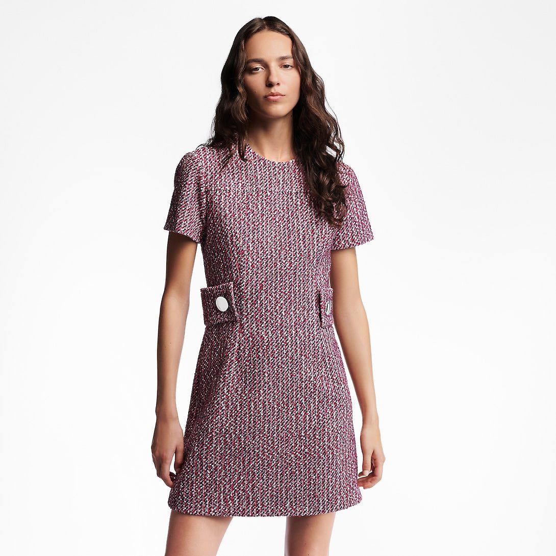 This chic dress celebrates the art of French style in a trim short-sleeved skater silhouette tailored from stretch boucle tweed in a red, white and blue colorway inspired by the tricolor. The waist is highlighted with elegant faux belt details, which are fastened with scaled-up brass snap buttons for a polished finishing touch.