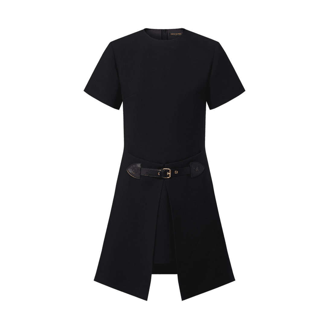 A structured wrap-effect skirt elevates this timeless short-sleeved A-line dress with a trompe l’oeil layered look, tailored from refined wool-silk cady crepe. The waistline is embellished with a tone-on-tone leather belt detail which is discreetly finished with LV Circle signatures, while the back is fastened with an exposed golden zipper for a contemporary finish.