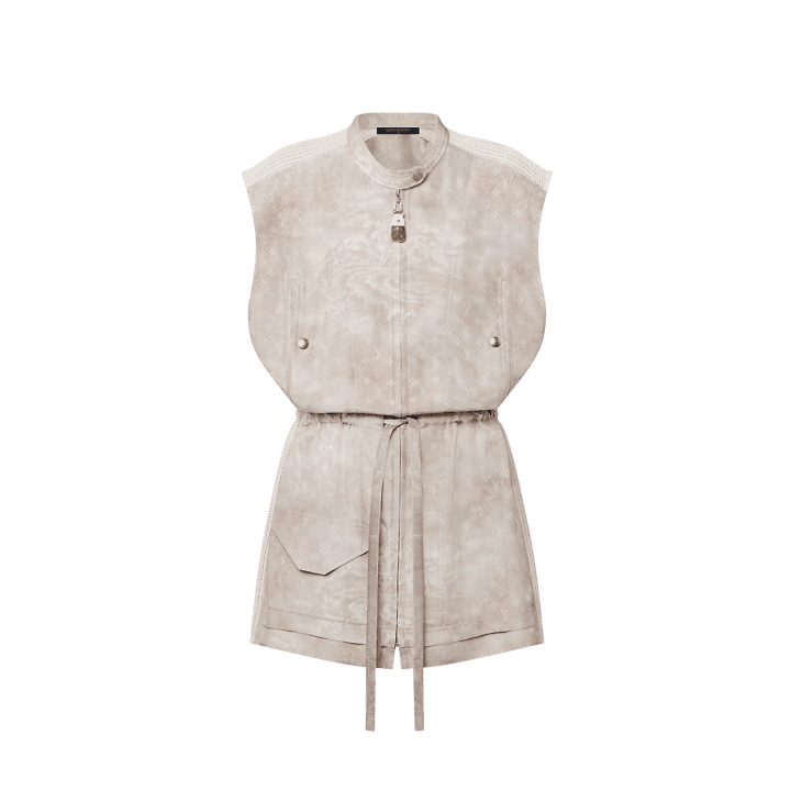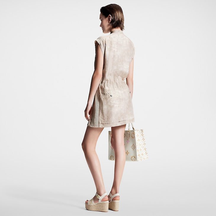 This mini dress is cut from breezy silk toile in this season’s spirited tropical Monogram print for an understated signature finish. A drawstring at the waistline adds definition to the casual silhouette. The shoulders and sides are highlighted with sporty mesh inserts, while a snap-button collar, zip-up front and multiple pockets subtly nod to functional outerwear styles.