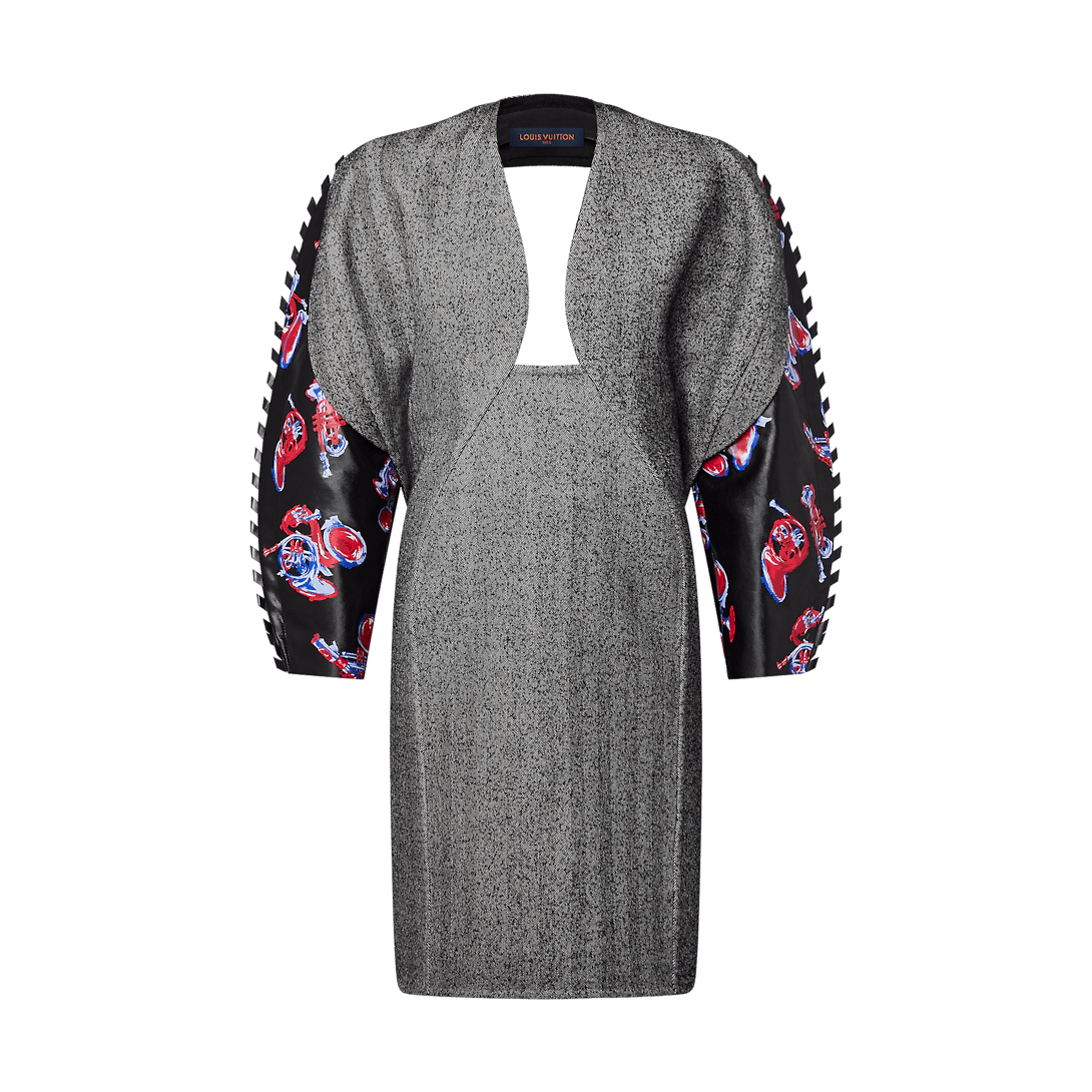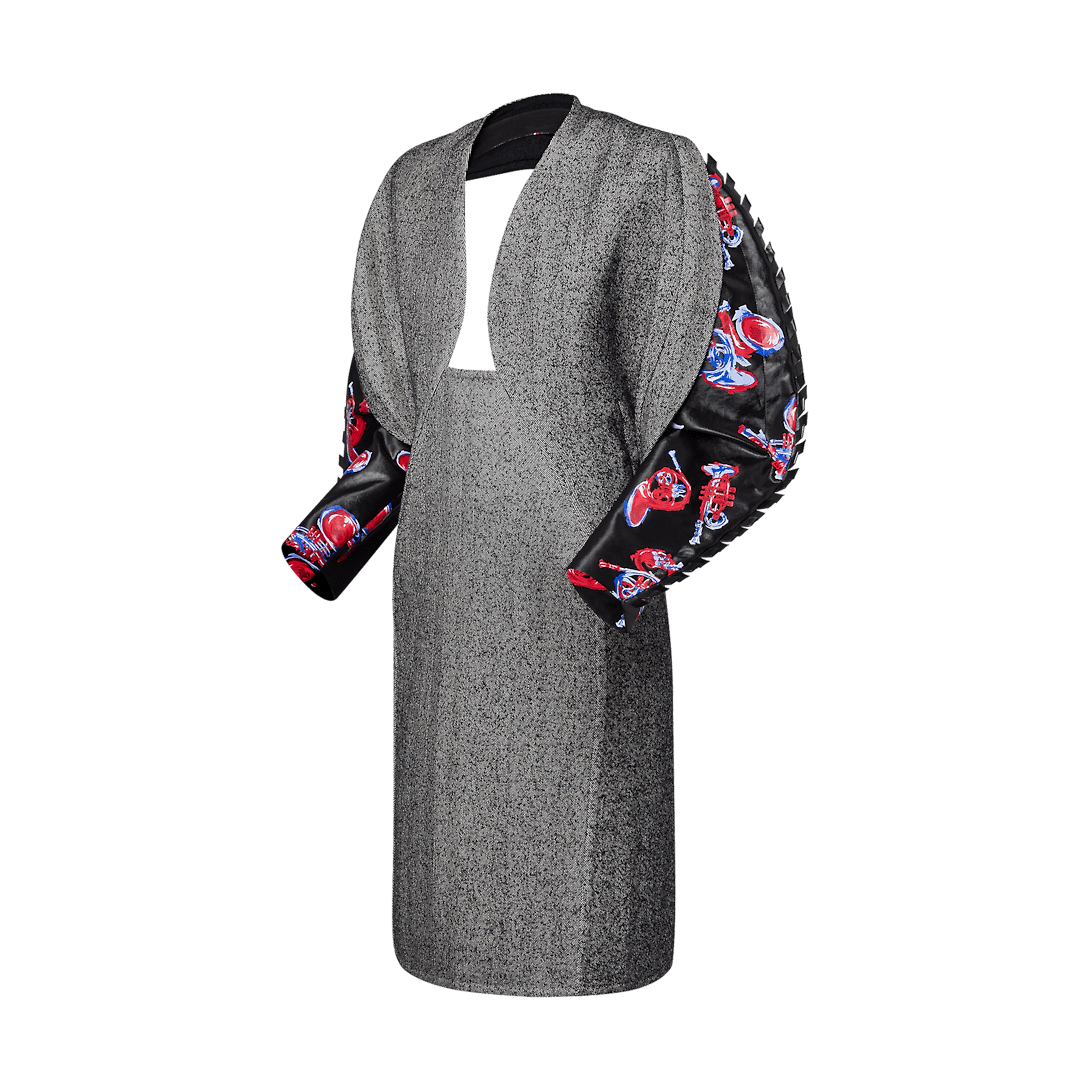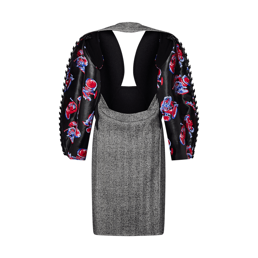 This sophisticated bi-material dress is an homage to contemporary French style. Flexible double wool in a herringbone motif forms the smart fitted skirt and rounded halterneck top, which is detailed with a sensual hourglass cut-out on the chest. The sleeves strike a playful contrast in shiny nylon twill printed with a bold red white and blue trumpet graphic and finished with a leather trim.