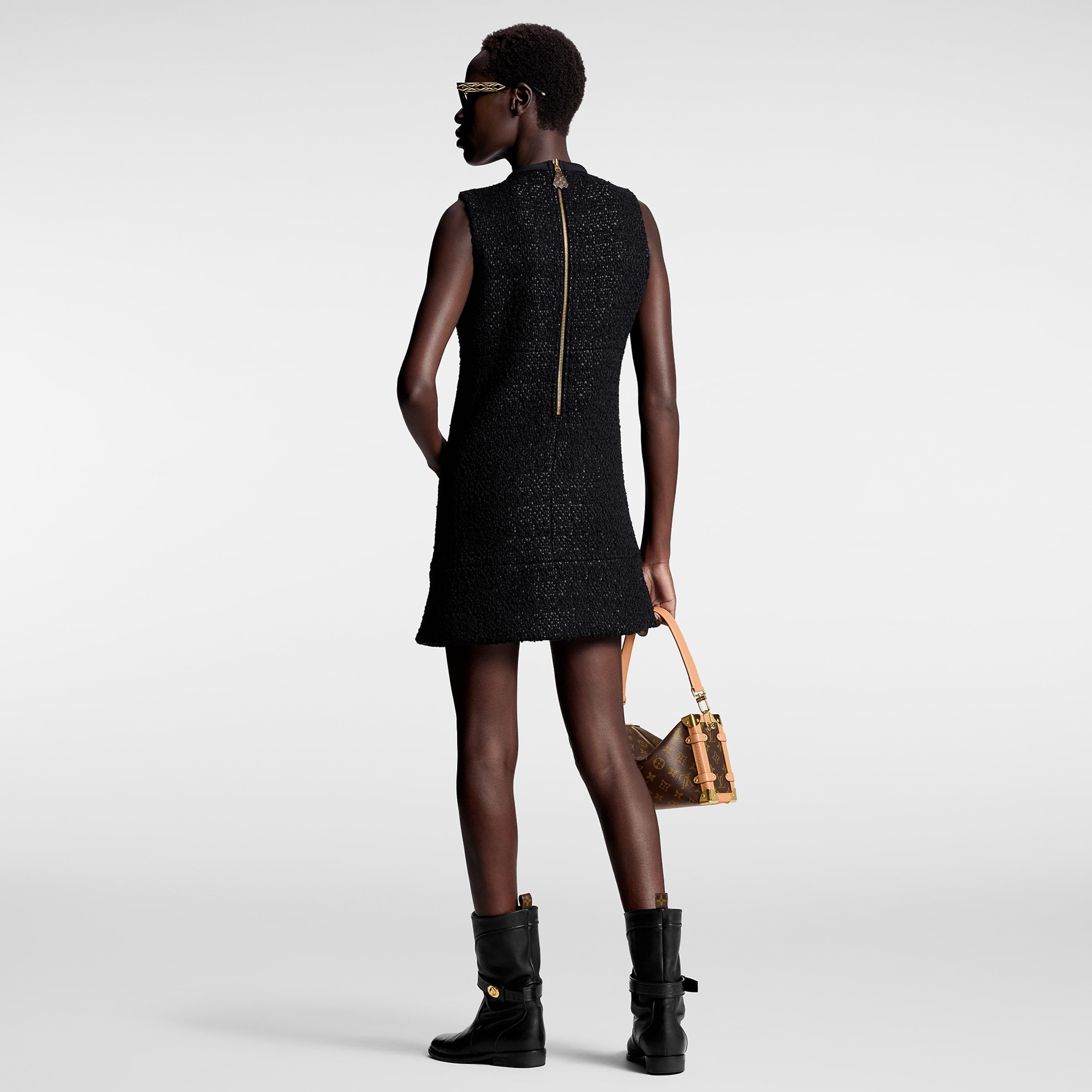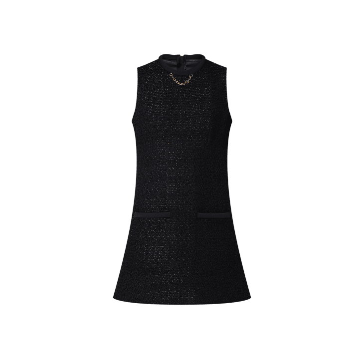 Understated and elegant: This dress is crafted in a classic A-line silhouette from elegant black tweed for a refined look. The neckline and two pockets are discreetly accented with tone-on-tone bias tape, while a golden LV chain detail on the front and an exposed golden zipper at the back introduce a chic metallic touch.