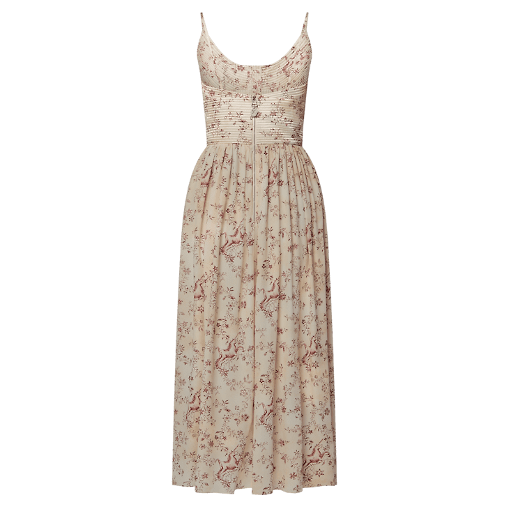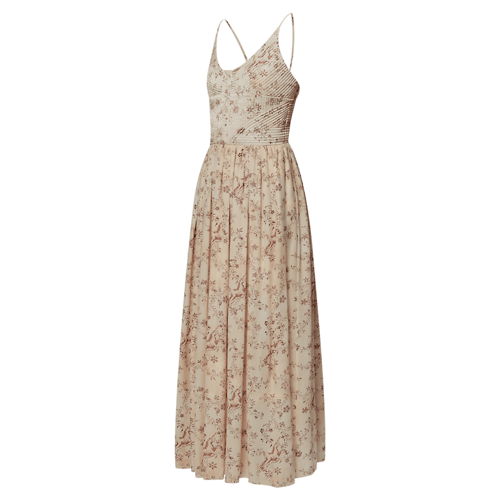 Dreamy detailing elevates this silk satin dress with an airy, romantic feel. The top half has a structured, lingerie look with a scoop neckline, slim straps and refined boutis needlework highlighting the figure, while pleating around the waistline adds volume to the mid-length skirt. An allover print of this season’s spirited unicorn motif completes the look.