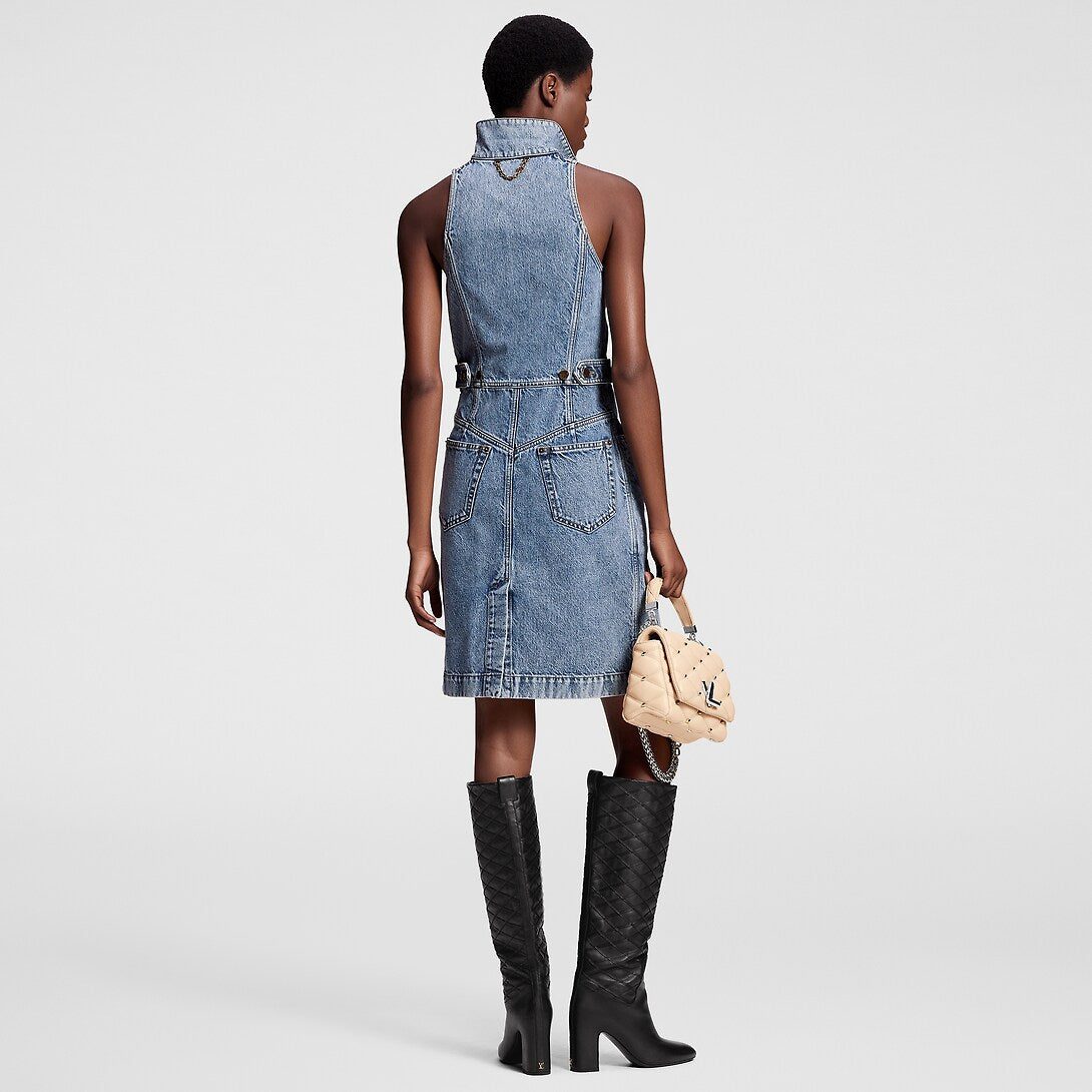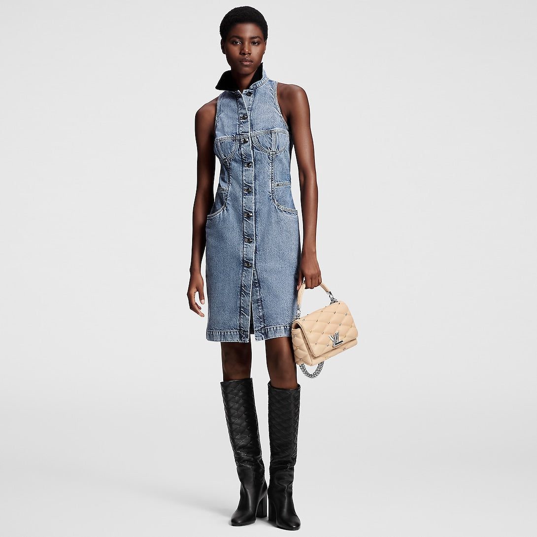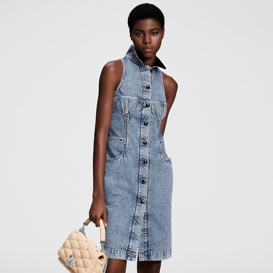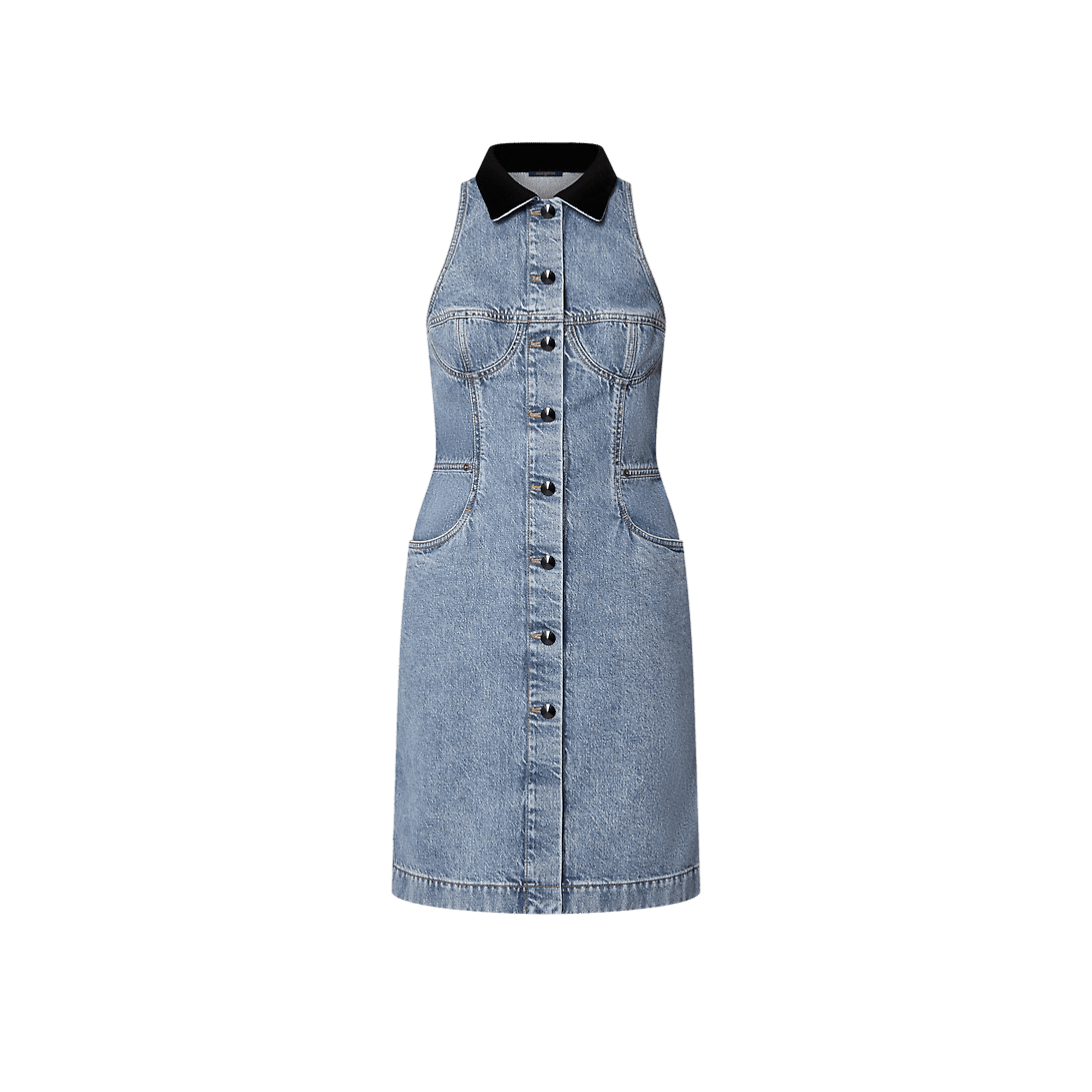 Crafted from stonewashed denim, this sleeveless dress is casual and comfortable with a subtle vintage feel. Topstitching around the bodice traces the figure with a feminine bustier effect, while a velvet collar and prism-cut buttons complete the look with a chic graphic accent. Discreetly signed on the back with an LV chain embellishment.