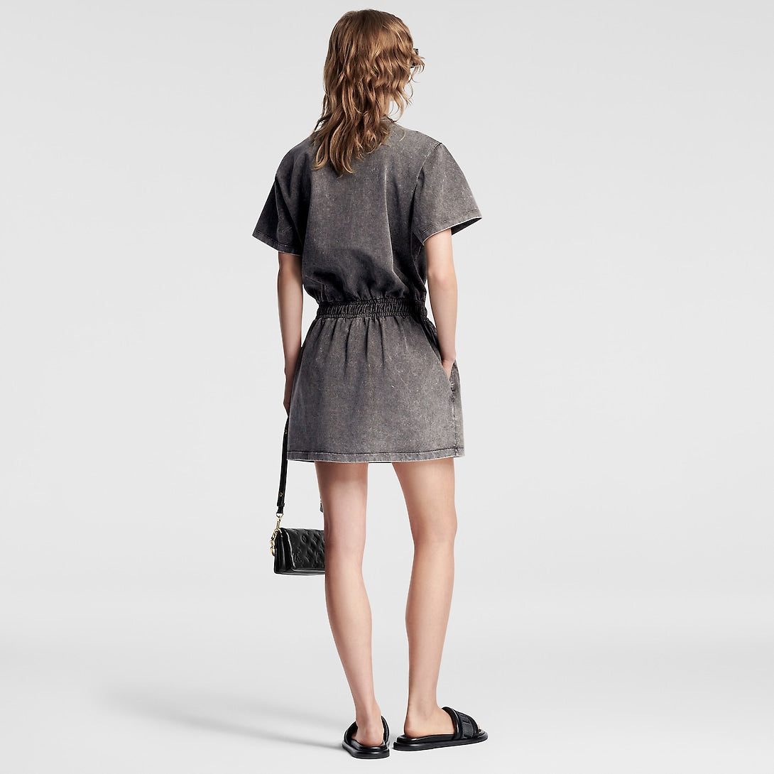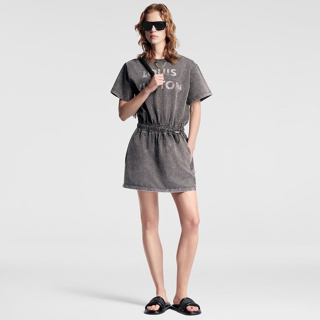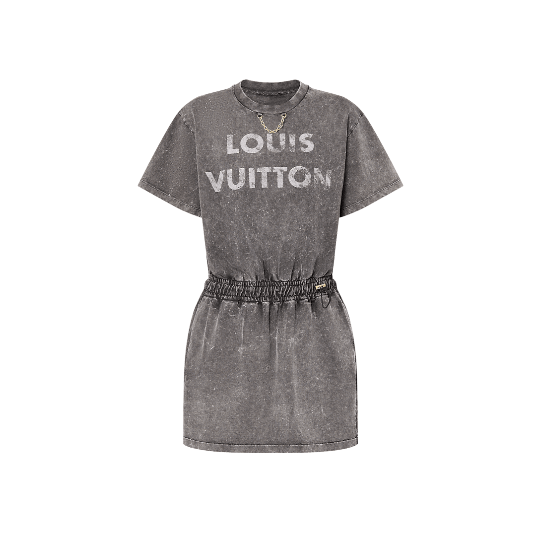 This T-shirt dress has easy everyday appeal in comfortable cotton jersey finished with a casual overdyed effect. A faded Louis Vuitton print on the chest underscores the laidback, vintage vibe. The elasticated waist can be adjusted with a leather drawstring and the neckline is embellished with a signature LV chain detail for a final House touch.