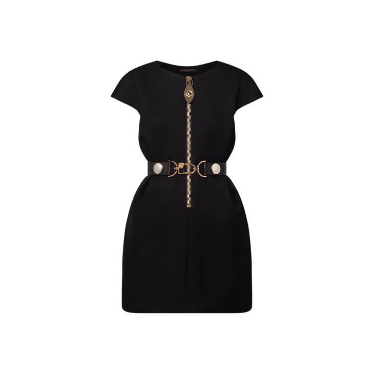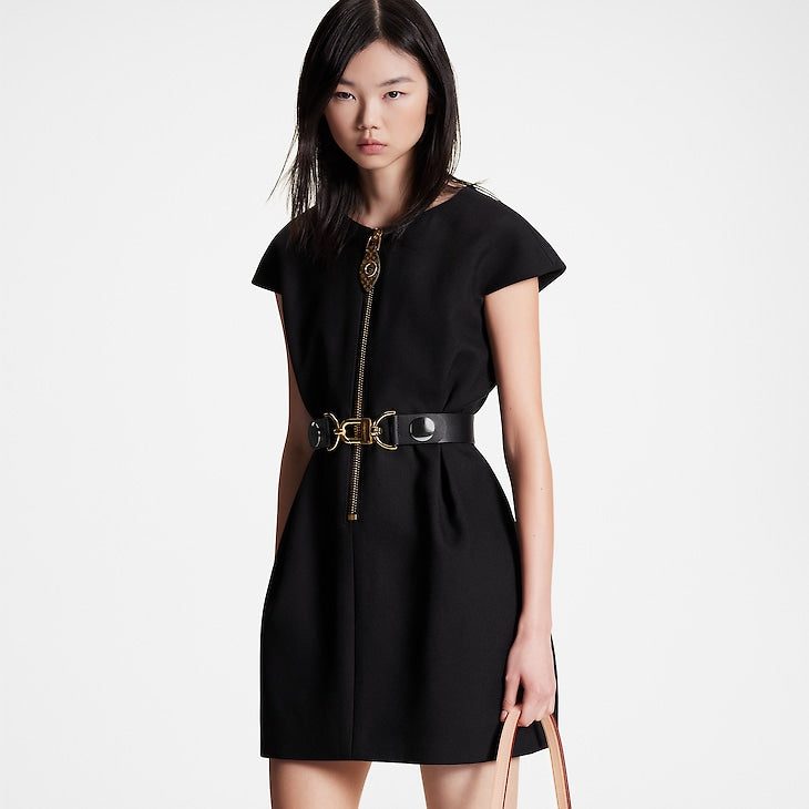 This little black dress is tailored from structured double face wool for an effortlessly elegant look. The silhouette has an understated retro feel with chic cap sleeves and four smart pleats around the tapered waistline creating feminine volume. An exposed XXL zipper adds a contemporary touch to the front, complemented by this season’s chunky buckle belt.