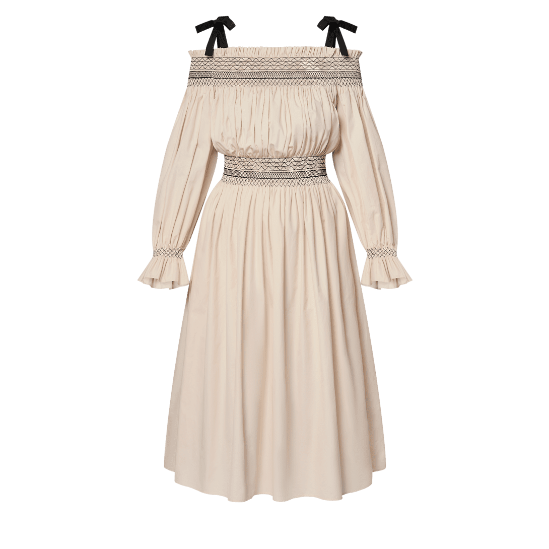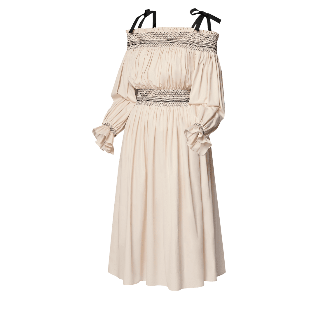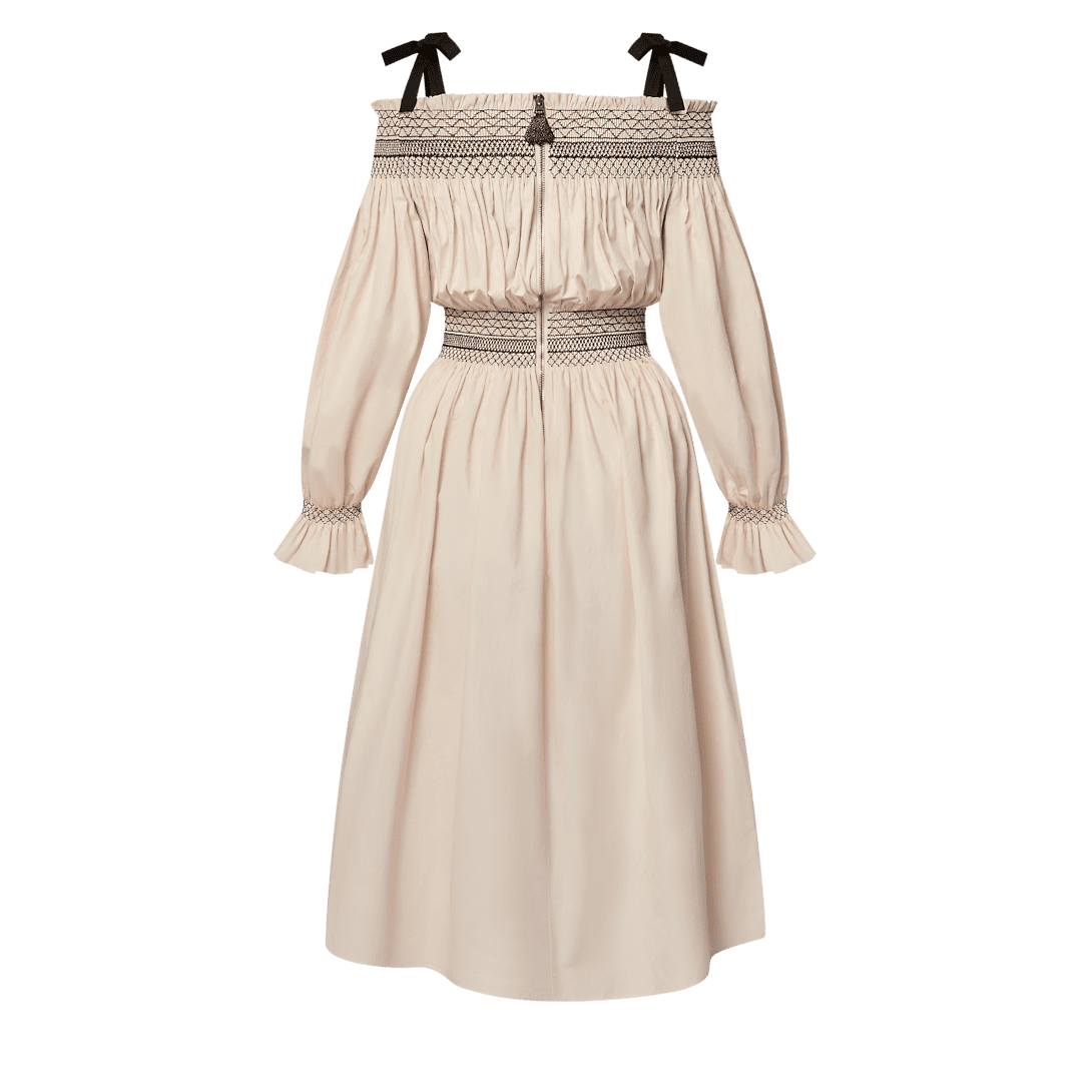 This dress has effortless romantic appeal in an off-the-shoulder maxi silhouette crafted from lightweight linen. The shoulders, waistline and cuffs are gathered for added volume, while contrasting embroidery introduces a graphic accent. Complete with chic black self-tie straps and an exposed back zipper trimmed with a Monogram canvas pull for a subtle signature touch.