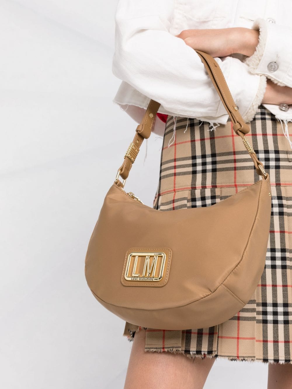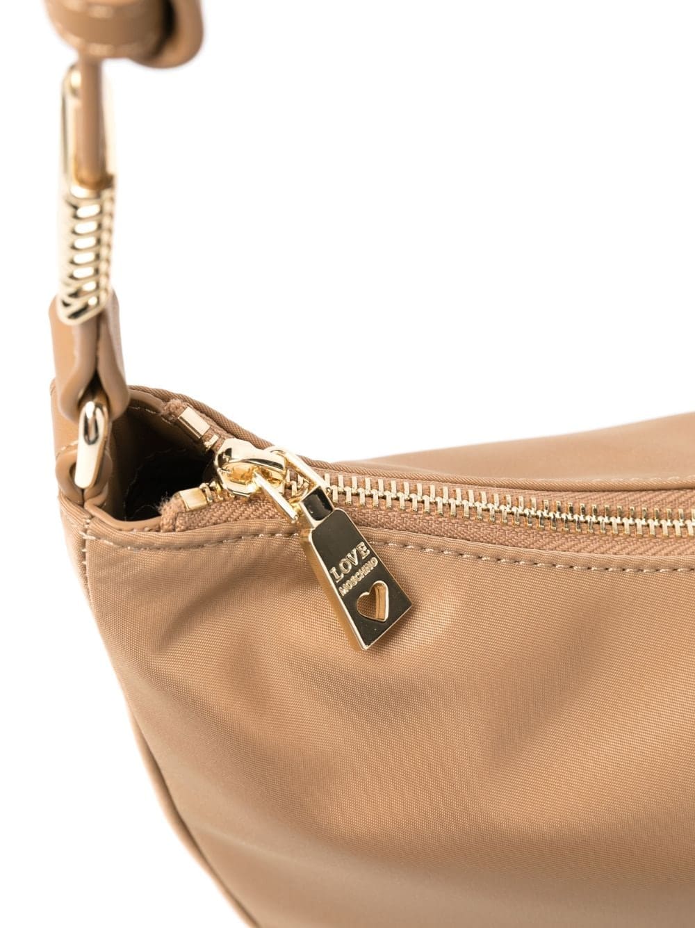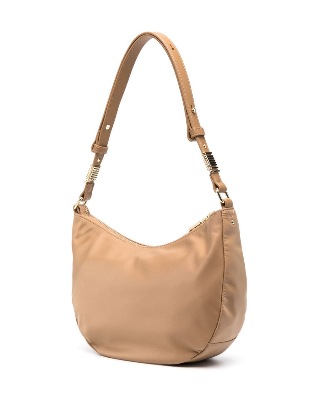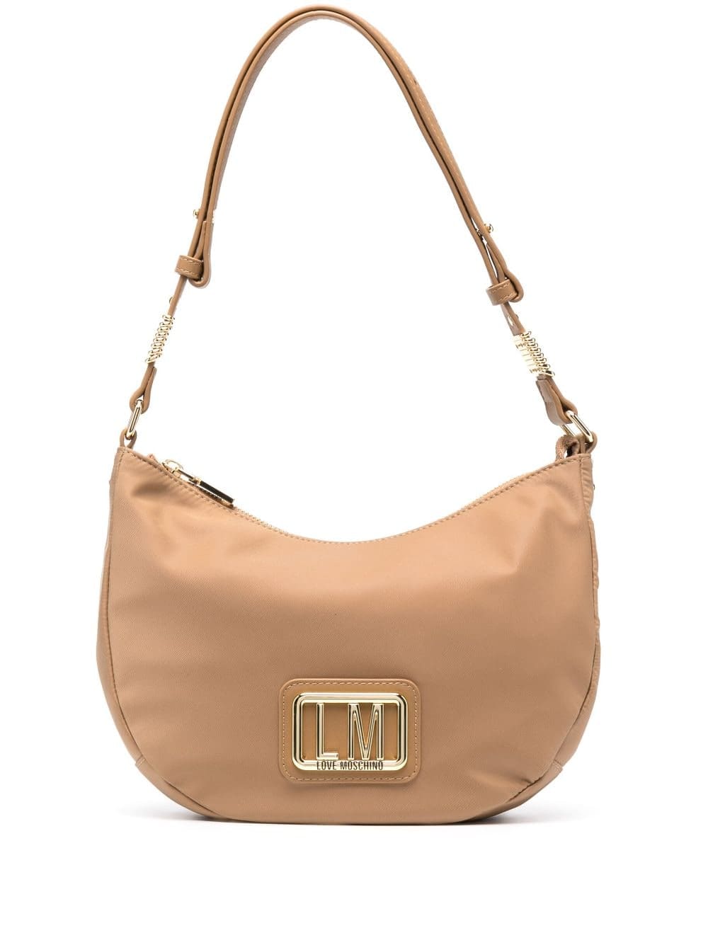 beige logo lettering curved hem adjustable shoulder strap top zip fastening