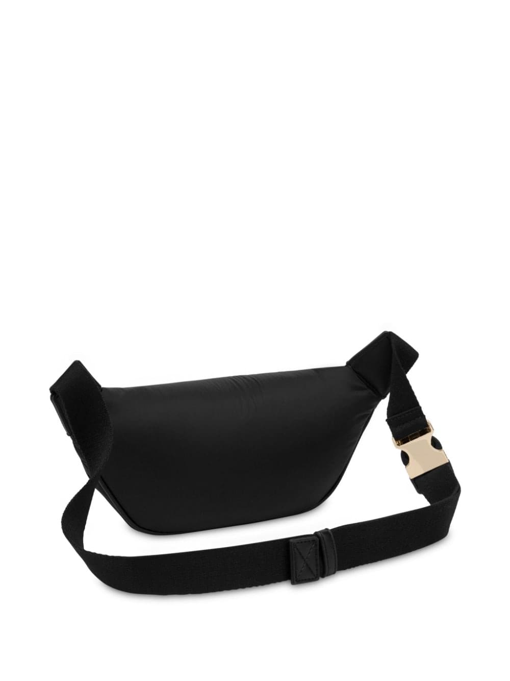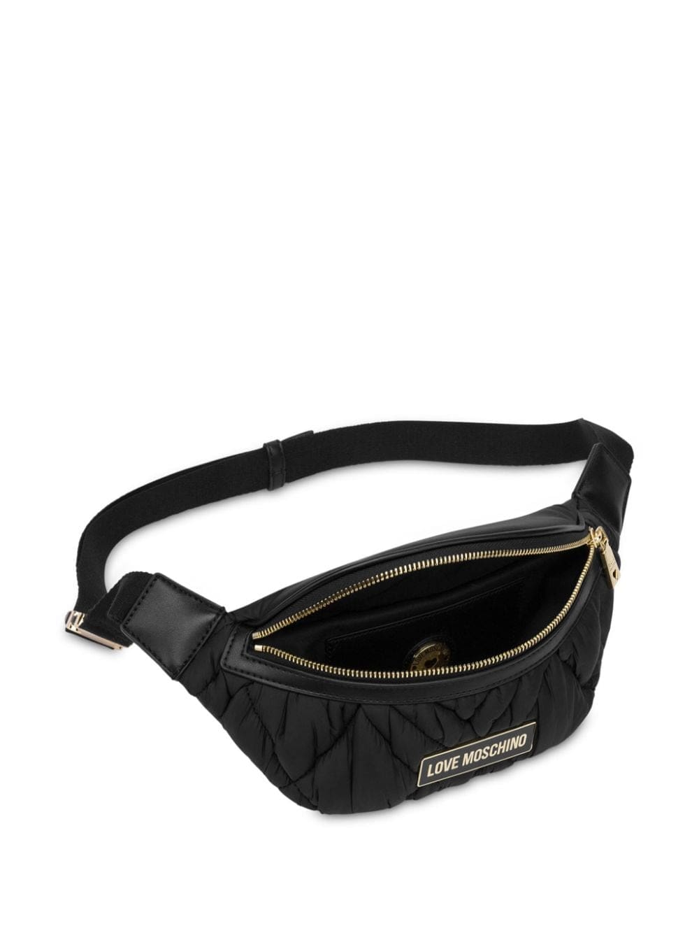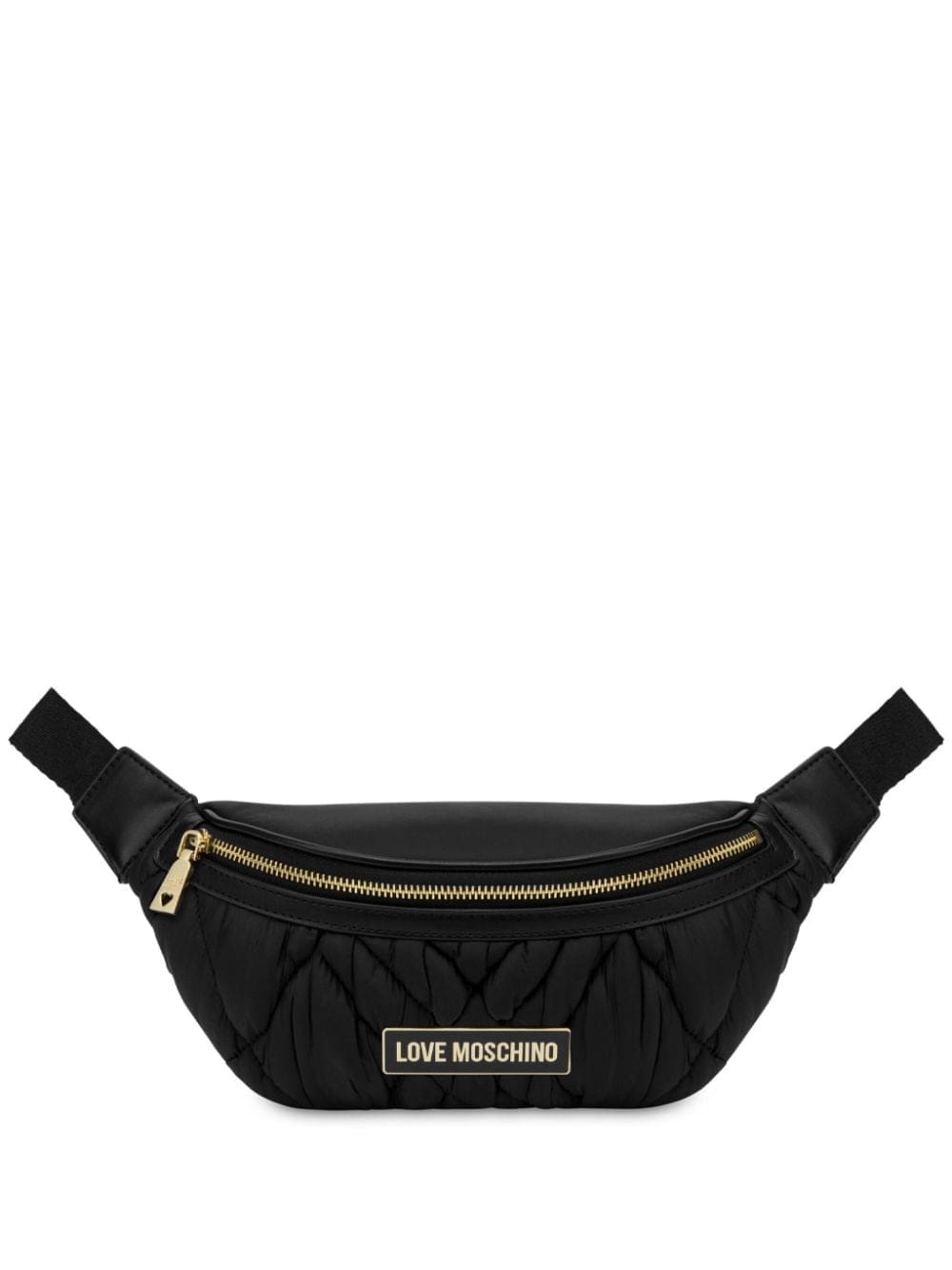 A gold-tone 'Love Moschino' logo plaque adorns this black belt bag. The accessory is crafted from faux leather featuring a gold-tone hardware.