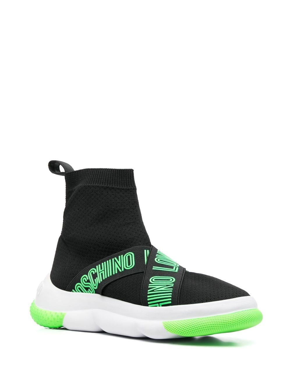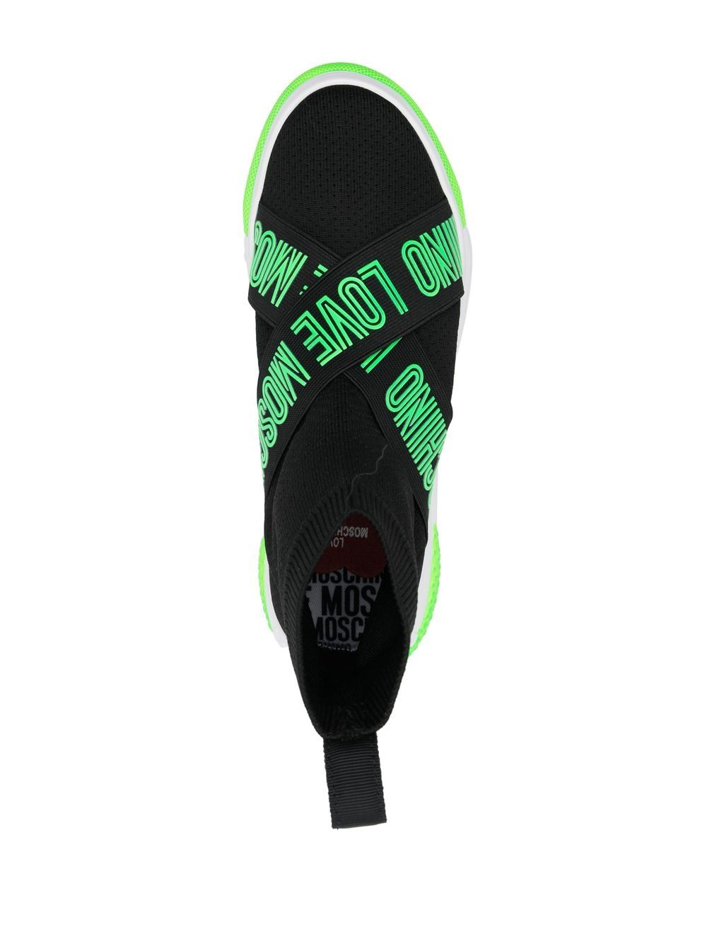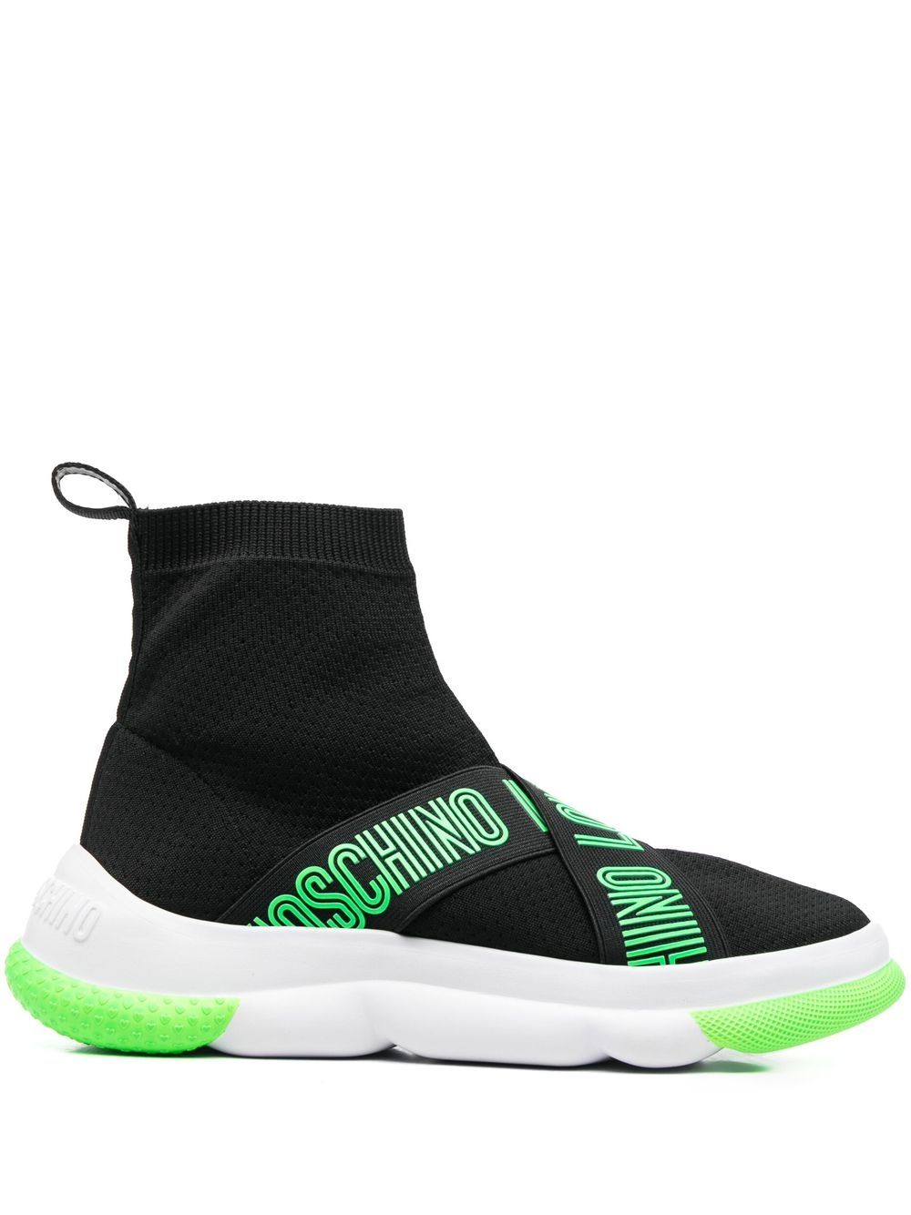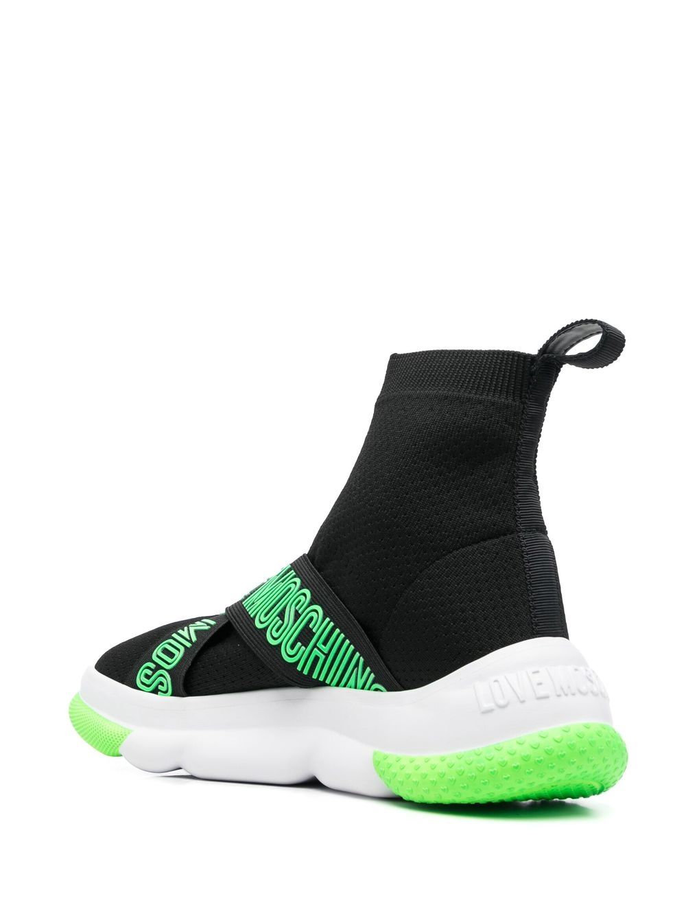 logo-strap high-top sneakers from LOVE MOSCHINO featuring black, logo-print strap, ribbed detailing, round toe, ankle-length, pull-tab at the heel, branded insole and ridged rubber sole.