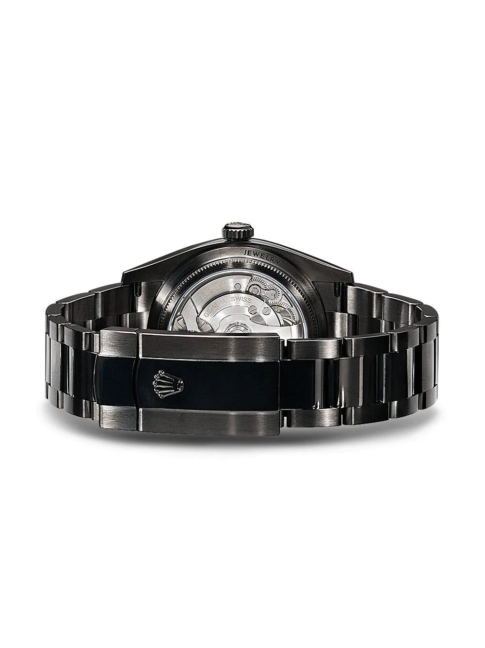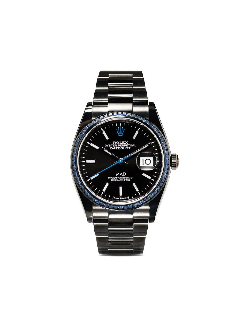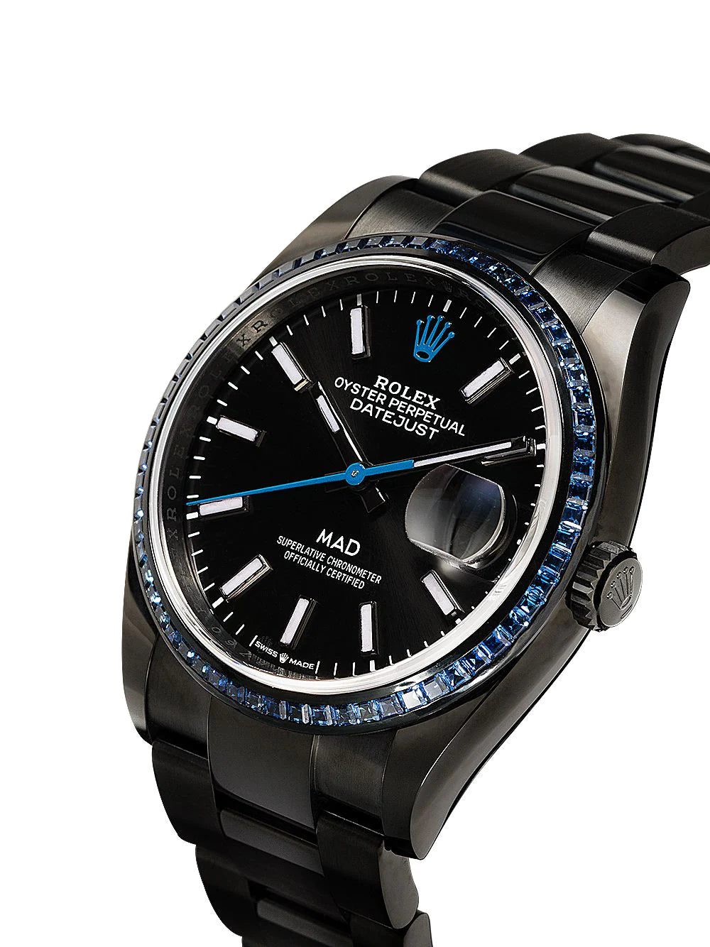 MAD Paris was born out of a passion for creating emblematic timepieces. The independent watch customisation company revisits classic models from the most successful horological brands, resulting in something entirely unique. Manufactured in Switzerland from black DLC steel with a matte finish, this reimagined pre-owned Rolex Datejust 36mm is from their MAD series. Finished with a row of sparkling blue sapphire, this sleek timepiece is sure to become a statement piece.
