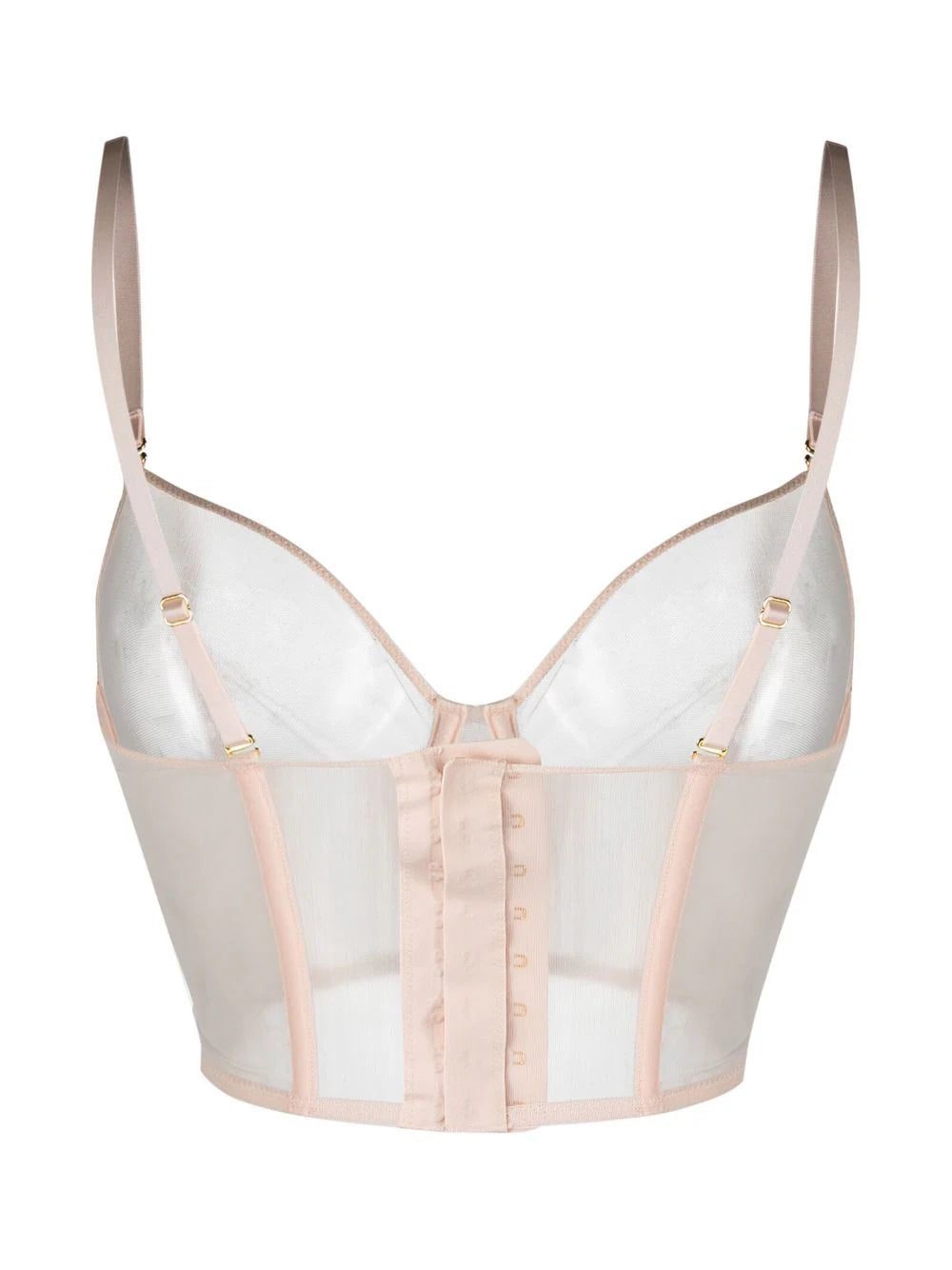 L'Amoureuse Soutien Gorge bustier bra from MAISON CLOSE featuring peony, mesh panelling, sheer, underwire cup, long length, rear hook and eye fastening and adjustable shoulder straps. Just a reminder that this piece must be tried on over your own garments..