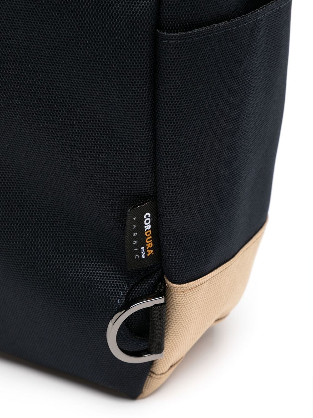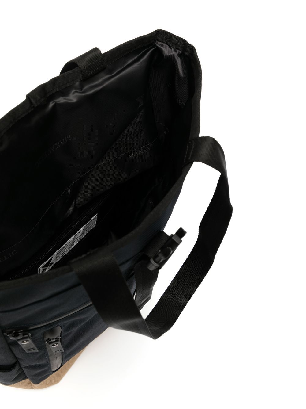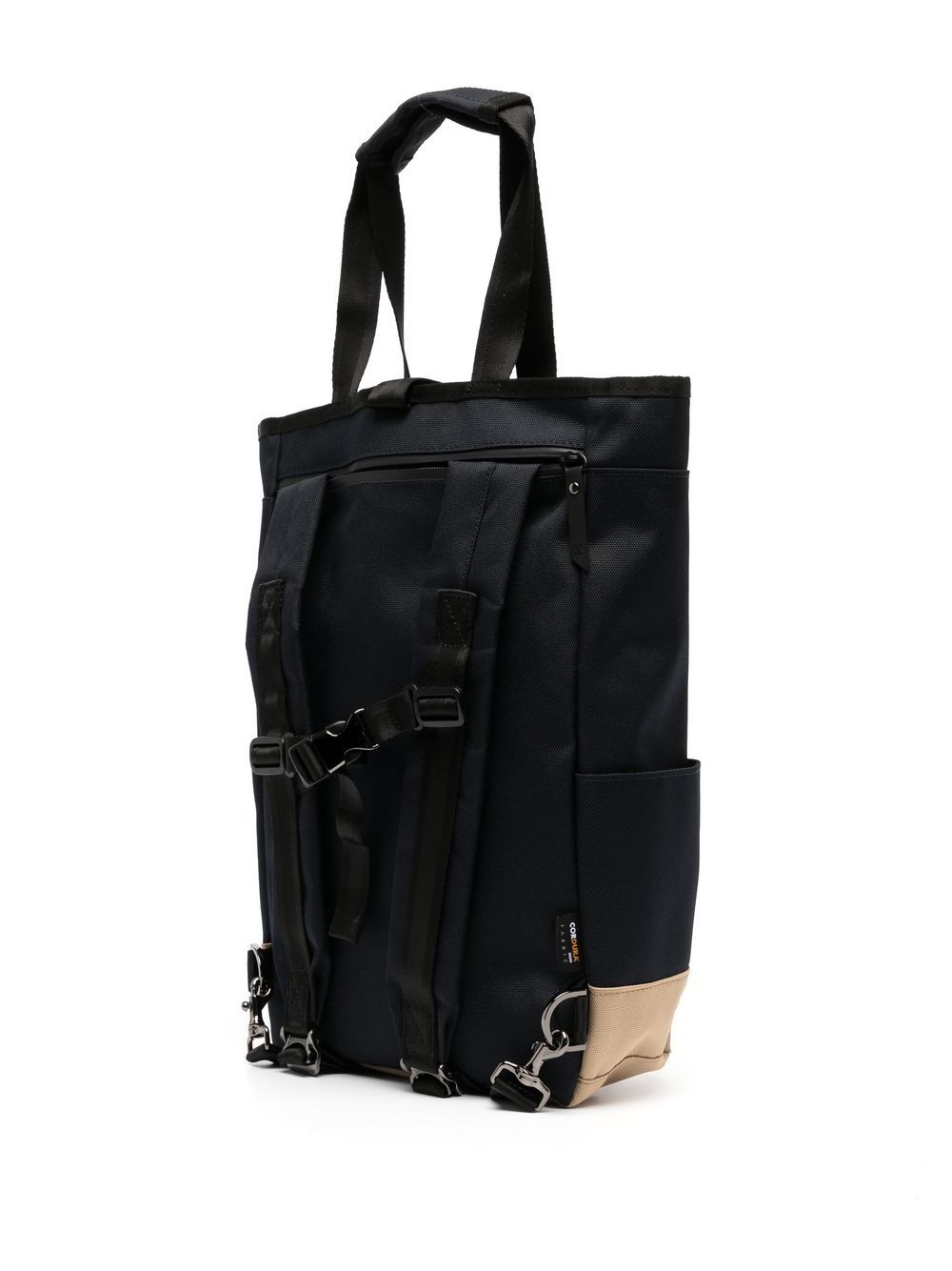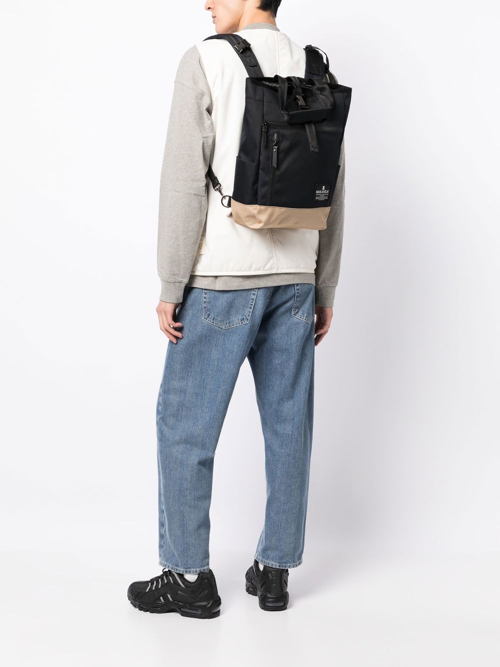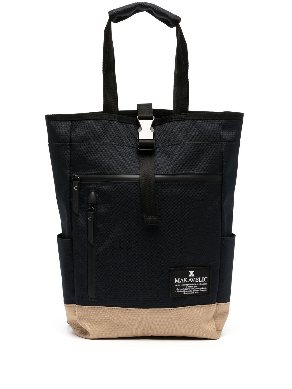 black beige contrasting panel detail logo patch to the front front zip fastening pockets slip pockets to the sides buckle fastening main compartment single flat top handle two adjustable shoulder straps