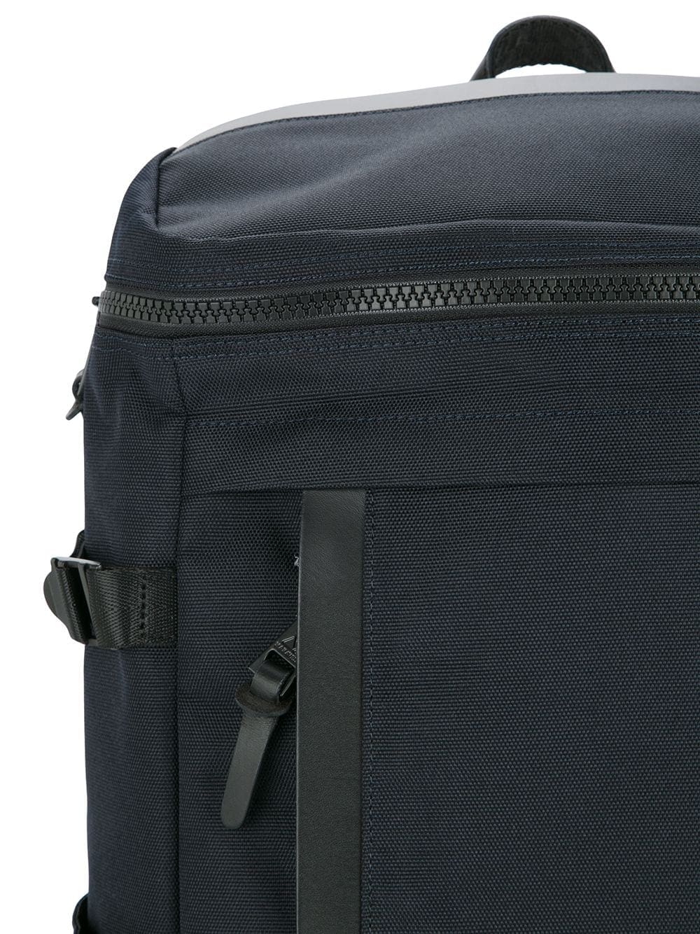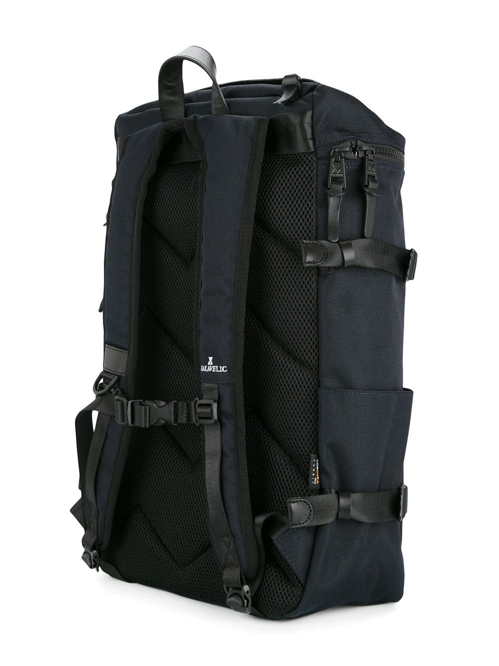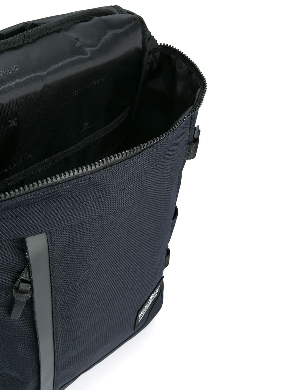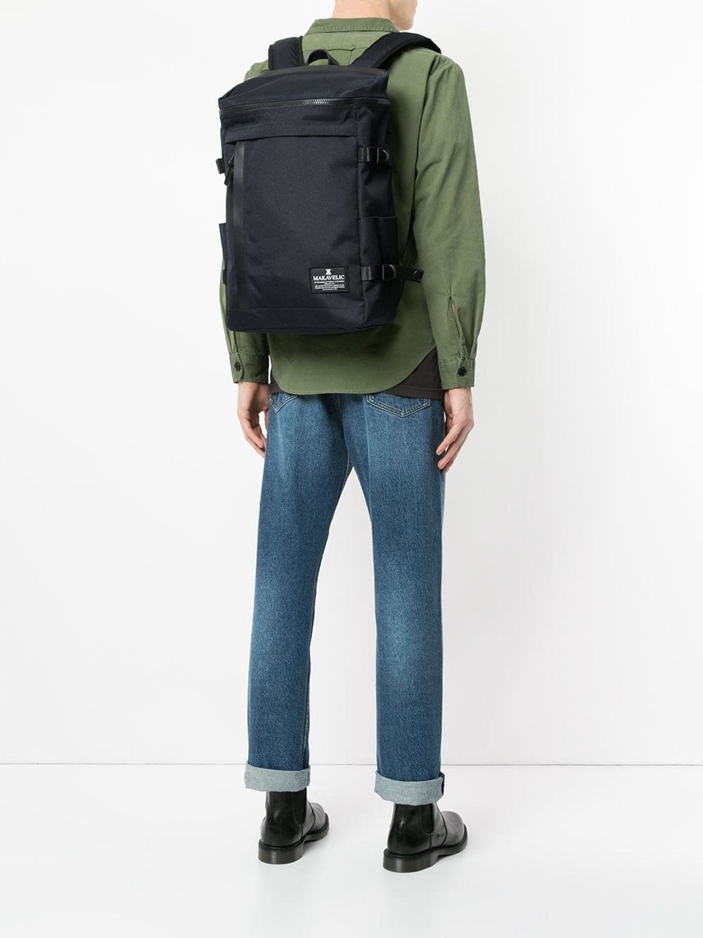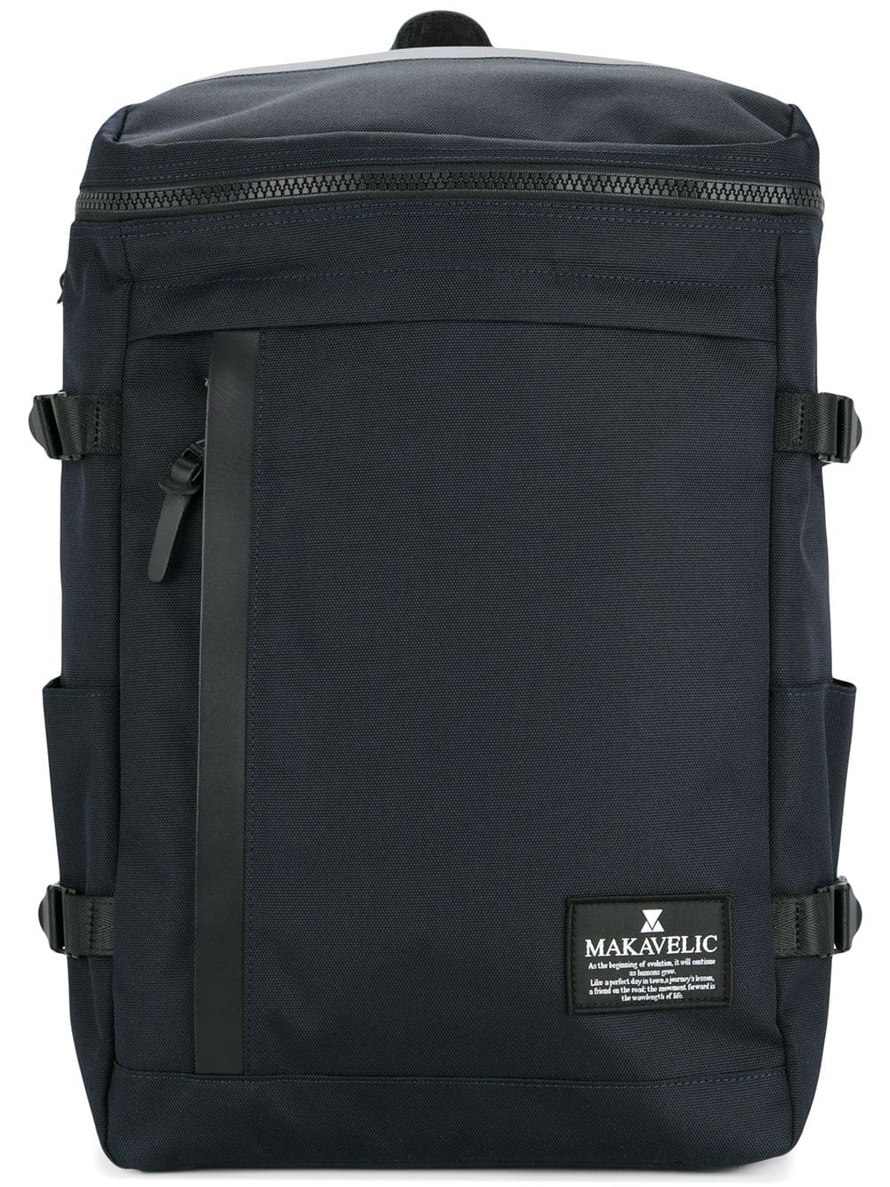 Navy rectangle backpack from MAKAVELIC featuring a top handle, a foldover top, a two way zip fastening, a front zip fastening, a front logo patch and adjustable shoulder straps.