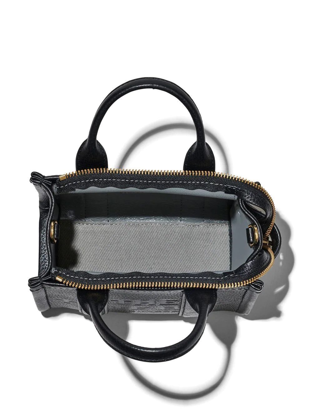 micro The Leather tote bag from Marc Jacobs featuring black, leather, grained texture, debossed logo to the front, logo patch to the rear, two top handles, adjustable detachable shoulder strap, single flat side handle, top zip fastening and main compartment.