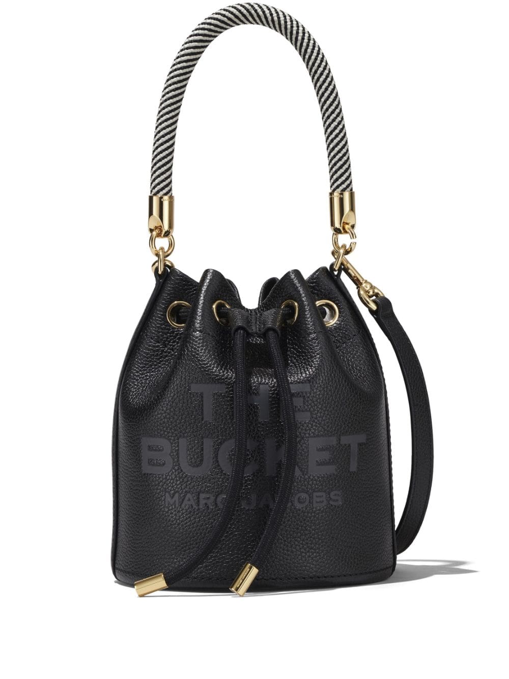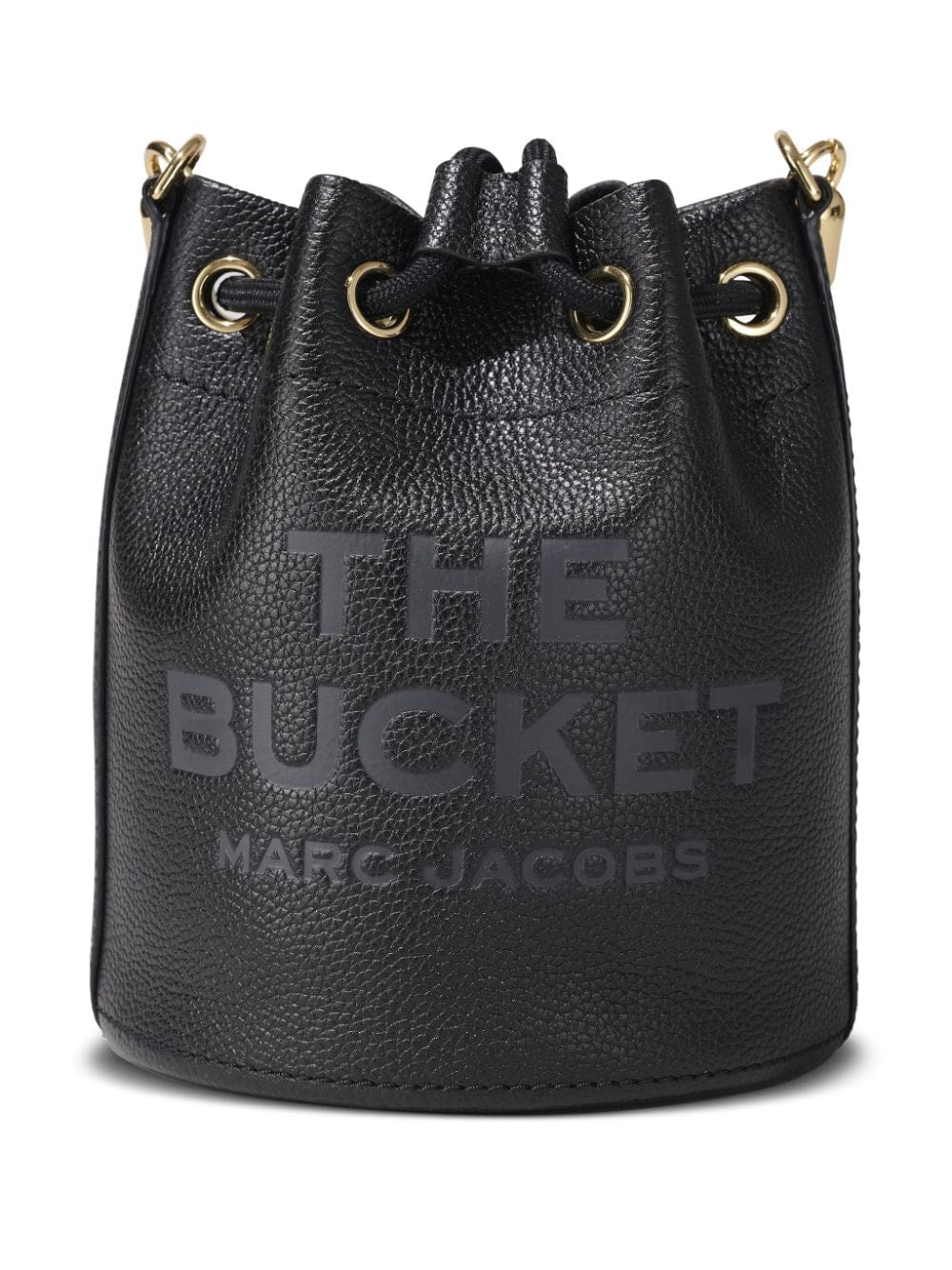 black leather grained texture slogan print drawstring fastening main compartment single rounded top handle adjustable detachable shoulder strap