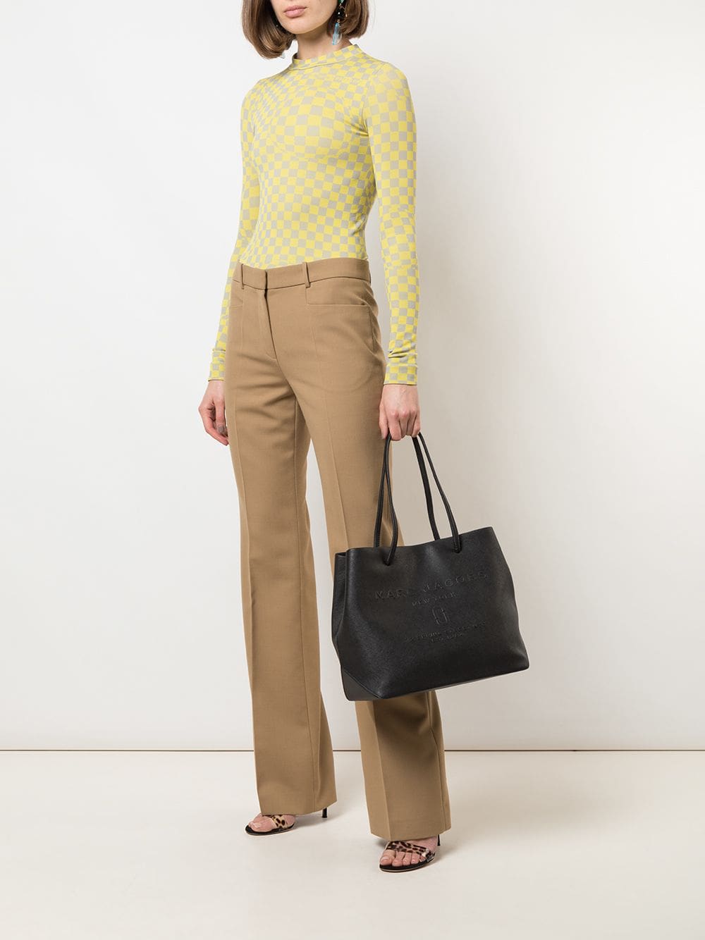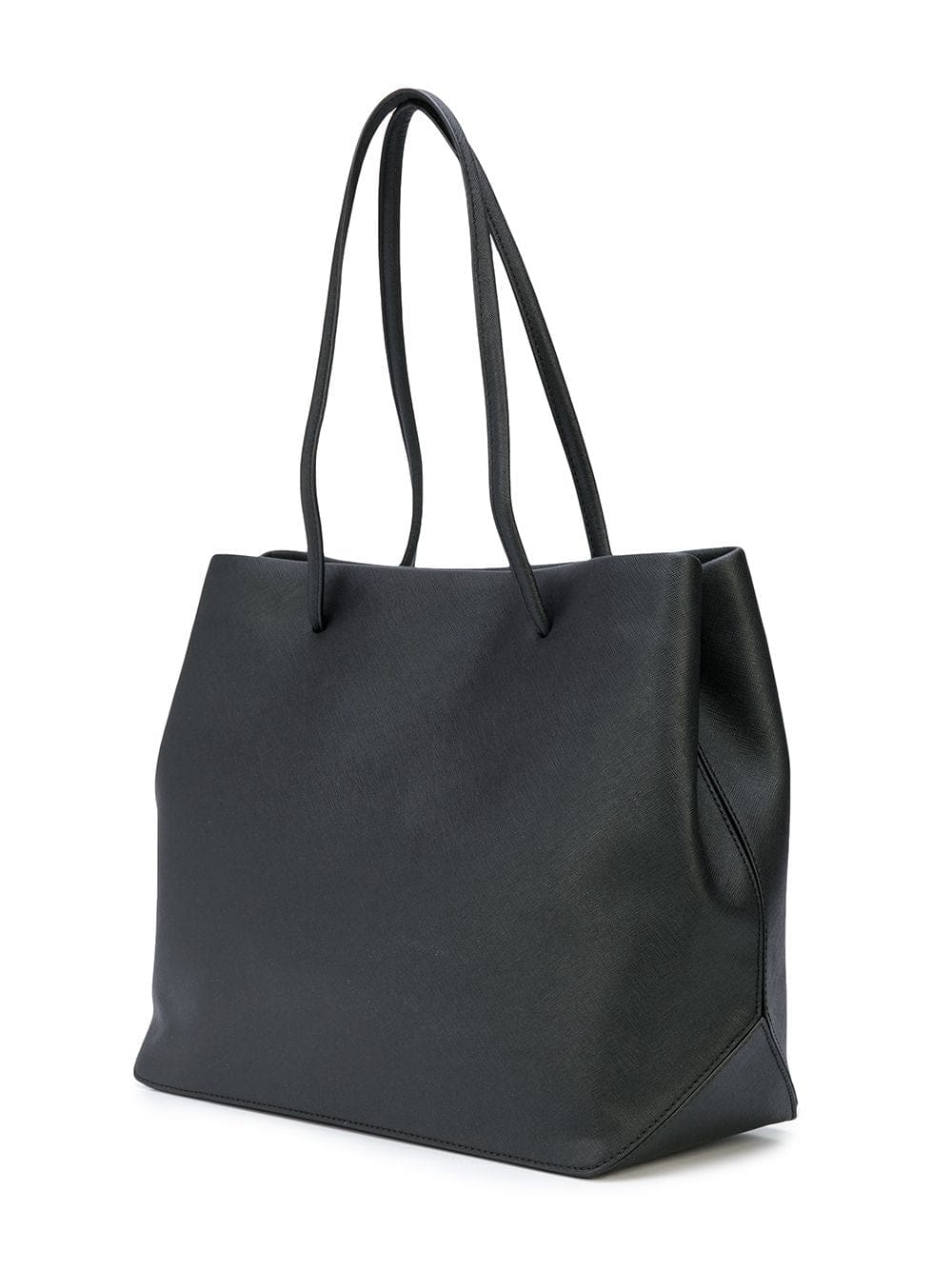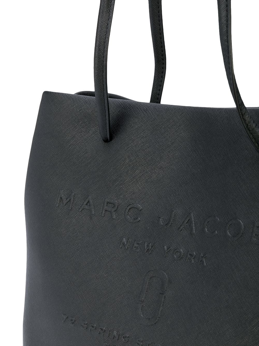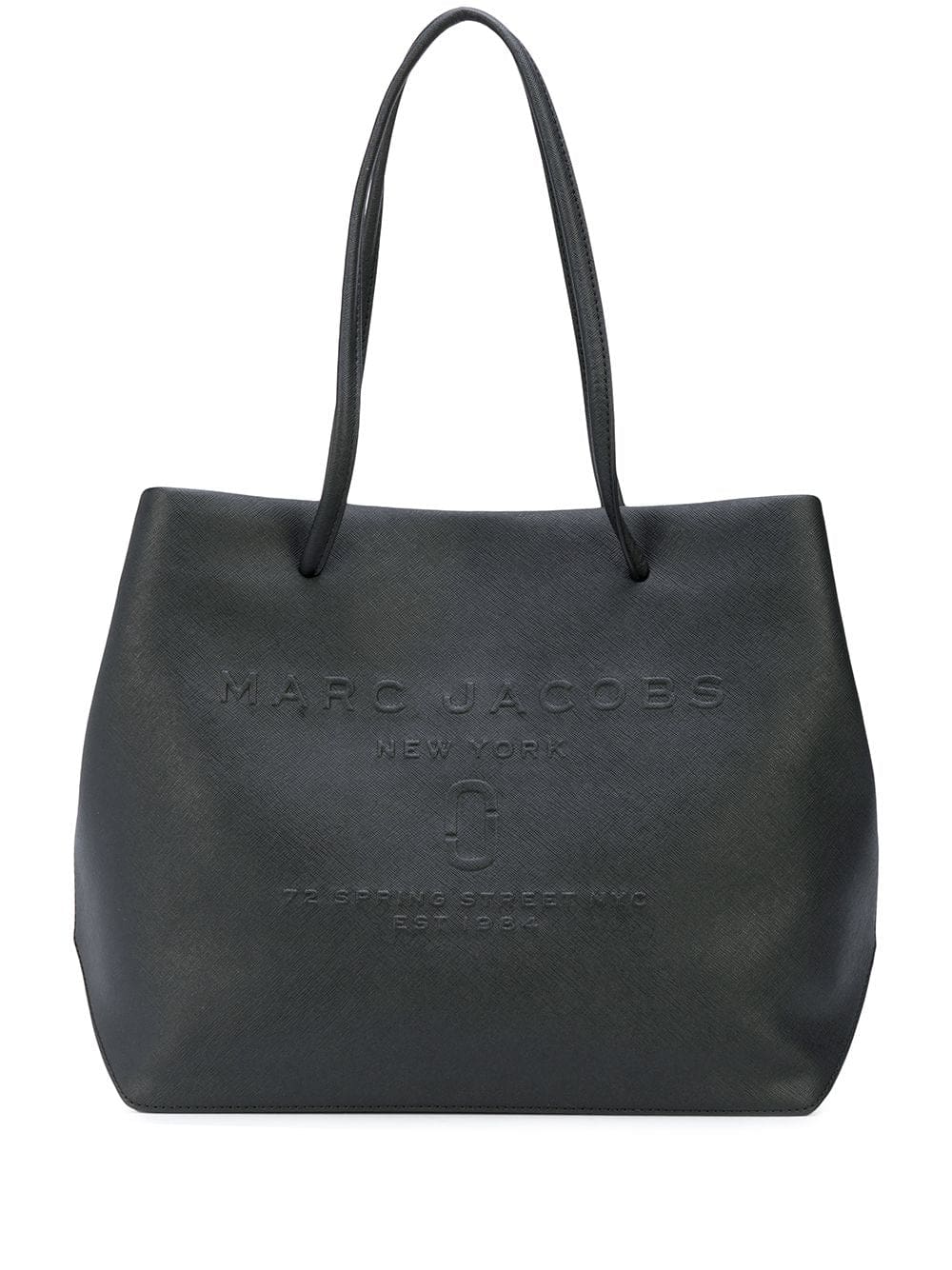 Black calf leather East-West logo shopper tote from Marc Jacobs featuring top handles, a top magnetic closure and a front embossed logo stamp.