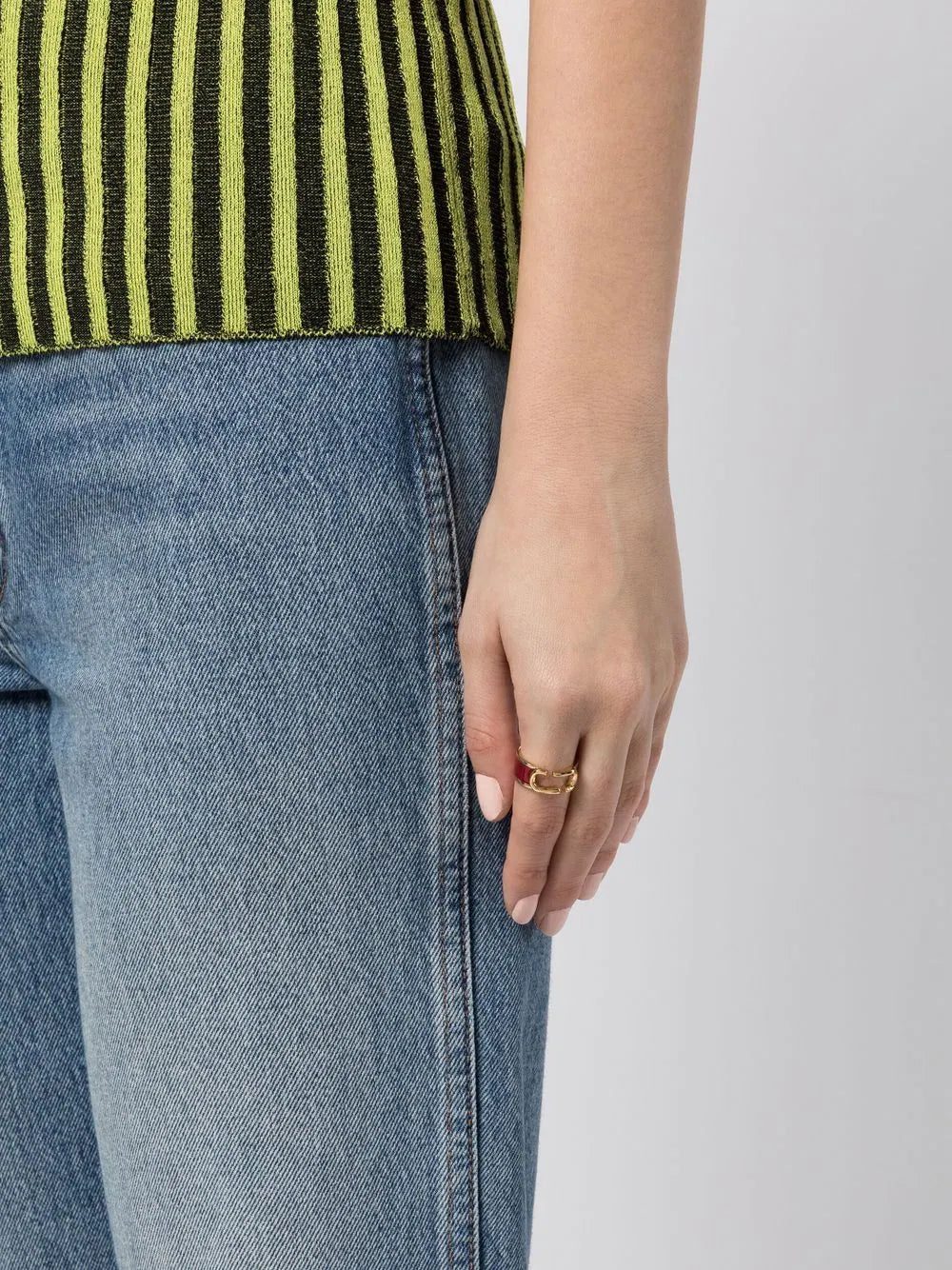 Marc Jacobs' ring spotlights the brand's oval-shaped logo plaque. The gleaming gold-tone hardware pops against the fiery red resin.