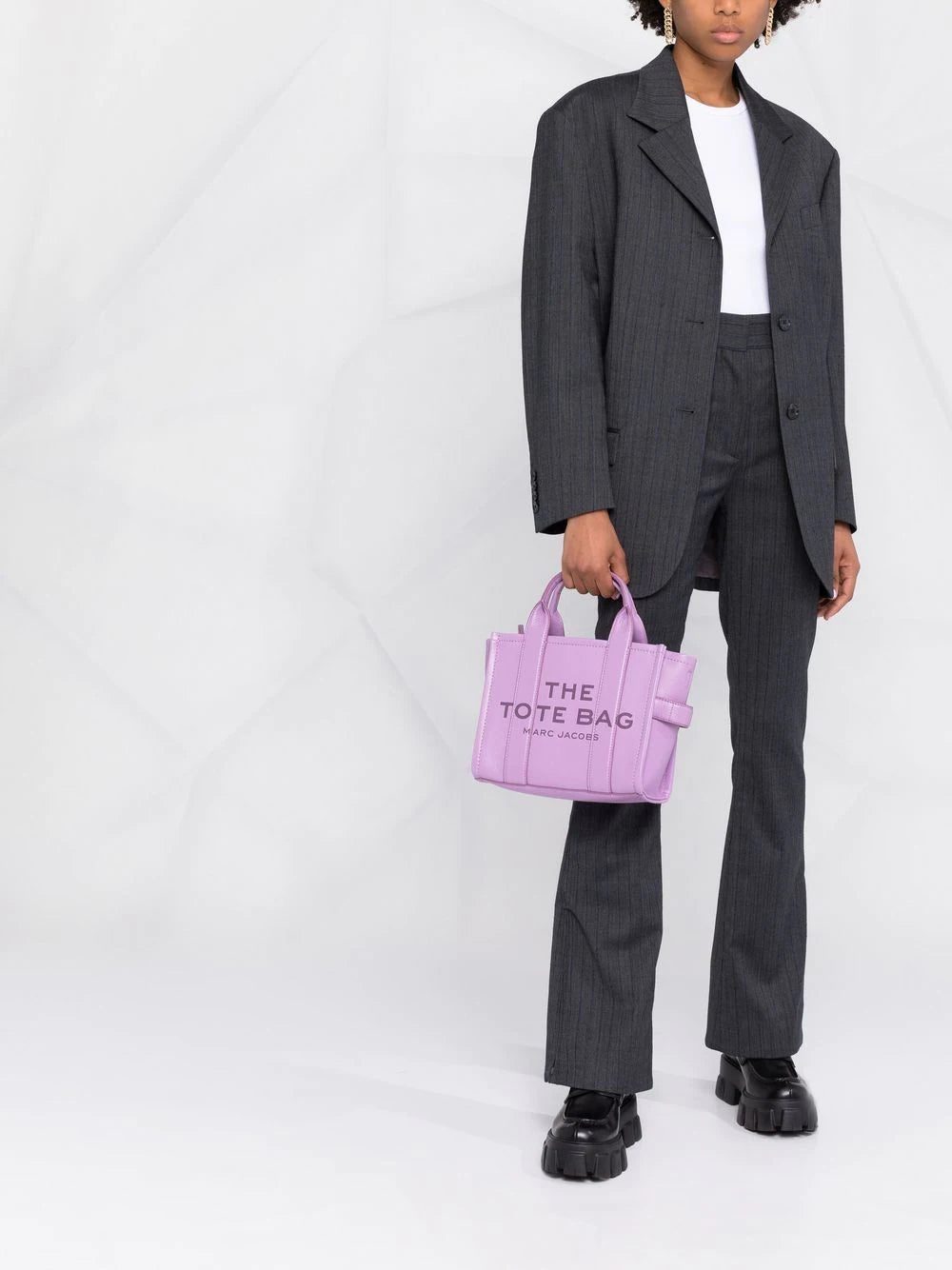 Marc Jacobs incorporates literal wording into his latest accessories release. This bag is presented in purple grained leather, printed with the words 'The Tote Bag' alongside logo lettering on the front.