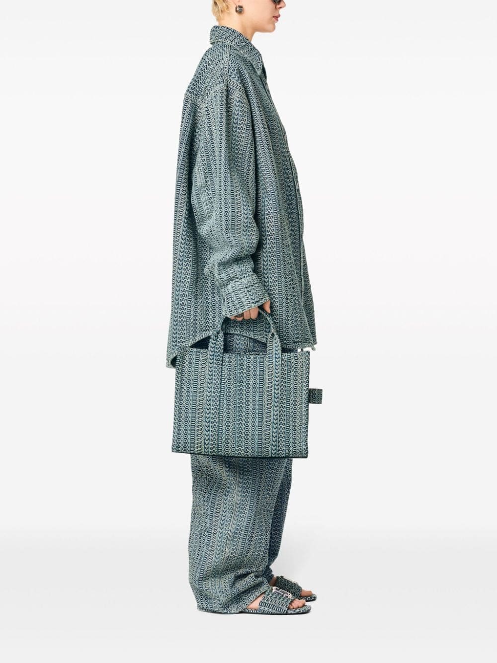 Designed with a cotton denim construction, this medium The Monogram Tote bag from Marc Jacobs is embellished with a logo patch on the front. The blue-hued accessory is topped with two handles and a detachable shoulder strap.