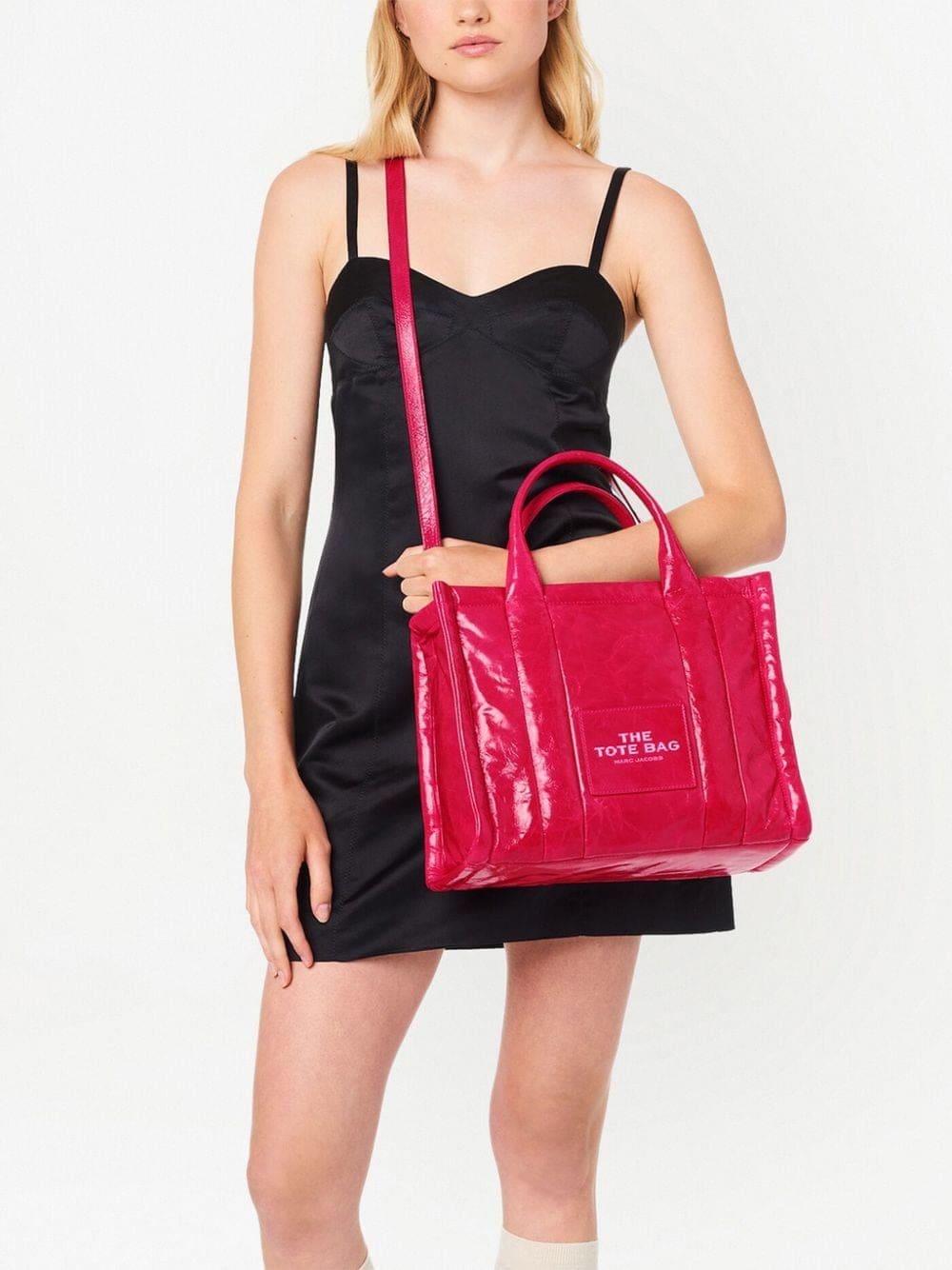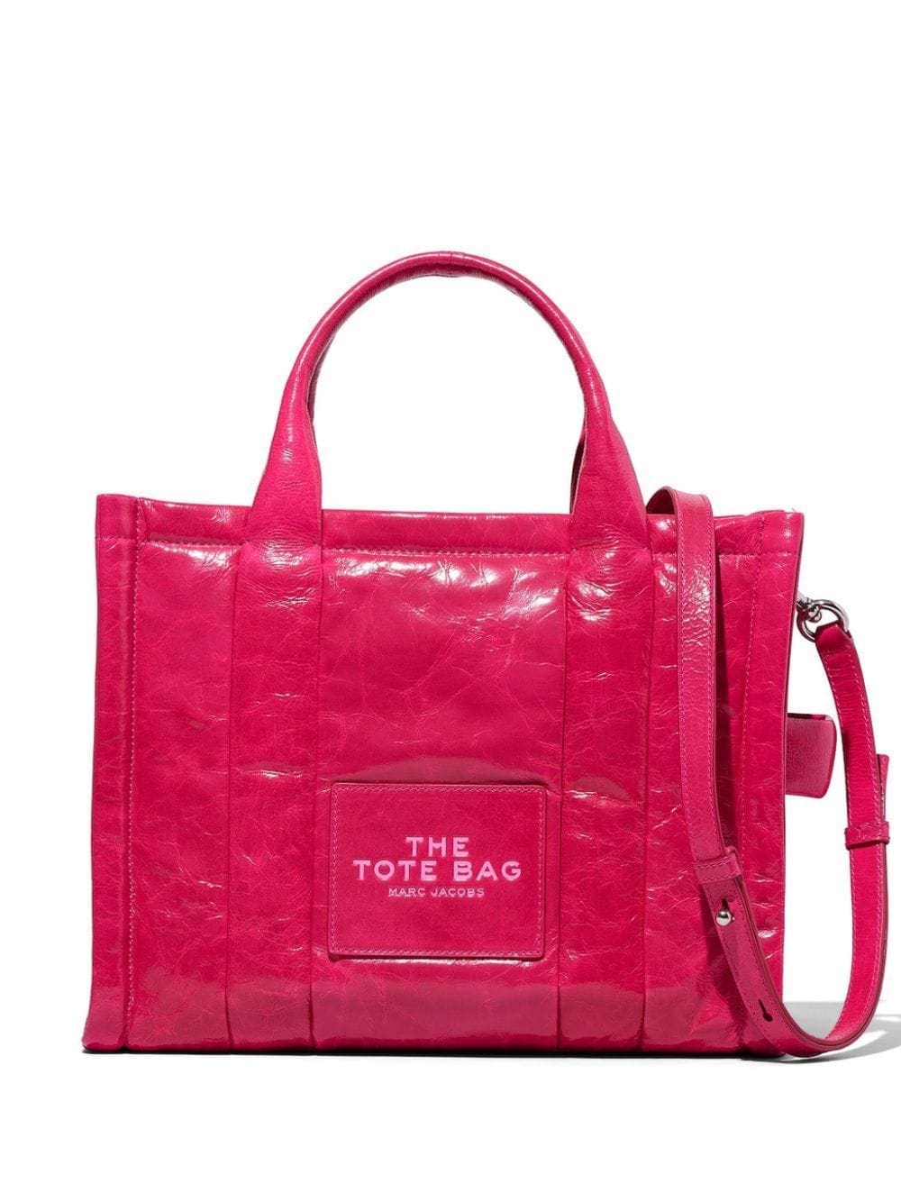 hot pink leather crinkled finish logo patch to the front two rounded top handles single rounded handle to the side adjustable detachable shoulder strap main compartment top zip fastening internal zip-fastening pocket