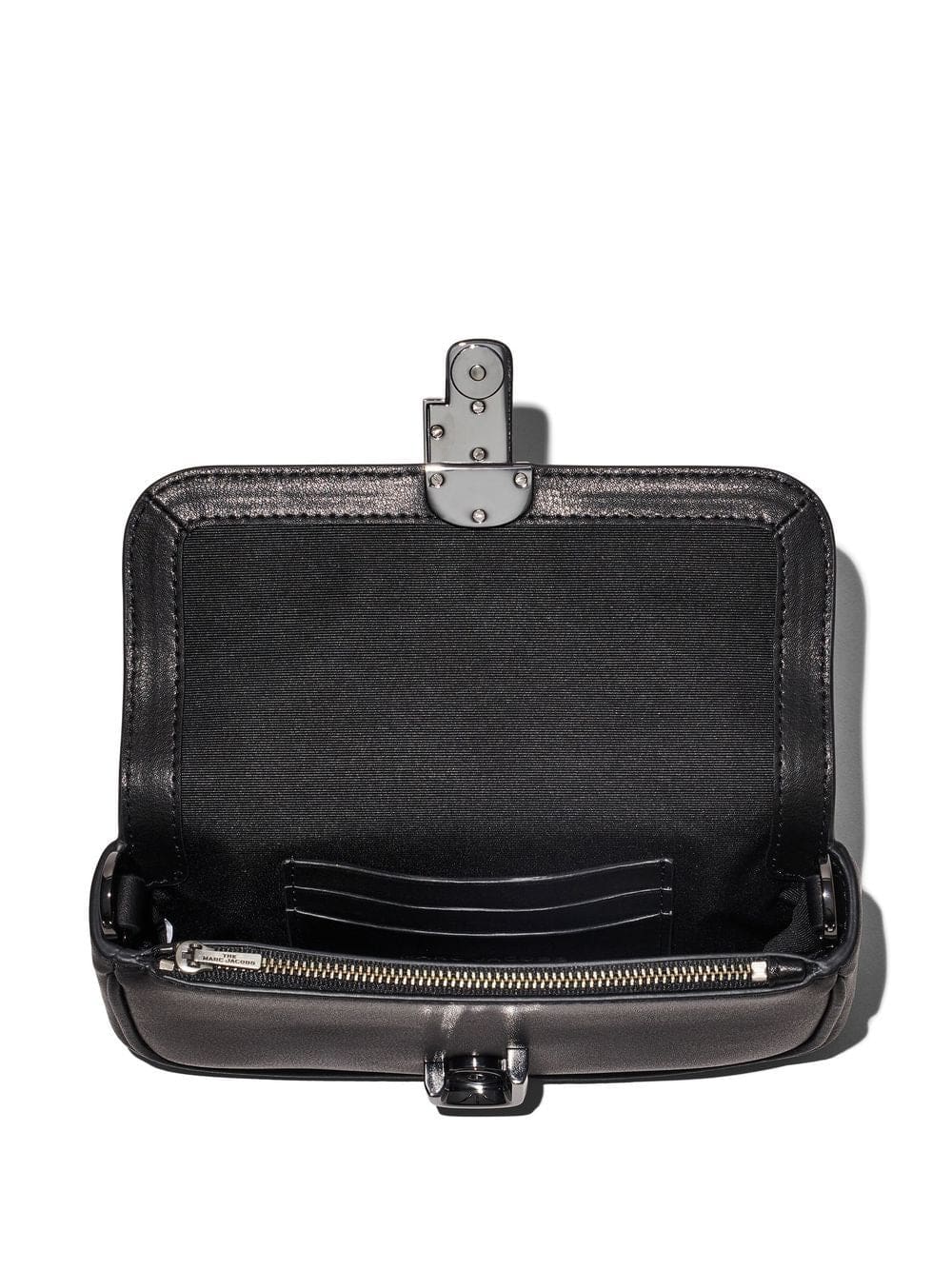 black leather silver-tone logo plaque silver-tone logo lettering two detachable leather and chain-link shoulder straps foldover top with magnetic fastening silver-tone hardware main compartment internal zip-fastening pocket internal card slots