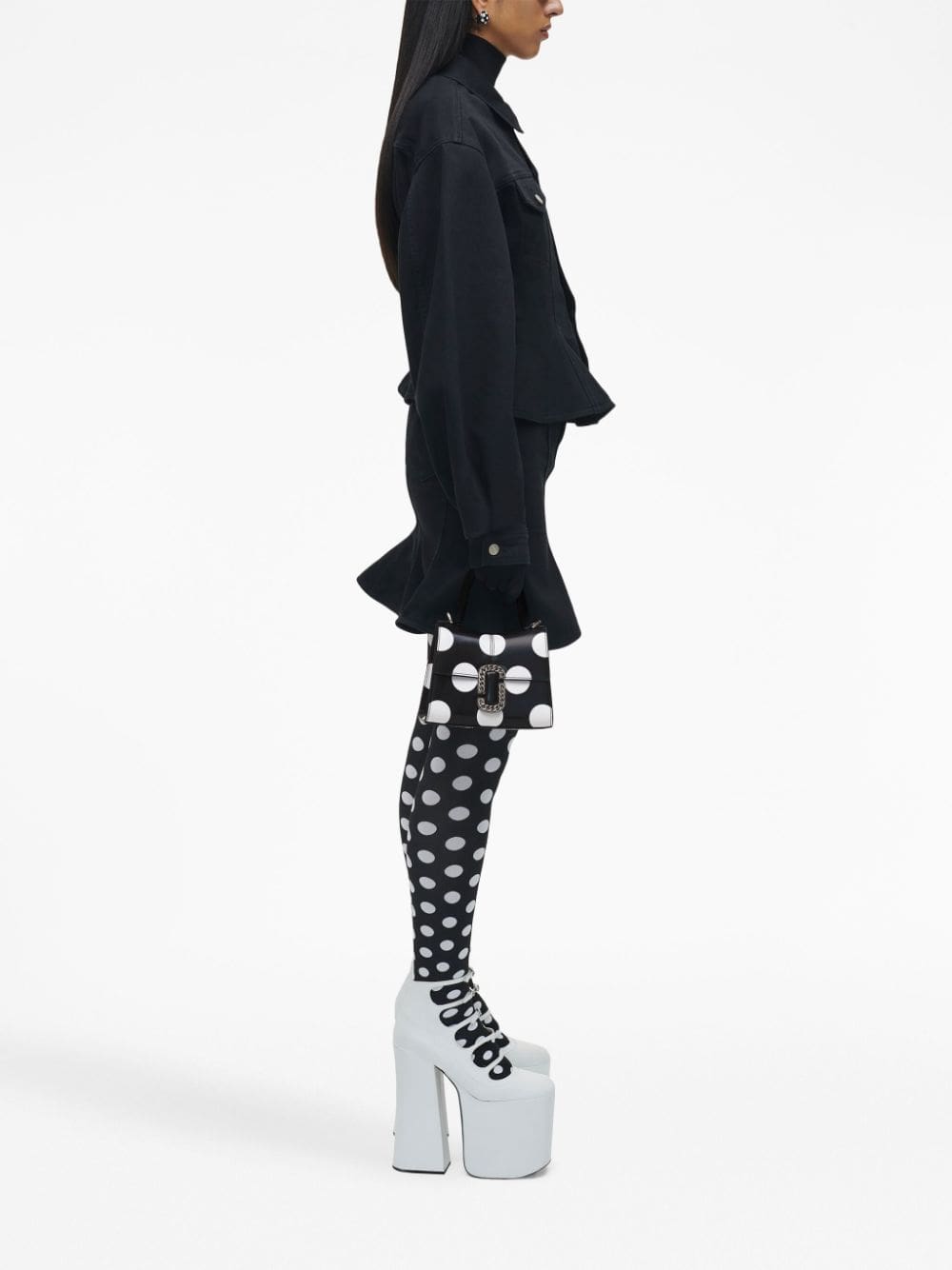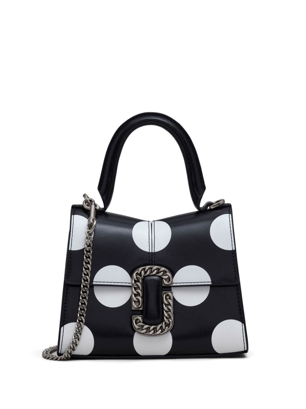 Designed in an 'M' shape and adorned with a chain-link 'J' clasp, The St. Marc mini bag embodies Marc Jacobs' sophisticated branding. Its trapeze silhouette is elevated by the seasonal polka dot print, while a detachable shoulder strap adds a convenient touch.